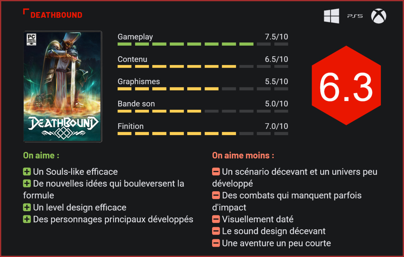 Premier jeu d’un studio brésilien, Deathbound est un nouveau Souls-like comme il y en a beaucoup depuis quelques années. Cette nouvelle production se démarque-t-elle de la concurrence ? Elle propose en tout cas quelques idées originales. L’équipe brésilienne Trialforge Studio propose leur première production depuis peu. Deathbound est un Action-RPG inspiré des Souls qui tente de nouvelles choses. Si les jeux du genre sont désormais nombreux sur le marché, le sujet qui nous intéresse promet de nous faire jouer à un Souls-like où nous incarnons plusieurs personnages différents. L’univers de Deathbound est un mélange particulier entre un contexte contemporain et de la fantasy plus classique à base de chevaliers et de magie. Dans ce monde ou la société s’effondre, deux clans s’opposent, l’un basé sur la foi et l’autre sur la science. L’Église vénère la déesse de la mort et est en conflit avec les membres du culte de la vie qui, eux, cherchent à obtenir la vie éternelle grâce à la technologie. Si nous incarnons dans un premier temps Thérone, un chevalier fidèle à l’Église, ce dernier va bien vite mourir. Pour des raisons mystérieuses, son essence va rester dans le monde des vivants et il va devoir partager son existence avec d’autres âmes. L’univers mélange des décors contemporains à de la fantasy plus classique. Surprenamment, le titre se montre très porté sur le scénario, en proposant régulièrement des passages scriptés et emplis de narration tout au long de l’aventure. Chacun des personnages que nous allons incarner est développé à travers des souvenirs. Peu de nos protagonistes sont malheureusement très mémorables, il en va de même pour le scénario qui se révèle plutôt décevant sur le long terme et pour son univers qui manque parfois de détails pour pouvoir s’y investir pleinement. Deathbound est donc un Souls-like comme on en voit souvent. Nous retrouvons alors un jeu de type Action-RPG qui s’inspire des productions de From Software en reprenant quelques mécaniques désormais habituelles du genre. Un gameplay au rythme lent, une difficulté souvent relevée, un système d’expérience qui laisse notre butin à l’endroit de notre mort… Les poncifs du genre sont bien présents, même si Deathbound propose quelques idées originales qui apportent un peu de frais à l’expérience. L’expérience “Souls” est bouleversée par de nouvelles idées. Comme expliqué plus tôt, nous n’incarnons pas qu’un seul personnage mais bien l’essence de plusieurs individus. Les sept protagonistes du jeu se débloquent au fil de l’aventure et servent ensuite à former une équipe de quatre, nous pouvons alors alterner entre chacun d’entre eux quand bon nous semble, même en plein combat. Les membres de notre équipe possèdent évidemment des capacités propres et un gameplay qui s’inspire des différentes classes habituelles de ce genre de titres (chevalier, assassin, mage…). Chaque protagoniste possède également sa propre barre de vie indépendante des autres, mais il suffit que l’un des quatre personnages meurt pour que nous soyons renvoyés vers le dernier point de sauvegarde, appelés ici les Phylactères. À noter que la barre de vie et d’endurance sont aussi entièrement liées, puisque perdre de la vie signifie également une diminution de notre endurance maximale. Plusieurs autres mécaniques s’ajoutent à ce système pour nous forcer à alterner très souvent entre les personnages et à varier nos approches. Combattre permet de faire regagner un peu de vie à nos équipiers en réserve, mais le plus important reste l’utilisation de la jauge de synchronisation. Cette dernière se remplit en combattant et peut être dépensée en réalisant différentes actions en changeant de personnages. Alterner juste après une attaque permet d’enchaîner directement notre assaut avec le personnage choisi, ou de réaliser une attaque plus puissante si la barre de synchronisation est assez remplie. Cet outil fonctionne également avec les esquives, qui ne coûteront ainsi aucune endurance. Force est de constater que les membres de Trialforge Studio ont bien réfléchi leur concept et que le résultat est très convaincant. Les sensations de jeu sont bonnes, même si les combats peuvent parfois manquer d’impact. Il faut évidemment se frotter à des boss agressifs. Deathbound propose également plusieurs mécaniques de RPG plus classiques, avec un système de niveau permettant d’améliorer nos stats via un arbre de compétence, des attributs passifs déblocables sur chacun de nos personnages, ainsi que l’amélioration de pièces d’équipement. Le placement des quatre personnages dans notre équipe a aussi son importance puisque placer des individus aux idéologies concordantes apporte des bonus, et inversement. Malgré ces nombreux systèmes qui peuvent aider, le titre reste assez corsé, même s’il ne posera pas trop de problèmes aux habitués du genre. Son level design efficace est assez linéaire malgré de petits passages optionnels à visiter un peu partout. Si son gameplay est convaincant, c’est un peu moins le cas de ses visuels. Les décors ne s’en sortent pas trop mal mais ces derniers ne marquent pas outre mesure, tandis que les personnages et les cinématiques sont clairement datées. Il en va de même pour sa bande-son très oubliable et pour le sound design qui manque souvent d’impact. Deathbound manque peut-être d’une identité forte qui le rendrait mémorable puisque son scénario et son univers ne sont pas non plus inoubliables, et que son aventure se termine plutôt vite (comptez entre dix et quinze heures pour en voir le bout). Il n’en reste pas moins une bonne expérience pour le premier titre de ce studio, en particulier si vous cherchez un Souls-like qui propose des idées originales. Conclusion Les Souls-like sont nombreux et se ressemblent souvent, mais 