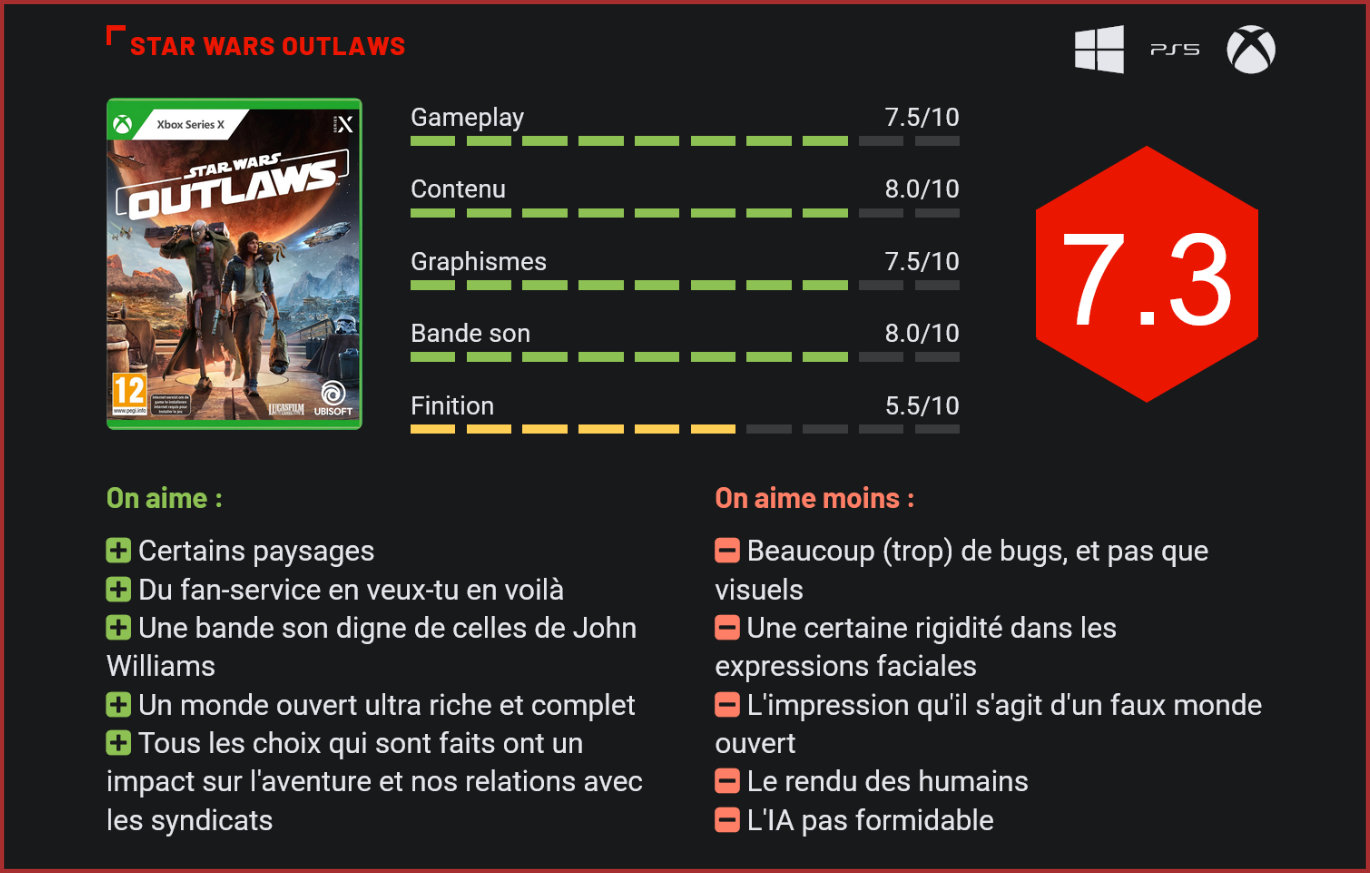 Après Electronic Arts et la très lucrative saga des Jedi, c’est au tour d’Ubisoft de s’attaquer au mastodonte qu’est Star Wars sur consoles. Annoncé il y a plus de trois ans et après une campagne marketing hors normes, le titre tient-il toutes ses promesses ? Star Wars et les jeux vidéo, c’est une très longue histoire d’amour qui remonte aux années 1980. Depuis, ce sont près d’une centaine de titres qui ont été adaptés, généralement appréciés par les joueurs. De 2013 à 2023, c’est Electronic Arts qui avait les droits exclusifs sur Star Wars. Un accord entre Lucasfilm et EA qui n’aura pas été des plus prolifique, puisque seulement cinq jeux verront le jour, ainsi qu’une énorme polémique sur les lootboxes de Star Wars Battlefront. Depuis 2023 cependant, n’importe quel studio peut, s’il le souhaite, s’attaquer à l’adaptation de la saga. C’est chose faite avec Ubisoft qui, dès 2021, annoncera Star Wars Outlaws pour une sortie attendue à l’été 2024. Le titre n’a absolument rien à voir avec les dernières entrées vidéoludiques dans la saga. En effet, Outlaws fait quasiment l’impasse sur les jedis et tout ce qu’on avait l’habitude de voir, et se concentre sur les syndicats du crime, les contrebandiers et autres hors-la-loi. On suit ici les aventures de Kay Vess, une jeune délinquante qui, pour s’offrir la vie qu’elle rêve loin des bidonvilles mal famés, enchaîne les délits et contrats auprès des syndicats du crime. Accompagnée de Nix, une sorte de petite créature toute mignonne, Kay risque sa vie face à des antagonistes plus dangereux les uns que les autres. Situé entre L’Empire contre-attaque et Le Retour du Jedi, Star Wars Outlaws nous plonge dans un scénario unique, sans pour autant perdre le fan de la première heure puisque l’on y retrouve de nombreux éléments communs à la saga originale. Jabba le Hutt, Han Solo, l’Aube Écarlate (syndicat créé par Dark Maul), Tatooine, Canto Bight ou encore Kijimii sont autant de noms qui rappelleront d’excellents souvenirs aux fans des films, auxquels viennent s’ajouter les créations de Massive, comme la très réussie Toshara, planète où peuvent sévir les pires hors-la-loi de la galaxie. Il faut bien l’avouer, les développeurs ont abattu un travail titanesque pour proposer aux fans de Star Wars l’open-world dont ils rêvaient, tout en étant le plus respectueux possible de la saga. Même les angles de caméra, la photographie et le grain ajouté à l’image font référence aux films de la première trilogie. Visuellement, les panoramas de Star Wars Outlaws nous ont mis une claque. C’est également un sans-faute du côté de la bande sonore de ce Outlaws. Le titre veut rendre hommage à John Williams et ses œuvres, sans reprendre à aucun moment les mélodies que nous connaissions déjà. C’est Wilbert Roget II, compositeur qui avait déjà travaillé sur Vader: Immortal, mais surtout sur le célébrissime Star Wars The Old Republic. Les mélodies proposées rappellent l’esprit de la saga, tout en apportant les petites touches dont seul Roget II a le secret. Chapeau bas également pour le doublage francophone, d’excellente qualité et bourré de références à la pop culture. L’un des éléments qui nous aura le plus marqué est ce passage dans un vaisseau impérial, lorsqu’un officier demande à Waaka si c’est une bonne cargaison qu’embarque notre vaisseau, et qu’il répond “Mais vous savez, moi je ne crois pas qu’il y ait de bonne ou de mauvaise cargaison”. Du pur régal pour les oreilles. Pour les oreilles, mais pas seulement. À de nombreuses reprises, nous avons été impressionnés par les capacités du moteur Snowdrop d’Ubisoft, qui a fait ses preuves avec des titres comme Avatar: Frontiers of Pandora ou Tom Clancy’s: The Division. Outlaws, à l’image de ces références de chez Ubisoft, est un délice pour les yeux. Les passages dans l’espace nous ont littéralement subjugués, avec de superbes effets de lumière jouant avec les couchers de soleil autour des planètes, et des environnements luxuriants et sublimes sur les cinq planètes qui nous sont proposées. Tout n’est toutefois pas parfait, entre les modélisations hasardeuses des humains, les expressions faciales peu expressives, un character design bien peu inspiré et certains décors très fades. C’est, honnêtement, l’un des plus beaux jeux qui soit sorti sur consoles et PC de cette année. Abordons ensuite l’élément principal d’Outlaws, son gameplay. Comme vous avez dû le comprendre au travers des premières lignes de ce test, l’essentiel du jeu va se concentrer sur la relation qu’a Kay avec les différents syndicats du crime, qui sont au nombre de quatre. Le plus connu d’entre eux est le Cartel des Hutts, dirigé par Jabba. On retrouve également l’Aube Écarlate, le Syndicat Pyke et, le petit nouveau imaginé par Massive, le Clan Ashiga. Ces quatre clans travaillent étroitement avec Kay lui donnant des missions plutôt variées, qu’elle doit accomplir. Si elle les réussit, elle améliore sa relation avec le syndicat, au risque de ternir ses rapports avec les syndicats rivaux. Mais vous devrez habilement choisir avec qui vous entendre, car de bonnes relations sont synonymes d’avantages sur le territoire de ces cartels. Plus vous aurez de bonnes relations avec un syndicat du crime, plus vous aurez accès à des prix intéressants chez les marchands affiliés, mais pas uniquement. Certaines zones ne nécessiteront plus une infiltration discrète pour y pénétrer, vous recevrez des armes et récompenses matérielles, et obtiendrez des missions toujours plus intéressantes. En revanche, si vos relations avec un criminel sont catastrophiques, alors il enverra ses hommes vous traquer, et vous n’aurez pas intérêt à débarquer sur son territoire, car vous n’y ferez pas de vieux os. Tout au long de notre parcours, on se