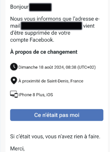 Certains utilisateurs de Facebook ont reçu un message les avertissant que leur adresse e-mail avait été supprimée de leur compte. Ce message incite les victimes à cliquer sur un lien pour rétablir la situation. Attention, il ne faut surtout pas cliquer sur ce lien. Les piratages de comptes Facebook se sont multipliés ces dernières semaines. Et si certaines méthodes frauduleuses sont bien connues, d’autres semblent se spécialiser dans un domaine : les faux supports techniques. Ainsi, certaines personnes ont reçu un message présenté comme provenant de Facebook. Le message en question indique : « Bonjour X, nous vous informons que l’adresse e-mail X vient d’être supprimée de votre compte Facebook ». En dessous de ce message, nous trouvons quelques (fausses) informations à propos de cette soi-disant suppression : la date, le lieu et l’appareil à l’origine de cette “suppression” d’adresse e-mail. Enfin, le message se clôture par la phrase suivante : « Si c’était vous, vous n’avez rien à faire. Merci ». Bien entendu, la cible de cette arnaque n’a effectué aucune manipulation pour supprimer l’adresse mail associée à son compte Facebook. Prise de peur, elle va alors de tourner vers le bouton “Ce n’était pas moi”. La suite, nous la connaissons. Ce faux message d’avertissement redirigera la victime vers une fausse page Facebook de support. Cette fausse page de support technique incitera la victime à encoder différentes informations confidentielles (mot de passe, identifiant, etc.), et les enregistrera. En fin de compte, l’auteur de cette arnaque aura toutes les informations entre ses mains pour pirater le compte Facebook de sa victime. Si vous recevez ce message, ne cliquez en aucun cas sur le lien “Ce n’était pas moi”. Rendez-vous dans les paramètres de Facebook afin de vous assurer que votre adresse e-mail est toujours bien associée à votre compte. De façon plus générale, prenez le temps d’analyser une situation et méfiez-vous des comptes qui se présentent comme des supports d’aide. Pour rappel, Facebook n’envoie jamais de messages privés à ses utilisateurs, même pour les prévenir d’un risque de piratage.