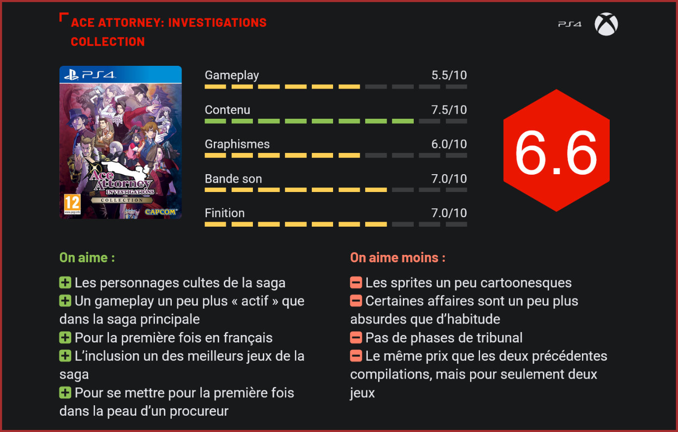Dernière compilation d’un travail de réédition complète de la saga Ace Attorney, Investigations est un double-jeu qui se démarque de tous les autres dans la franchise par son gameplay un peu plus investi que pour ses prédécesseurs. La compilation Ace Attorney Investigations Collection est la dernière pierre à l’édifice d’un gigantesque travail de réédition et de compilation de la franchise Ace Attorney sur les plateformes modernes, et avec des sprites améliorés, qui avait commencé avec Phoenix Wright: Ace Attorney Trilogy en 2019. Du moins si vous êtes prêts à consommer la saga en anglais : sinon, il manque encore une traduction française de The Great Ace Attorney Trilogy. Plus de procès, mais des affrontements tout aussi palpitants ! Comme son nom l’indique, cette nouvelle compilation concerne les deux jeux « Ace Attorney Investigations », mettant en scène le procureur Benjamin Hunter dans un jeu d’enquête sans phase de procès (c’est d’ailleurs un défaut du jeu, puisqu’on sait bien que le tribunal, et l’inénarrable juge, représentent une bonne partie de l’âme de la saga). Ces deux spin-off de la série principale jouissent d’une réputation un peu particulière dans la franchise : alors que le premier des deux jeux est souvent considéré par le fandom comme un opus décevant ; c’est tout le contraire pour le second qui est souvent classé parmi les meilleurs jeux de la saga. Reste qu’Ace Attorney Investigations Collection n’est certainement pas le jeu avec lequel nous vous conseillons de commencer la franchise, qui est nettement mieux commencée avec le premier opus, Phoenix Wright : Ace Attorney. Quant à savoir s’il vaut mieux le jouer après ou avant Apollo Justice Trilogy, les deux se défendent : si vous voulez suivre l’histoire dans son ordre chronologique, alors Investigations se placera entre les deux trilogies. Mais vous pouvez aussi suivre une tout autre logique, et le jouer après les deux trilogies, pour une histoire qui se veut, sommes toute, plutôt détachée de la saga du cabinet d’avocat de Phoenix Wright, tout en vous permettant de retrouver de vieux amis que vous n’aurez plus revus depuis trois jeux au moins. Dick Tektiv, grand absent de la saga Apollo Justice (sauf pour un flashback), fait son grand retour Le jeu ne s’adresse donc par définition pas aux nouveaux arrivants. Rappelons qu’Ace Attorney reste une saga très unique dans le monde du jeu vidéo, et le tableau que nous dressons ici a pour cible les fans de la saga. Nous supposons donc que vous êtes déjà un amateur du style « animesque » des graphismes, et des excentricités judiciaires à grand coup d’OBJECTION ! Comme indiqué plus haut, les deux jeux disposent d’un gameplay sans pareil dans la franchise Ace Attorney. Il faut en effet rappeler que la saga principale est composée de purs Visual Novel avec un gameplay très minimal. Avec Ace Attorney Investigations, si l’on reste toujours dans les codes du genre, le jeu nous donne une légère impression de contrôle supplémentaire : on déplace ainsi un personnage dans un décor en 2D, on récolte des indices, et l’on doit faire des liens entre différents éléments en les emboîtant comme des pièces de Puzzle. S’il n’y a pas de procès, Ace Attorney Investigations alterne ces phases d’investigations avec des phases de confrontation qui reposent sur le même principe que les procès de la saga principale, mais en beaucoup plus condensé : un personnage vous donnera sa version des faits, et ce sera à vous de démontrer les failles dans son raisonnement (ou dans ses mensonges) en insistant ou en utilisant les indices récoltés sur la scène pour pointer les contradiction dans le discours de votre interlocuteur (qui est parfois le meurtrier). Un petit côté “chibi-cartoon” pas toujours très agréable, optez pour le Pixel Art ! C’est à peu près tout en termes de gameplay, mais cela n’a jamais été l’attrait principal de la franchise, qui repose nettement plus sur son histoire, ses personnages, et bien sûr sur le fait de pousser ses joueurs au raisonnement (parfois tordu). Et en termes de personnages, on est plutôt bien servis, puisque Ace Attorney Investigations nous permet de retrouver de nombreux personnages de la trilogie originale qui avaient disparus dans les jeux mettant en scène Apollo Justice, comme le bon vieil inspecteur Dick Tektiv qui nous accompagne ici la plupart du temps (pour des raisons de spoiler, nous ne vous en dirons pas plus sur les autres personnages qui font leur retour). Mais les nouveaux personnages ne sont pas non plus en reste ! (Même si bien entendu, il y a quelques ratés). Les enquêtes sont aussi très variées, comme la franchise sait le faire, et offrent des cadres bien distincts, même si certains frisent parfois peut-être un peu le ridicule (pas nécessairement plus que dans la saga principale, mais la vision en 2D « vue du dessus/côté » lors des phases d’investigation, avec des personnages rendus un peu plus « cartoonesques » n’aide pas toujours). La recherche des indices passe parfois en version point and click, comme dans les opus précédents Musicalement, on est sur du Ace Attorney, et on peut donc tout naturellement s’attendre à du grand art comme la saga sait bien le faire. Les musiques conservent toutefois leur côté un peu « chiptune » qui est absents des jeux plus récents tels que ceux présent dans la trilogie Apollo Justice. En termes de graphismes, cette compilation vous laisse, pour la première fois, le choix entre des sprites à l’ancienne en pixel art, qui feront le plus grand plaisir des nostalgiques, et des sprites modernisés. Notez toutefois que ceux-ci ne concernent que les personnages visibles dans les décors en vue du dessus, et non pas ceux des dialogues. Nous vous conseillons, paradoxalement, d’avoir recours aux graphismes à l’ancienne pour un peu atténuer l’ef