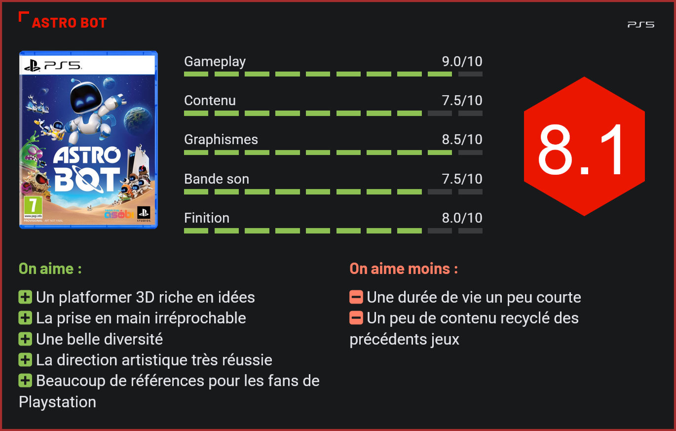 Les temps sont durs pour Sony qui fait l’actualité pour l’échec cuisant de Concord. Pourtant, un petit robot sauve la réputation de la marque en ce mois de septembre. Après plusieurs aventures où Astro servait à montrer les capacités de différents accessoires de Playstation, il est temps pour lui de briller par ses propres moyens. Désormais plutôt connu des fans de Playstation, Astro Bot est une licence qui s’est, jusque-là, contentée de proposer des expériences pour accompagner la sortie d’accessoires ou de technologies du constructeur de consoles. The Playroom mettait en avant la Playstation Camera et la Dualshock 4, Astro Bot Rescue Mission accompagnait parfaitement le PSVR, et Astro’s Playroom démontrait les capacités de la PS5 et de sa manette. Si ces différents épisodes étaient très compétents, ils étaient aussi limités à leur rôle de “démo technique”, et n’ont donc pas tant marqué les esprits. Depuis ce 6 septembre, la licence est de retour avec une véritable aventure qui montre que le robot et ses développeurs, la Team Asobi, sont tout à fait capables de tenir tête aux grands noms du platformer 3D. Dans le sobrement intitulé “Astro Bot”, nous incarnons le petit robot alors à bord de son vaisseau spatial en forme de PS5. C’est alors qu’apparaît un alien dans sa soucoupe volante, ce dernier détruit le vaisseau et s’empare de plusieurs composants importants de la console. Astro va devoir explorer tout un tas de niveaux dans l’espace afin de récupérer les composants, et aussi retrouver tous les bots qui vivaient dans son vaisseau et qui ont été éparpillés à travers les différentes galaxies. Avec son jet en forme de Dualsense et les nombreux bots faisant parfois référence à des personnages ayant marqué l’histoire de Playstation, l’univers d’Astro continue sur la lancée de Astro’s Playroom en multipliant les références. Les clins d’œil à la marque et à l’histoire du jeu vidéo sont partout, et le titre se permet même des allusions très obscures. La structure du jeu est simple mais efficace. Côté gameplay, le titre se montre plutôt classique. Nous retrouvons un Astro qui se contrôle exactement comme dans les précédents. Le robot peut taper avec ses poings, charger son attaque pour tourner sur lui-même, et il peut évidemment sauter et planer en tirant des lasers avec ses pieds. Le jeu se divise en niveaux linéaires qui réservent de nombreux défis de plateforme, des ennemis à vaincre ainsi que plusieurs collectables cachés comme les différents Bots à retrouver ainsi que des pièces de puzzle qui servent à débloquer des choses dans notre base. En effet, notre vaisseau PS5 se repose dans une petite zone désertique que nous allons peupler et aménager au fil du jeu en trouvant de nouveaux personnages. Si la formule est plutôt simple, Astro Bot est un jeu très généreux dans ce qu’il propose. Presque chaque niveau possède des idées ingénieuses qui renouvellent constamment l’expérience. Ces idées ne révolutionnent pas le genre non plus puisqu’on retrouve des mécaniques déjà vues autre part, mais le titre se rapproche véritablement de la diversité et de la richesse d’un jeu de plateforme Mario. Les capacités d’Astro, bien que déjà très efficaces en l’état, sont souvent agrémentés par des “transformations” temporaires. Ces dernières ne sont trouvables que dans des niveaux précis et offrent de nouvelles possibilités qui s’accordent avec les obstacles du niveau en question. Certains passages nous donnent des gants capables d’augmenter la portée des attaques d’Astro et de casser différents types d’obstacles, d’autres nous permettent de porter un chien-jetpack qui nous propulse vers l’avant… Des bonus donnent de nouvelles capacités à Astro. Cette générosité est présente tout au long de la dizaine d’heures qui composent cette aventure. Parmi les 80 niveaux, certains sont de petits défis de plateforme, parfois plus corsés que d’habitude, même si la difficulté reste plutôt accessible sur le reste du jeu. Il faut aussi compter sur quelques sorties secrètes permettant de trouver de nouveaux stages. Chaque fin de galaxie propose également un boss souvent spectaculaire et bien pensé, ainsi qu’un niveau particulier faisant référence à une licence forte de Playstation, et changeant le gameplay pour s’en approcher par la même occasion. De gros moments de fan service que nous vous laisserons découvrir par vous-même. Si cet épisode se débarrasse de l’aspect “démo technique” des précédents jeux, Astro Bot prend tout de même en compte les nombreuses capacités de la Dualsense pour enrichir son gameplay. Le titre demande souvent d’utiliser le gyroscope de la manette et exploite bien les vibrations et les gâchettes adaptatives. Avec toutes ces idées, Astro Bot propose une maniabilité impeccable et un sens du détail exemplaire. Les combats de boss sont aussi très réussis. Chaque niveau n’est pas juste différent par ses idées, mais également par ses décors. Chacun des parcours possède une ambiance et un univers différents. Le titre propose alors une diversité visuelle dingue, même si certains thèmes sont repris de précédents épisodes de la licence. Dans tous les cas, le jeu reste très joli en toute circonstance, et est d’une fluidité exemplaire. Côté musique aussi, le jeu ne déçoit pas en proposant des thèmes mémorables et quelques remix de thèmes des précédents jeux. Il y a finalement peu de choses à reprocher à ce Astro Bot, si ce n’est une durée de vie un peu courte pour un titre pourtant proposé à 69,99€ sur le Playstation Store. Ce nouvel épisode reste un jeu de plateforme 3D qui rivalise sans problème avec les grands noms du genre. C’est très coloré, vivant, mignon et drôle, de quoi satisfaire les plus jeunes mais aussi les plus vieux avec quelques défis e