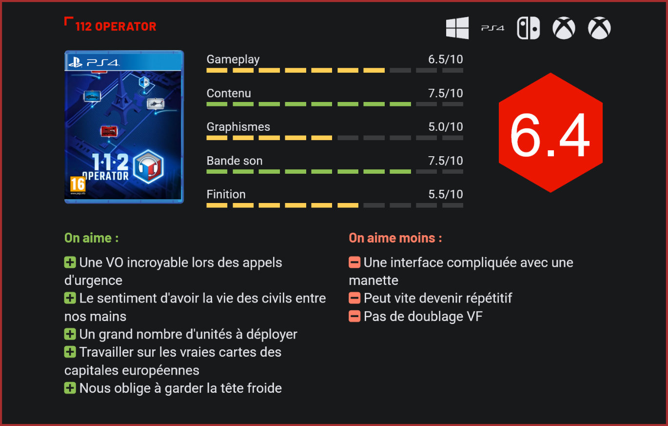 Vous avez toujours rêvé de travailler dans un centre d’appels d’urgence et de dispatcher les services de secours selon les urgences ? 112 Operator est le jeu qu’il vous faut. Les jeux de simulation ont la cote en ce moment. Food Truck Simulator, Supermarket Simulator, Police Simulator, Thief Simulator… On en dénombre près d’une centaine et, même s’ils sont parfois (voire souvent) peu glorieux, ils ont le mérite de plonger le joueur dans une situation ou un métier qu’ils n’auront probablement jamais l’occasion de faire. Sorti en avril 2020, 112 Operator est, lui aussi, un jeu “Simulator” et vous place aux commandes d’un centre d’appels d’urgence et d’un dispatch d’unités de secours. Cette année, c’est dans une version consoles sur PS4 et Xbox que le titre débarque. Si vous ne connaissiez pas le concept, il est pourtant très simple et a déjà fait ses preuves dans 911 Simulator, où vous gériez les services de secours des États-Unis. Ici, vous retrouvez non seulement ces villes américaines dans les scénarios, au même titre que d’autres grandes villes du monde, mais également des capitales européennes où réaliser votre campagne : Madrid, Berlin, Rome, Londres ou encore Paris. Vous êtes le nouveau dispatcher des services d’urgence et devez, en plus gérer le centre d’appels d’urgence. Les scénarios vous permettent de retrouver des catastrophes aux quatre coins du monde. Policiers à vélo ou à cheval, ambulanciers et médecins à moto ou encore pompiers en hélicoptère ou en véhicule tout-terrain, telles sont les différents unités que vous devez gérer sur votre carte et envoyer sur les différents lieux d’incidents. Vos parties seront rythmées sous la forme de journées, lors desquelles se produiront différents accidents. Ceux-ci nécessitent alors l’intervention des docteurs ou des ambulanciers (il faudra envoyer le bon type de véhicule s’il faut déplacer des blessés), des policiers, des pompiers, voire plusieurs unités différentes en même temps. En fonction de l’emplacement des équipes d’intervention, il faudra choisir celles qui sont le plus à même d’intervenir rapidement et qui en sont le plus proche. Les interventions sont multiples : cela va d’un chat coincé dans un arbre (pompiers uniquement) à un braquage avec blessés (ambulanciers et policiers) en passant par une personne qui a fait un malaise (médecin ou ambulancier, c’est selon). Au-delà de ces interventions qui seront plus ou moins nombreuses, vous devrez faire face aux appels du 112. Plusieurs fois par journée, le terminal sonnera. Vous devrez alors répondre, écouter votre interlocuteur – qui est par ailleurs extrêmement bien doublé en anglais, et faire les bons choix de réponse. Vous devrez presque toujours lui demander où s’est produit l’incident, demander s’il y a des blessés et, si nécessaire, l’accompagner dans la pratique des premiers soins. Vous devrez aussi débusquer des fausses alertes, comme un jeune qui annonce une alerte à la bombe inexistante dans une école, ou encore aider un homme coincé avec son véhicule sur un passage à niveau. Les appels émanant au 112 demandent au joueur de faire preuve de sang-froid et de prendre les bonnes décisions pour sauver des vies. Très franchement, on se sent énormément impliqué dans la prise de décisions et le sauvetage de nombreux civils dont la vie est entre nos mains. Le gameplay est vraiment fun, bien que répétitif sur le long terme si on ne change pas régulièrement de carte. C’est pour cette raison que les développeurs d’Ultimate Games ont ajouté un grand nombre de villes. L’autre gros défaut de ce 112 Operator est la gestion des unités et des menus avec une manette. On ouvre les différentes fenêtres avec les flèches du pavé directionnel et l’on peut switcher entre une sélection rapide des unités et un curseur libre avec la touche triangle. Malheureusement, ce type de jeu n’est absolument pas adapté à un contrôle au pad, qui ralentit énormément la progression entre les unités et donc la rapidité d’intervention. Visuellement, c’est assez fade et peu attirant. Mais pour ce type de jeu, on n’en demande pas beaucoup plus. Si, visuellement, le titre est fade et se base uniquement sur des menus et cartes de grandes villes, c’est principalement son contenu qui se démarque. On note ainsi une pléthore d’unités disponibles pour intervenir sur les lieux et, s’il vous en manque, vous pouvez en appeler en back-up des villes voisines moyennant paiement. Cela se fera grâce à votre salaire, que vous acquérez au fur et à mesure des journées et de vos erreurs ou non. Enfin, le jeu vous propose trois modes de jeu principaux : la campagne, les scénarios et le jeu libre. Le premier est une espèce de mode histoire sans une narration forte, où vous engrangerez en expérience et vous occuperez d’abord d’un arrondissement d’une ville puis de toute sa totalité. Vous recevrez également des objectifs, pourrez surveiller attentivement la météo, recevrez des mails… Les scénarios, eux, nous mettent aux commandes d’une ville dans le monde lors de catastrophes : vague de chaleur à Rio en 2016, tsunami au Japon en 2001… Ils sont beaucoup plus compliqués, avec un enchaînement très rapide des urgences. Enfin, le jeu libre est beaucoup plus cool et permet au joueur de s’entraîner. C’est probablement le mode qui a le moins d’intérêt. Conclusion Ce ne sera pas le GOTY 2024, mais cette version console de 112 Operator est assurément une petite réussite avec laquelle les amateurs de jeux de simulation passeront de nombreuses heures d’amusement. Il faut garder la tête froide, pour gérer les pires situations d’urgences, dispatcher les unités et donner les bons conseils de premiers soins aux personnes qui appelleront le 112. Envoyer les bonnes unités en fonction des besoins, gérer le stress, telle