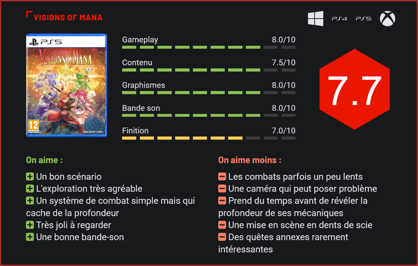Presque 20 ans après le dernier véritable épisode original de la franchise sur console, Square Enix nous propose une toute nouvelle aventure dans l’univers de Mana. Ce nouvel opus de la licence historique d’Action-RPG de Square est disponible depuis peu et se montre très convaincant. Arrivée chez nous avec l’épisode culte qu’est Secret of Mana, la licence Seiken Densetsu existe depuis un peu plus de trente ans. Celle-ci n’a que rarement rencontré le succès chez le grand public et reste, encore aujourd’hui, une série peu connue du catalogue de Square Enix. Ces dernières années, Mana enchaîne les remakes des premiers épisodes, et le petit succès inattendu de Trials of Mana semble avoir donné envie à la firme de lancer un tout nouvel épisode. Développé par Ouka Studios, Visions of Mana est un véritable épisode moderne et qui se montre plus ambitieux que ses prédécesseurs. Inutile de connaître les précédents jeux pour se lancer dans cette nouvelle aventure. À l’image d’autres licences comme Final Fantasy, les jeux Mana se déroulent dans des contextes tout à fait différents les uns des autres malgré quelques similitudes dans leur univers. Visions of Mana prend place dans un monde où se déroule une bien mystérieuse tradition qui est centrale au récit. Tous les quatre ans, ce monde requiert un sacrifice de la part des différents peuples, les offrandes devant donner leur vie à l’arbre Mana pour éviter des catastrophes. Nous suivons l’aventure de Val et Hina. Le jeu suit l’histoire de Hina et Val, respectivement l’offrande du feu ainsi que son gardien. Les deux démarrent très vite leur périple pour se rendre auprès de l’arbre mana et réaliser le rituel. Sur le chemin, ils vont passer par plusieurs régions et rencontrer les autres offrandes qui vont les accompagner dans leur voyage. Si l’histoire n’est pas toujours très surprenante, certains retournements de situations se voient à des kilomètres, elle reste pourtant très agréable à suivre. L’univers est très coloré et son écriture parfois enfantine et naïve cache malgré tout des éléments dramatiques et des moments touchants qui nous impliquent dans le récit. Tout comme ses prédécesseurs, Visions of Mana est un Action-RPG. La formule reste plutôt classique pour un titre du genre puisque le scénario va nous amener à voyager à travers tout un tas de régions différentes. La grande différence est que les zones à parcourir sont plus vastes que dans les autres jeux Mana. Le titre propose ici des environnements semi-ouverts où se baladent des ennemis, et où se cachent tout un tas d’objets à ramasser et de coffres à trouver. Ces zones permettent aussi de réaliser tout un tas de quêtes annexes. L’exploration est récompensée et très plaisante, nous obtenons aussi très vite une monture permettant de rendre cet aspect encore plus agréable. Cet épisode offre plus de liberté dans les environnements à explorer. Le système de combat reste plutôt simple manette en main puisqu’on retrouve des affrontements en temps réel avec les possibilités habituelles de ce genre de jeux. Les sensations de jeu sont bonnes, même si elles peuvent manquer un peu de dynamisme et que la caméra représente parfois un obstacle au bon déroulement du combat. Les affrontements proposent également un système de faiblesse élémentaire qu’il faut réellement prendre en compte pour s’en sortir durant les combats les plus importants. D’autres possibilités s’ajoutent aussi, comme la capacité d’utiliser les pouvoirs des éléments en équipant les reliques spirituelles à nos personnages (celle du vent lance une grande bourrasque qui fait des dégâts, celle de la lune permet de ralentir les ennemis…). Les reliques spirituelles, qui se débloquent progressivement en suivant le scénario, impactent aussi notre manière de jouer les personnages. Chacun de nos héros peut être équipé d’un esprit qui va alors complètement changer ses statistiques, ses capacités et parfois même son gameplay. Un véritable système de classe qui propose de réels changements et une certaine profondeur dans la construction de notre équipe. Malheureusement, cette profondeur de gameplay prend du temps avant de se montrer. Les premières heures de jeu nous limitent à quelques-unes de ces reliques spirituelles, ce qui nous prive de nombreuses possibilités durant un moment. Le scénario nous confronte évidemment à de nombreux boss. Le titre convainc également grâce à ses visuels très charmants. La direction artistique est réussie et offre des paysages vraiment beaux, très détaillés et colorés. Les personnages manquent tout de même un peu de vie sur certaines scènes, et les quêtes annexes ne sont pas toujours très bien mises en scène non plus. Mais le bilan est plus que réussi pour un jeu qui n’a probablement pas eu un budget très conséquent. La bande-son est aussi très agréable à écouter, elle a été réalisée par plusieurs compositeurs dont Hiroki Kikuta à qui l’on doit les musiques cultes de Secret of Mana. Visions of Mana souffre de quelques autres soucis récurrents du genre, comme la présence de quêtes annexes franchement pas passionnantes et un rythme qui prend du temps avant de décoller, mais l’aventure reste très agréable à parcourir. Comptez une trentaine d’heures pour en voir le bout, mais il faut y ajouter encore un peu de temps pour le finir entièrement, le titre réserve en plus du contenu bonus après la fin. Visions of Mana est un retour perfectible mais réussi pour cette licence de Square Enix. Conclusion Les fans de la licence Mana ont attendu presque 20 ans depuis le dernier épisode original sur console. Visions of Mana est un véritable retour qui n’est pas parfait mais qui se montre plutôt réussi. Nous suivons les aventures de Val, le protecteur de son amie d’enfance nommée Hina. Cette dernière a été d