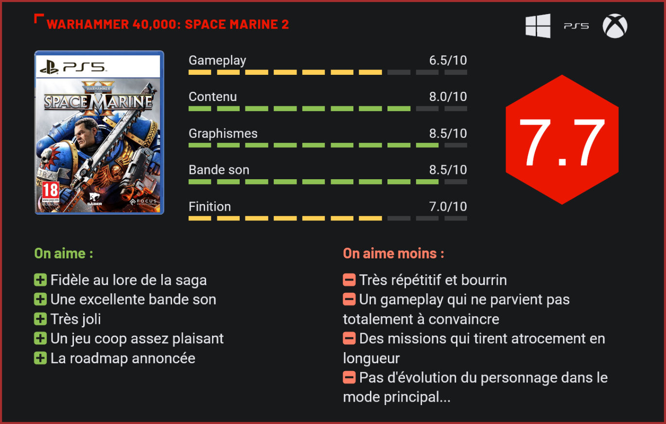 C’était l’un des plus gros jeux de cette fin d’année. Warhammer 40,000 Space Marine 2 est également l’un des premiers “vrais TPS new-gen”. Le jeu de Saber Interactive nous en met plein les yeux avec des batailles titanesques. Mais mérite-t-il le détour aussi pour son gameplay ? Pour les amateurs de TPS (ou jeux de tir à la troisième personne), il faut bien avouer que cette année 2024 n’est pas la plus riche en sorties. Focus Entertainment nous vient heureusement à la rescousse avec un bon gros jeu triple-A qui marche sur les traces de Gears of War. En 2011 sortait un TPS dans l’univers de Warhammer 40,000. Développé par le studio Relic Entertainment à l’époque, Space Marine avait remporté un joli succès. La faillite de THQ à l’époque avait toutefois condamné la franchise à un seul et unique chapitre dans cette toute jeune saga… Près de 15 ans plus, c’est Focus qui a récupéré les droits de la franchise et conçu avec le studio Saber Interactive (World War Z) cette suite inattendue. Le jeu est très fidèle au lore Warhammer. L’histoire prend place plus d’une décennie après celle du premier épisode. Le joueur incarne toujours Titus, un Space Marine de l’escouade de la Deathwatch qui va être envoyé sur Avarax pour empêcher les Tyranides de s’emparer de la planète. On s’en rend compte dès le premier coup d’oeil, le jeu est ultra-fidèle au lore de Warhammer 40,000 et pour les fans, cela devrait être un vrai plaisir d’explorer son univers à travers ce nouveau scénario. Pour ceux qui ne connaissent que très peu l’univers de la saga en revanche, il faut bien avouer qu’il est difficile de tomber sous le charme du personnage principal, dont la psychologie n’est guère fort développée, ou de vraiment s’intéresser au sujet. En gros, on va buter de la crevette en masse sur une planète lointaine aux biomes variés, et les tenants et aboutissants de cette mission ne sont guère les plus passionnants. Rassurez-vous, pad en main, le jeu est fort plaisant. Si nous avions mentionné Gears of War plus tôt, Space Marine 2 n’a en réalité pas grand chose à voir avec le TPS de The Coalition si ce n’est cette vue à la troisième personne, les grosses armures et aliens pas beaux à massacrer. Il n’y a ici pas de système de couverture. Le gameplay s’axe beaucoup sur la coopération à trois joueurs ou 2 IA et un joueur. Il faudra continuellement se protéger et se répartir les tâches pour progresser dans l’aventure. Space Marine 2 se démarque aussi des autres titres du genre par le fait que son gameplay est divisé entre les combats à distance (à la mitrailleuse ou à la grenade) et au corps à corps, avec votre chère épée tronçonneuse. Les munitions finissent toujours par manquer, ce qui amène à des combats extrêmement intenses au corps à corps. Votre arme à feu sera d’ailleurs globalement plus pratique contre la masse de petits ennemis que contre les commandants adverses, beaucoup plus résistants et qui viendront souvent au corps à corps. Les objectifs de mission sont en général assez simples. Manette en main on est un peu désarçonné au début par la configuration des boutons. Il faudra un certain temps pour mémoriser les commandes. Il y a des touches distinctes pour les parades et les esquives, des touches distinctes pour les grenades et les ultimes, et surtout quelques mécanismes à bien mémoriser – et qui n’ont pas forcément de sens. Par exemple, vous regagnerez de l’énergie en activant votre ultime et engageant des dégâts à l’adversaire. En revanche, pour recharger votre bouclier, il faudra “finir” les adversaires avec une fatalité au corps à corps. C’est bizarre, même si on s’y fait. Les ennemis grimpent le long des murs. Dans le même ordre d’esprit, on est assez surpris de l’absence d’améliorations pour les armes, qui auraient pourtant grandement contribué à rendre plus intéressant le jeu, sur la longueur. Il manque cruellement au jeu un système d’évolution des personnages ou d’acquisition de nouvelles compétences. Pour ce qui est des missions, c’est le grand retour au début des années 2000 avec des missions très scriptées et surtout excessivement longues. Comptez 1h à 1h30 pour finir une mission au pas de course. Ce qui est énorme et pas forcément évident en une session de jeu avec ses amis en ligne. On aurait sans doute préféré des missions un peu plus courtes et plus variées. A ce sujet, si les biomes sont diversifiés, sachez que niveau bestiaire, ça tourne vite en rond, pareil au niveau des objectifs et des structures de missions. En gros on traverse des environnements superbes, on affronte des petits groupes d’ennemis, parfois un boss, puis des essaims d’ennemis, par milliers, à la façon de World War Z. C’est sympa, mais il faut avouer que le jeu a tendance à être très bourrin. Par ce fait, beaucoup s’en lasseront donc. On notera aussi qu’y jouer en solo n’est pas la meilleure des idées, c’est typiquement le genre de jeu beaucoup plus fun à plusieurs… Certaines missions sont très intenses. Du côté des bonnes surprises, on citera les combats de boss plutôt réussis, la mise en scène en général lors des missions, très spectaculaire, la présence d’une seconde campagne une fois l’aventure terminée avec le mode Opérations qui comprend 6 missions additionnelles et permet surtout de faire évoluer la classe du personnage que vous avez sélectionné (option non présente dans la campagne principale !) Et cela devient d’un coup beaucoup plus intéressant. On retrouve là aussi le système d’amélioration d’armes dont on rêvait pour la campagne principale. A ce sujet, c’est plutôt dommage de l’en avoir privé… La bonne nouvelle c’est que le suivi du jeu s’annonce irréprochable avec un paquet de nouvelles missions qui devraient bientôt être proposées, de nouveaux modes d