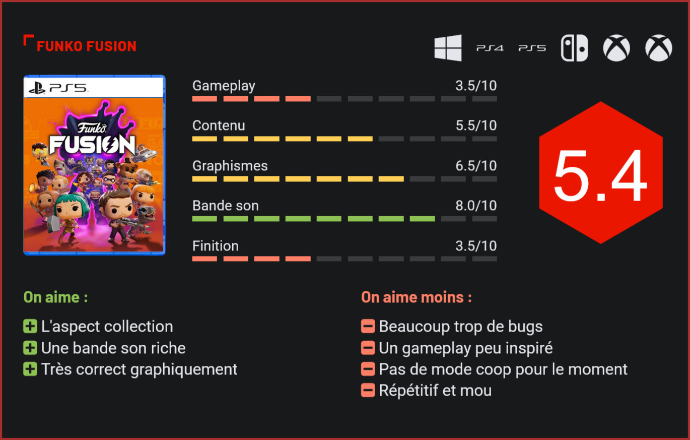Le phénomène Funko Pop n’est pas prêt de s’arrêter. Après avoir envahi les boutiques, les célèbres figurines se déclinent désormais en jeu vidéo. La première production Funko risque toutefois d’en décevoir plus d’un… Explications. Première production du studio 1010 Games, Funko Fusion se présente comme un jeu d’action-aventure qui s’inspire assez ouvertement de la formule des jeux Lego. Le jeu mélange ainsi combats au corps à corps, gunfights, plates-formes et résolution d’énigmes dans son aventure. Il se distingue de son modèle par le fait que contrairement aux jeux Lego, Funko Fusion mélange plusieurs univers. On retrouve des personnages et décors de films et séries cultes comme Jurassic Park, Retour vers le futur, Les dents de la mer, Invincible et The Thing, mais aussi de productions un peu moins tendances en ce moment comme Masters of the Universe, Battlestar Galactica, Hot Fuzz ou Voltron. De quoi rallier un gros paquet de cinéphiles à sa cause… Les cinéphiles reconnaîtront la référence à Hot Fuzz L’ennui, c’est que sur le papier tout cela avait l’air absolument génial, pad en main, on déchante très vite. Le scénario du jeu n’est ici qu’un prétexte à nous faire parcourir ses sept univers principaux. Tout au plus pourrez vous compter que quelques cinématiques rigolotes pour vous faire sourire. Quant au gameplay, il se résume majoritairement à des affrontements extrêmement fades au corps à corps et à distance. Au corps à corps, les combats sont atrocement mous et l’action manque de lisibilité. A distance, on se contente de mitrailler des ennemis sans sourciller. Les sensations sont minimalistes, au point qu’on en viendrait presqu’à penser que les productions Lego ne faisaient pas un aussi mauvais job en la matière… Extrêmement fade dans ses affrontements, le jeu manque aussi cruellement de saveur dans sa construction. Les niveaux sont inutilement longs et répétitifs, avec des objectifs de mission qui tournent en rond dès le premier chapitre (éliminer x ennemis, accompagner tel personnage,…) – on n’est que très rarement surpris et il faut bien l’avouer, Funko Fusion a un côté terriblement amateur. Un aventurier, une momie, cela ne vous rappelle rien ? En dépit de ces grossiers défauts, le titre parvient toutefois à nous tenir scotché à notre pad pour une seule et unique bonne raison : son fan-service. On prend de facto un certain plaisir à explorer les univers de nos sagas préférées, à débloquer personnages et capacités ou à visionner des cinématiques rigolotes. Funko Fusion joue d’ailleurs plutôt bien la carte du fan-service avec son paquet de personnages à débloquer et des séquences cultes des films parfois habilement revisitées. Le jeu intègre également un paquet de morceaux de bandes originales de films et tente de rester le plus fidèle possible à l’esthétique Funko. L’ennui, c’est que même avec la meilleure volonté du monde, il faut bien avouer qu’on s’ennuie souvent ferme devant l’écran, la faute à un gameplay atrocement plat. La licence Jurassic Park est incontournable, les dinosaures sont de la partie Le jeu peine également à trouver une identité. De par son gameplay, on se dit qu’il s’adresserait plutôt à un public jeune… Mais la plupart des références du jeu ciblent une audience de plus de 30 ans. De The Thing à Shaun of the Dead en passant par Retour vers le futur et Voltron, il faut bien avouer que les licences sélectionnées parleront très peu aux jeunes audiences, à l’exception peut-être de Jurassic Park et Umbrella’s Academy. On notera par ailleurs que le titre bénéficie comme de nombreuses autres productions récentes d’un lancement laborieux. Le mode coop promis ne sera pas disponible avant un moment et surtout, le titre est truffé de bugs qui impactent à la fois les visuels et la progression. Si vous êtes intéressé par son univers, cela peut donc valoir la peine d’attendre des soldes pour en profiter dans de meilleures conditions et à plus faible prix… Conclusion Marchant sur les traces des jeux Lego, Funko Fusion ne parvient toutefois jamais à reproduire le génie de la formule TT. Le gameplay est atrocement fade et les niveaux inutilement longs et répétitifs. Au final, on a l’impression de jouer à un jeu très générique, qui tire sa seule et unique force des multiples licences qui sont ici explorées. Sur le papier, le jeu avait toutefois tout pour plaire avec son concept unique, ses tas de licences et son mode coop… qui n’arrivera que plus tard via une mise à jour. Regrettable, d’autant plus que visuellement, Funko Fusion s’en sort correctement, et bénéficie de surcroit d’une très jolie bande son. Notons le également : le jeu est bourré de bugs à sa sortie. Si vous envisagiez de l’acheter, cela peut donc valoir la peine d’attendre d’éventuelles soldes…