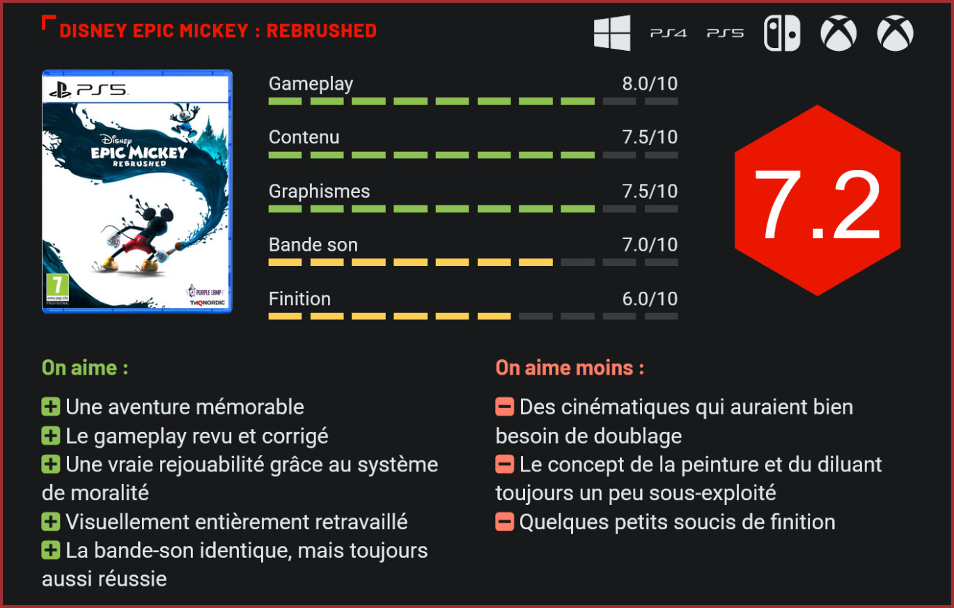 La mascotte de Disney a eu droit à de nombreux jeux vidéo, mais peu ont autant marqué que Epic Mickey et son identité si particulière. Le premier épisode est de retour, plus de dix ans après sa sortie sur Wii. Quatorze ans après la sortie du jeu original, la licence Epic Mickey est de retour avec un remake du premier épisode. Sorti à l’origine sur Wii, ce titre avait marqué les esprits grâce à un gameplay réussi et une identité mémorable. Cette aventure de la mascotte de Disney a été conçue par Junction Point Studios, un studio désormais fermé, mais qui avait été fondé par Warren Spector, un grand nom de l’industrie ayant travaillé sur des jeux comme System Shock ou Deus Ex. Ce remake, lui, a été réalisé par Purple Lamp, dans le but de recréer le jeu original à l’identique tout en lui donnant une seconde jeunesse et en lui offrant des visuels en HD pour la première fois. Mickey doit redonner des couleurs à un monde composé de personnages et de concepts oubliés par Disney. Dans Epic Mickey, nous incarnons la souris la plus connue du monde qui est plongée dans le monde des toons. Ce monde dédié aux choses et personnages oubliés, originellement créé par le sorcier Yen Sid, est mis sens dessus dessous par accident à cause de Mickey. Ce dernier va être aspiré dedans et va devoir trouver un moyen de retourner chez lui et de réparer le mal qu’il a causé dans ce monde. Sur le chemin, il va croiser de nombreux personnages oubliés de l’histoire de Disney, à l’image de Oswald le lapin chanceux qui joue un rôle important dans cette aventure. Si le scénario n’est pas d’une richesse incroyable, et que les très belles cinématiques animées auraient bien eu besoin d’un véritable doublage, il a pourtant le mérite de se dérouler dans un univers très réussi. Epic Mickey prend place dans un monde plus sombre, aux visuels parfois un peu cauchemardesques, mais aussi fascinant et remplis de clins d’œil pour les fans de l’histoire de Disney. Une réussite que l’on doit à la direction artistique très marquée du jeu original, mais aussi à la belle modernisation que propose cette refonte. Sans être techniquement impressionnante, cette version “Rebrushed” transforme très efficacement les graphismes de la version Wii en ajoutant de nombreux détails sans perdre l’identité du jeu original. La bande-son, elle, reste identique à celle de l’époque, et se montre toujours aussi plaisante, se permettant là aussi de rendre quelques hommages. Passer d’une zone à une autre nécessite de traverser un petit niveau en 2D. Epic Mickey est un jeu de plateforme en 3D qui s’inspire aussi de nombreux jeux d’aventure. Nous parcourons des environnements où se trouvent des personnages avec qui dialoguer et qui peuvent nous donner des quêtes, des ennemis à combattre, des challenges de plateforme, plusieurs sortes de collectables et même de petites énigmes à résoudre grâce aux capacités de Mickey. En effet, la souris possède un pinceau magique lui permettant de tirer de la peinture et du diluant. Dans ce monde, la peinture permet de redonner vie à ce qui a été effacé, et le diluant fonctionne à l’inverse en effaçant ce qui est touché. Si l’entièreté des décors et des personnages n’obéissent pas à ces règles et que le concept parait un peu sous-exploité tout de même, l’idée est pourtant très ingénieuse et beaucoup d’éléments peuvent être altérés avec nos pouvoirs. Ce côté “jeu d’aventure” se ressent également grâce au système de moralité du titre. Que ce soit durant les combats ou dans les quêtes annexes, notre manière de jouer et d’utiliser les deux types de tir va impacter la réputation de Mickey, le résultat peut alors changer quelques éléments du jeu comme le déroulé de certaines scènes. Entre les mondes, Mickey doit aussi parcourir de courts niveaux en 2D qui rendent hommages à des films bien connus du début de sa carrière. Dans tous les cas, le gameplay est particulièrement efficace et Mickey se contrôle comme un charme. Cette nouvelle version se permet d’altérer un peu les mondes, mais aussi d’effacer les imprécisions liées au gameplay à la wiimote de l’original. Mickey bénéficie aussi de nouveaux mouvements comme une esquive et la capacité de courir, ce qui rend l’expérience un peu plus dynamique. On croise aussi plusieurs boss durant l’aventure. Disney Epic Mickey : Rebrushed est un remake assez fidèle qui ajoute quelques éléments et corrige plusieurs soucis de l’original. Cette nouvelle version manque tout de même d’un tout petit peu de finition générale (nous avons rencontré quelques soucis visuels, ou quelques transitions brusques entre une cinématique et le gameplay), mais aucun de ces problèmes ne gâche véritablement l’expérience. Le titre ne propose pas de modes de difficulté, l’aventure reste donc très accessible afin d’être jouable par les plus jeunes aussi. Terminer le jeu prend un peu plus de dix heures, mais le système de moralité donne des raisons de s’y replonger pour voir ce que nous avons manqué. Cette version Rebrushed est une modernisation réussie qui permet de redécouvrir ce platformer sympathique sur toutes les consoles actuelles. Conclusion Malgré sa bonne réputation, il est tout de même surprenant de voir débarquer un véritable remake de Epic Mickey. Cette série de jeux de plateforme mettant en scène la mascotte de Disney n’avait plus donné de nouvelles après sa suite et un spin-off paru il y a un peu plus de 10 ans maintenant. C’est pourtant le tout premier épisode qui revient sous la forme d’une refonte efficace signée par le studio Purple Lamp. Dans ce premier jeu, nous incarnons Mickey qui explore le monde des toons, un univers peuplé de personnages oubliés de l’histoire de Disney. Un peu plus sombre que d’habitude, ce premier titre est une aventure véritable