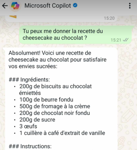 L’assistant virtuel de Microsoft fait son arrivée au sein même de WhatsApp, et plus précisément dans votre liste de discussions. Copilot est notamment capable de répondre à vos questions, de générer des images ou de traduire des textes. Copilot, l’intelligence artificielle de Microsoft, s’invite désormais au sein même de WhatsApp. Comment y accéder ? Rien de plus simple, il suffit de se rendre sur ce site et de scanner le QR code affiché à l’écran. Copilot sera ainsi directement intégré à votre compte WhatsApp Le robot conversationnel de Microsoft se fait alors une place de choix parmi vos différentes discussions. Vous pourrez ainsi cliquer à n’importe quel moment sur la fenêtre de discussion “Microsoft Copilot” afin d’interagir avec l’IA. Mais en quoi cela consiste-t-il concrètement ? À l’image de ChatGPT, Copilot est capable de répondre à des questions (plutôt factuelles). Vous pouvez ainsi lui demander la recette d’un plat ou un conseil pour pratiquer un sport. Cette IA est capable de corriger ou de résumer un texte. Bien entendu, Copilot peut aussi générer du texte. Demandez-lui de générer un poème sur l’arrivée de l’automne et il s’exécutera. Copilot est également capable de générer des images. Laissez libre cours à votre imagination et il s’exécutera, avec des résultats plus ou moins convaincants. Ensuite, vous pourrez partager vos créations avec vos contacts WhatsApp. Notons enfin que l’assistant virtuel de Microsoft se présente comme un traducteur, ce qui est particulièrement pratique si vous menez une conversation dans une langue étrangère sur WhatsApp.