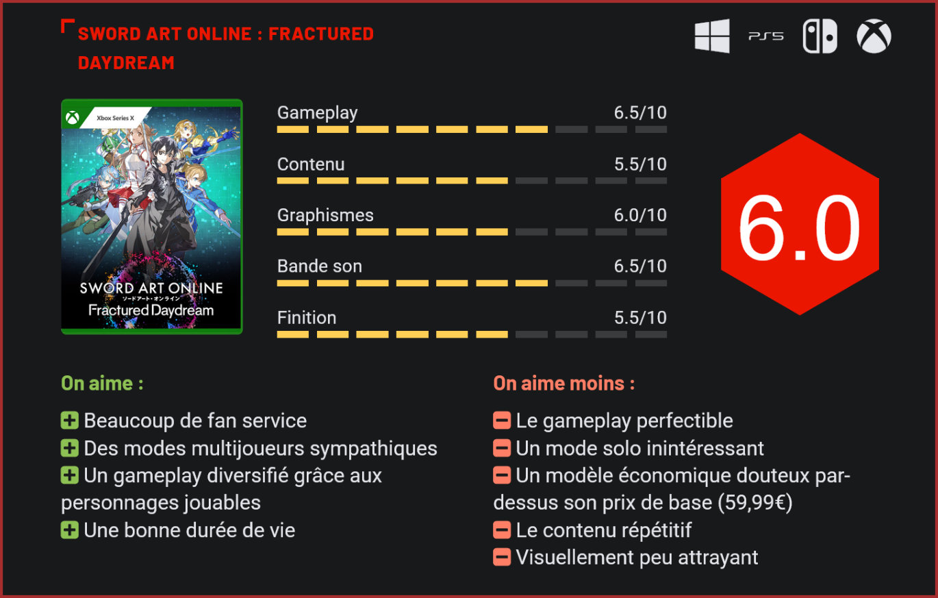 Depuis un peu plus de dix ans, la licence Sword Art Online se décline en divers jeux vidéo qui, à cause de leur qualité discutable, ne touche que les fans les plus indulgents. Malheureusement, ce nouvel épisode “Fractured Daydream” ne change pas la donne. Si l’on connaît surtout la série dans nos contrées grâce à l’immense succès à l’international de son adaptation en animé, Sword Art Online est une série de romans japonais qui est toujours en cours de parution dans son pays d’origine. La licence de Reki Kawahara s’est aussi déclinée en plusieurs jeux vidéo ces dix dernières années, mais aucun de ces titres n’est vraiment resté dans les mémoires. Disponible depuis quelques jours, Sword Art Online : Fractured Daydream est un tout nouveau jeu aux nombreuses promesses destiné aux PC, Xbox Series, PS5 et Switch. Est-ce que cet épisode sera celui qui va racheter les fautes de ses prédécesseurs ? Non, toujours pas. Le titre démarre par le retour de l’antagoniste de l’arc Alicization. Dans ce nouvel épisode, nous retrouvons Kirito et ses amis qui continuent à passer du temps dans ALfheim Online, l’un des MMORPG en VR de la série. L’arrivée d’une nouvelle extension du jeu nommée “Galaxia”, un système pensé pour faire revivre les souvenirs des joueurs, va venir chambouler le quotidien des héros. Ceux-ci se retrouvent à vivre des événements étranges dans des lieux familiers et avec des personnages qui ne devraient pas être là. C’est ainsi que Kirito commence son aventure aux côtés de Administrator, l’une des antagonistes de la série. Les deux sont forcés de s’entraider pour comprendre ce qu’il se passe dans cette nouvelle extension. Le scénario va nous montrer le point de vue de plusieurs personnages de la série, et ce nouveau système Galaxia est un prétexte parfait pour ramener les personnages de toute la licence, y compris les films et les spin-offs. Le scénario du titre, en plus de ne pas être particulièrement passionnant, se révèle très peu accessible à ceux qui ne connaissent pas du tout l’univers. Celles et ceux ayant regardé les différentes saisons de l’animé peuvent raccrocher les wagons, mais le titre fait très peu d’efforts pour nous présenter ses nombreux personnages. À noter que le jeu s’éloigne de la continuité alternative que développent les jeux vidéo Sword Art Online (qui reprennent de nombreux points important de l’histoire originale, mais en alternant le destin de certains personnages ou ajoutant de nouveaux protagonistes). Malgré cela, ce nouvel épisode s’adresse principalement aux fans. La formule reste classique et demande de combattre tout un tas de monstres. Cependant, le scénario n’est pas le cœur de ce Fractured Daydream. Si les jeux précédents étaient essentiellement des Action-RPG solo, cet épisode prend une tournure bien plus axée sur du multijoueur. Avec une vingtaine de personnages jouables aux capacités différentes, le titre propose plusieurs modes multijoueurs permettant de prendre part à différents types de quêtes ou combats de boss entièrement en temps réel. Certaines missions permettent de réunir jusqu’à 20 joueurs pour des affrontements en équipe. L’expérience est en fait un véritable jeu service, avec tout ce que cela implique de microtransactions, d’évènements temporaires, de battle pass, de loot, de cosmétiques, le tout requiert évidemment une connexion internet obligatoire. Rappelons que le titre est proposé à la vente pour 59,99€. Les missions prennent souvent place dans des cartes ouvertes permettant d’accueillir les 20 joueurs, mais qui deviennent particulièrement vides et inintéressantes durant les missions en solo. Malheureusement, ce scénario pas bien passionnant doit être parcouru afin de débloquer les modes de jeux ainsi que les personnages jouables. Cela représente tout de même plusieurs heures de missions peu intéressantes pour atteindre le véritable cœur du jeu. Ce mode multijoueur est pourtant plutôt réussi et propose plusieurs modes coopératifs qui se révèlent plutôt fun. Ces derniers se débloquent cependant assez lentement. Le gameplay peut totalement changer selon le personnage joué. Manette en main, le gameplay n’est pas des plus agréable. Sans pour autant être injouables non plus, la majorité des personnages paraissent très rigides et l’action devient vite bordélique, sans parler de la caméra qui ne suit pas. Les possibilités restent standard pour un jeu du genre, mais le titre se permet tout de même de proposer des personnages très différents dans leur gameplay et qui font partie de plusieurs rôles. Les héros affiliés à ALfheim Online peuvent voler, ceux de Gun Gale Online se jouent comme un Third-person shooter, et même les plus classiques possèdent tous une petite spécificité. Une diversité bienvenue dans un jeu dont le contenu tourne très vite en rond et dont la progression se fait aussi très lentement. Le titre n’est pas non plus une réussite du côté des visuels. Si le scénario est ponctué par quelques scènes très bien réalisées, le reste du jeu est daté et peu mémorable. Il en va de même pour sa bande-son dont quelques morceaux sont sympathiques, mais qui ne marque pas. Le doublage intégral est uniquement disponible en japonais, avec les comédiens qui prêtent déjà leurs voix aux personnages dans les séries animées. Malgré une bonne durée de vie (et du contenu supplémentaire à venir), ses nombreux problèmes et son modèle économique douteux en font un titre difficile à recommander. Son plus grand atout est sans doute la tonne de fan service qu’il se permet de lancer aux aficionados grâce à un aspect “best of” qui mélange les différents univers des arcs narratifs du roman, avec les personnages et les antagonistes qui vont avec. Sword Art Online : Fractured Daydream est à réserver seulement aux très gros 
