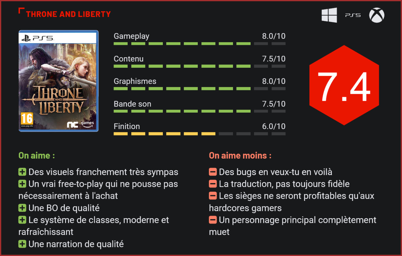 Throne and Liberty est aujourd’hui vendu comme le MMORPG gratuit qui peut (et qui veut) rebattre les cartes. Modèle économique avantageux, open-world ambitieux, que vaut la dernière production Amazon Games ? Après un New World extrêmement prometteur, les studios Amazon Games se devaient de confirmer. Toute jeune filiale du géant de l’e-commerce, cette branche dédiée au développement de jeux vidéo commence à se faire un nom, avec quelques productions de renom, principalement des MMO. Il y avait donc New World, en 2020, qui a rencontré un vif succès, et Lost Ark (2022), dont Amazon n’était pourtant que l’éditeur. Throne and Liberty est donc la dernière entrée du studio, un MMORPG entièrement gratuit. MMORPG et gratuit sont deux éléments qui peuvent aujourd’hui effrayer les gamers. En effet, les MMORPG free-to-play habituels poussaient le joueur à acheter des éléments pour accroître leur progression, avec un fort accent mis sur le pay to win. Avec Throne and Liberty, les développeurs semblent ne pas vouloir de ce modèle économique. La boutique qu’ils proposent in-game fait malgré tout circuler de l’argent réel, mais ces achats ne servent qu’à acheter du cosmétique en jeu. Pas question donc de privilégier ceux qui ont les plus grosses bourses, c’est la progression dans le jeu qui est récompensée. Développé par les sud-coréens de NCsoft, Throne and Liberty est initialement sorti en décembre 2023 dans le pays asiatique. Très vite, il s’impose comme le MMO du moment, avec un scénario habilement écrit qui pousse le joueur à en apprendre davantage sur l’histoire, l’univers et le vécu des PNJ. C’est dans la peau d’un héros, que vous aurez longuement personnalisé depuis l’outil de création de personnage, que vous partirez à l’aventure. L’objectif est simple : retrouver les fragments de l’étoile de Sylaveth tout en affrontant Kazar, l’incarnation du Mal absolu venu pour plonger le monde dans le chaos. Le système de classe habituel laisse ici la place à un système de bonus et de sorts basés sur les deux armes équipées. Tout au long de cette aventure, le titre, agrémenté de cinématiques en aquarelles, nous permet de rencontrer des PNJ attachants, émouvants, surprenants. Il donne beaucoup de saveurs à un scénario intéressant mais au final assez bateau, et nous permet de nous immerger dans un immense monde ouvert qui regorge de surprises et de beautés, bien que finalement très convenu. Les graphismes sont pour leur part assez beau, même très réalistes, apportant énormément à l’immersion. Seul bémol qui vient toutefois nuire à cette dernière : notre personnage principal qui est … muet ! On pensait cette époque révolue, et bien finalement non. Concernant le gameplay, comme tout bon RPG qui se respecte, Throne and Liberty débute avec un outil de création de personnage qui, il faut bien l’avouer, est plus que complet. Mais, et c’est là que se trouve la particularité du titre, on ne vous laisse pas choisir de classe de personnage, et ce, à aucun moment de la partie. Ici, NCsoft a plutôt fait le choix d’une classe de héros définie par les deux armes que celui-ci portera pendant la partie . Chacune dispose de pouvoirs actifs et passifs, ce qui permet au joueur de ne plus être cantonné à une classe plutôt restrictive. Sur la proposition des 7 armes qui est faite au joueur, les combinaisons sont multiples et offrent beaucoup de liberté, avec une arme principale et une arme secondaire. Bâton et arbalète, baguette et dague… Les possibilités semblent presque infinies, et le joueur peut, sur le champ de bataille, switcher entre ses deux armes quand il le souhaite. Il est également possible de changer sa combinaison d’armes à souhait, mais cela se fera au détriment de la progression des armes. En effet, celles-ci gagnent en niveau et en capacités, et changer de combinaison à tout-va réduira drastiquement la vitesse de progression des armes. Les sièges, ultra complets, seront malheureusement trop brouillons pour les joueurs les plus occasionnels. Il faudra avant intégrer une guilde, et la communication avec vos compagnons sera primordiale. Concernant l’aventure, le héros intègrera une guilde avec laquelle il participera… à des sièges. Ceux-ci peuvent réunir jusqu’à 1.000 joueurs, qui s’affronteront pour renverser une forteresse et s’emparer du trône. Les joueurs d’une même guilde devront se coordonner pour attaquer le plus efficacement une forteresse, aidés par des créatures gigantesques qui serviront tantôt de béliers, tantôt de catapultes, tantôt de tours de siège. Une fonctionnalité hyper immersive et réussie, mais qui est à double tranchant. Puisque si ces sièges sont ultra riches et complets, ils nécessitent une parfaite coordination. Alors celui qui sera à fond dans sa guilde et qui s’investira tous les jours y retrouvera son compte. En revanche, le joueur occasionnel qui ouvrira le titre deux ou trois fois par semaine risque d’être complètement paumé. Et force est de constater que quand on se retrouve seul sur le champ de bataille avec cette pléthore de joueurs, on peut vite être perdu. Visuellement, Throne and Liberty est très solide. Le jeu est assez réaliste, avec des cinématiques en aquarelles du plus bel effet. A la lecture de ces quelques lignes, vous pouvez très logiquement penser que Throne and Liberty est assurément le meilleur MMORPG de ces dernières années. Malheureusement, il lui manque encore quelques atouts pour lui conférer ce titre si précieux. Parce que même s’il dispose d’un moteur graphique solide offrant de très beaux panoramas assez réalistes et que la bande originale est d’assez bonne qualité, le jeu pâtit d’un nombre incalculable de bugs. Dans le gameplay d’une part, mais aussi dans la stabilité des serveurs aussi, qui sont totalement aléatoire. Si cela ne demande qu’à ê