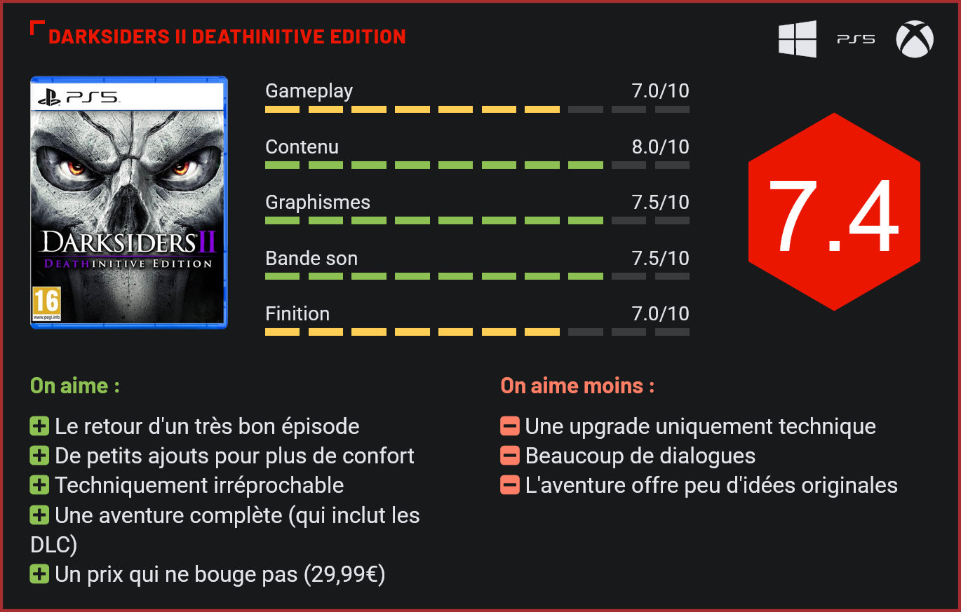 Un peu plus de dix ans après sa sortie originale, le deuxième opus de la saga Darksiders refait surface dans une nouvelle version pour les PS5 et Xbox Series. Cette ressortie fait pourtant suite à un remaster toujours accessible sur les consoles de la génération précédente. Cette seconde “Deathinitive Edition” était-elle vraiment indispensable ? Alors que la licence Darksiders fera son grand retour avec un nouvel épisode dans les années qui viennent, THQ Nordic en profite pour ressortir le second opus… une fois encore. En effet, Darksiders 2 est un titre sorti originellement sur PC, PS3 et Xbox 360 en 2012. Ce dernier a reçu une nouvelle version intitulée “Deathinitive Edition” dès 2015 pour les PC et les consoles de la génération suivante. L’éditeur nous propose à nouveau cette même “Deathinitive Edition”, mais avec de légers changements pour la PS5 et les Xbox Series. Cette upgrade est d’ailleurs disponible gratuitement pour les possesseurs de la version de 2015, et ce, peu importe la plate-forme. La direction artistique du jeu est toujours aussi efficace. Ce deuxième épisode de la licence Darksiders continue l’histoire des Cavaliers de l’Apocalypse dans un monde ravagé où coexistent anges, démons et humains. Alors que War, le précédent protagoniste, est accusé d’avoir déclenché l’Apocalypse trop tôt, Death cherche un moyen de sauver l’humanité et d’innocenter son frère. Pour ce faire, il doit se rendre dans les Terres de la Forge et atteindre l’Arbre de Vie pourtant en proie à une force obscure nommée la Corruption. Darksiders 2 reprend la formule de son prédécesseur en s’inspirant de nombreux jeux d’aventures et d’action. Nous allons explorer un univers proposant des zones un peu ouvertes qui mènent à des donjons bien pensés qui proposent de nombreux combats, des énigmes pour progresser et même des phases de plateforme proche des jeux Prince of Persia. Cette aventure s’éloigne cependant un peu de son prédécesseur en prenant de nombreuses notes sur le genre des Action-RPG, puisque Death possède un niveau, des arbres de compétences et tout un tas d’équipements que l’on peut looter un peu partout. Les donjons font partie des grandes qualités du titre. Le système de combat reste très compétent, tout en restant accessible. Les combats s’apparentent beaucoup à ce qu’on peut retrouver dans des jeux comme les premiers God of War, avec plusieurs types d’armes et de nombreuses possibilités, sans pour autant être aussi complexe que d’autres représentants du genre des jeux d’action comme Devil May Cry par exemple. La formule fonctionne toujours autant aujourd’hui, et paraît même un peu rafraîchissante à une époque où la majorité des Action-RPG ressemblent à des Souls-like. Le titre propose une aventure riche qui nous emmène dans de nombreux lieux différents et qui prend au moins une vingtaine d’heures pour en voir le bout, et beaucoup plus pour tout faire. Les DLC du jeu original sont également présents dans cette nouvelle version. Darksiders 2 est un jeu très efficace à un peu prêt tous les niveaux. Le titre prend place dans un univers assez riche avec un scénario sympathique quoiqu’un peu verbeux (mais accompagné par un doublage en français de bonne qualité). Le travail de remasterisation n’est pas immense, mais le jeu est loin d’être désagréable à regarder. Si cette nouvelle version reste très proche du remaster sorti en 2015, elle offre tout de même de petites améliorations de confort, en particulier sur l’aspect graphique. Le titre n’a pas été entièrement retravaillé non plus, mais une meilleure gestion des ombres, de l’éclairage et l’ajout de ray tracing permet de flatter la rétine à plusieurs reprises. Il faut bien dire que sa direction artistique inspirée des comics tient toujours la route aujourd’hui, il en va de même pour sa bande-son orchestrale qui n’a pas bougé, mais qui est toujours aussi efficace. Cette nouvelle version permet aussi à Darksiders 2 d’atteindre une fluidité irréprochable sur console, le tout affiché en 4K. Les SSD permettent également de rendre les temps de chargements beaucoup moins longs, et les possesseurs de la version PS5 profitent aussi d’une véritable prise en charge de la manette Dualsense et de ses retours haptiques. Si cette Deathinitive Edition ne fait pas passer Darksiders 2 pour un nouveau jeu, elle réussit tout de même à le remettre un peu au goût du jour. Darksiders 2 n’est pas un jeu qui a bouleversé le genre, et il ne propose finalement que peu d’idées originales. La série se repose beaucoup sur ses très nombreuses inspirations, mais ce deuxième jeu reste un très bon épisode de cette licence et un Action-RPG très efficace. Cette nouvelle version n’était pas vraiment indispensable compte tenu des modifications mineures apportées à cette expérience déjà disponibles sur les nouvelles consoles grâce à la rétrocompatibilité, mais elle servira au moins à faire découvrir l’aventure de Death dans de très bonnes conditions, et ce, pour le même prix qu’avant (à savoir 29,99€). Conclusion Près de 10 ans après la “Deathinitive Edition”, Darksiders 2 est encore de retour pour une nouvelle version pensée pour les consoles PS5 et Xbox Series. Le deuxième épisode de la saga de THQ est un Action-RPG très efficace, souffrant de quelques petits problèmes de rythme et d’un cruel manque d’originalité, mais qui reste très bon encore aujourd’hui grâce à une aventure vraiment convaincante et à des donjons réussis. Cette nouvelle version conserve le jeu tel qu’on le connaît, mais propose plusieurs améliorations techniques pour rendre l’expérience plus confortable : un affichage en 4K avec un framerate à 60 images par secondes, une meilleure gestion de l’éclairage et des ombres, du ray tracing, l’utilisation des SSD ainsi que d