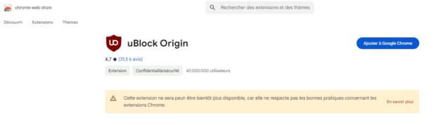 Avec le passage au Manifest V3, plusieurs extensions de Google Chrome ne sont plus compatibles. C’est le cas d’uBlock Origin, un bloqueur de publicités comptant près de 40 millions d’utilisateurs. Sans surprise, la célèbre extension vient de se faire bloquer sur Google Chrome. Le bouton d’ajout est grisé et un texte de mise en garde mentionne la raison de ce blocage. Pour les utilisateurs qui peuvent encore l’ajouter au navigateur, le processus devrait être effectif dans les prochaines heures. Comme le mentionne le store, celle-ci “ne respecte pas les bonnes pratiques concernant les extensions Chrome”. Screenshot pris par nos soins présentant le message d’avertissement lorsque l’extension n’est pas encore bloquée // Crédits – Geeko Cela signifie-t-il pour autant la fin des bloqueurs de publicités ? Non, même si Google lutte activement contre ces derniers, il existe encore des alternatives dont uBlock Origin Lite qui se conforme aux limites du nouveau Manifest. De plus, ces règles touchent principalement les utilisateurs de Google Chrome. Ceux qui passent par un autre navigateur, dont Firefox et Edge, ont toujours le choix dans les extensions de ce genre et peuvent toujours ajouter uBlock Origin. Enfin, rappelons tout de même que les publicités, bien que perçues comme des nuisances par beaucoup d’internautes, restent souvent la principale source de revenus des sites qui les intègrent.