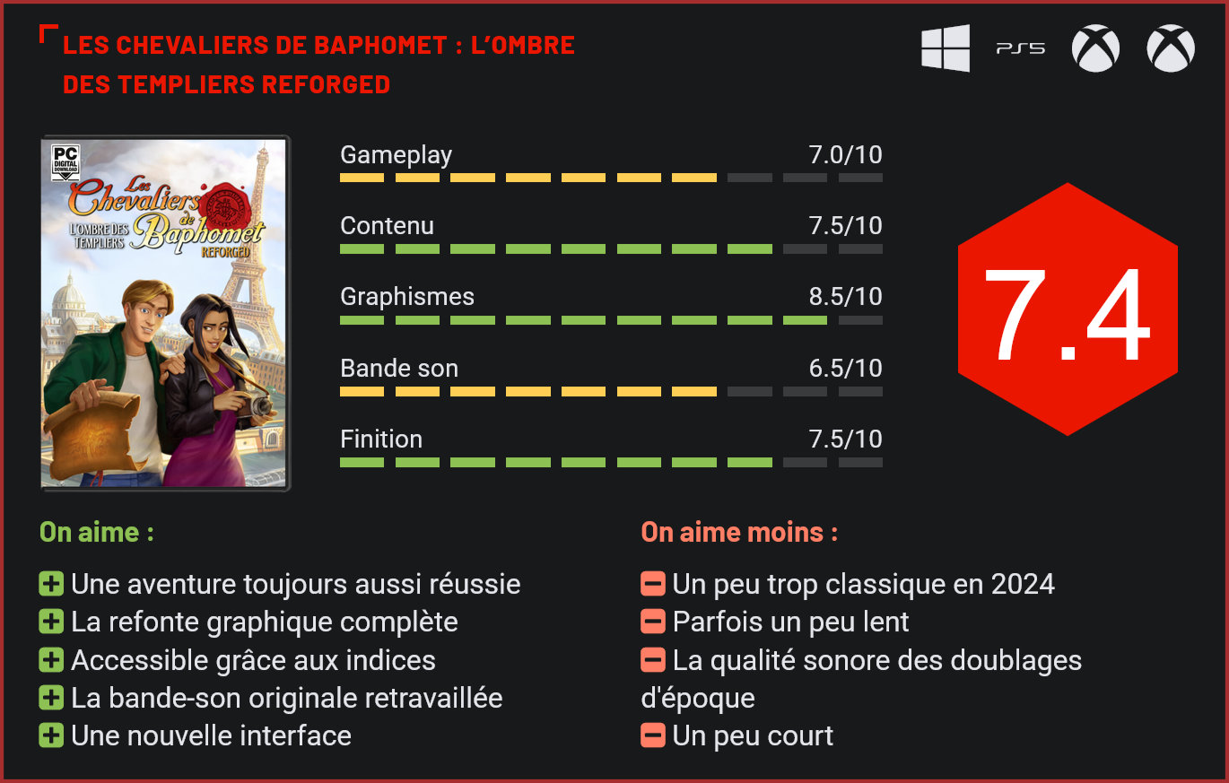 Après de très nombreuses ressorties à travers les années, le tout premier épisode de la licence “Broken Sword” est revenu le mois dernier dans une toute nouvelle version retravaillée. Les Chevaliers de Baphomet : L’Ombre des Templiers Reforged est une refonte qui remet ce point & click culte au goût du jour. La fin des années 90 fut une période importante de l’histoire du jeu vidéo et a vu la naissance de très nombreux titres qui sont restés dans les mémoires. Parmi eux se trouve un certain “Les Chevaliers de Baphomet” (connu à l’international sous le nom “Broken Sword : The Shadow of the Templars”), un point & click sorti en 1996 sur ordinateur et sur Playstation qui est devenu culte avec le temps. Le premier épisode de ce qui deviendra une licence a été plusieurs fois porté sur d’autres machines les années suivantes, mais c’est en ce mois de septembre 2024 qu’a débarqué cette version “Reforged” qui propose de redécouvrir l’aventure de manière plus moderne. Un remaster signé par Revolution Software, le même studio qui a conçu le jeu original. Le titre a bénéficié d’un vrai travail sur ses visuels. “L’ombre des templiers” raconte l’histoire de George Stobbart, un touriste américain fraîchement débarqué à Paris qui devient le témoin d’un attentat. Assis à la terrasse d’un café, George remarque un homme déguisé en clown qui pose une bombe dans l’établissement. Miraculeusement indemne, notre protagoniste se retrouve mêlé à cette affaire que la police ne semble pas trop prendre au sérieux. À l’aide d’une journaliste nommée Nicole Collard, le touriste va enquêter par lui-même, ce qui l’entraîne dans une histoire beaucoup plus complexe qu’il ne pouvait imaginer. George va voyager dans différents pays pour percer les mystères de l’ordre des Templiers qui semble avoir un lien étroit avec le meurtre. Les Chevaliers de Baphomet est un point & click au gameplay très classique. Le but va être de se rendre dans différents lieux, de parler à de nombreux personnages pour faire avancer l’intrigue, nous obtenons parfois des objets à présenter pour débloquer de nouveaux sujets de conversation avec les personnages… Ces mêmes objets servent également à résoudre quelques énigmes, il est aussi possible de combiner deux objets pour en obtenir un nouveau qui peut servir. L’aventure reste relativement simple dans son déroulé et reste identique au jeu original. Le gameplay est efficace grâce à une nouvelle interface claire. On regrette tout de même une certaine lenteur dans l’action, mais le tout reste agréable à jouer. Le gameplay reste très classique pour un jeu du genre. Cette nouvelle version propose un mode “classique” permettant de jouer dans les conditions de l’époque ainsi qu’un mode “histoire” qui modernise un peu plus l’expérience. Un système d’indices est aussi disponible pour faciliter certains passages. Ces options permettent de profiter plus aisément de l’intrigue prenante que propose ce premier épisode. Ce scénario est plein de rebondissements, remplis de personnages hauts en couleurs et se permet même quelques messages encore d’actualité, tout ça accompagné d’une écriture avec beaucoup de personnalité et de l’humour. L’histoire est aussi accompagnée d’un doublage intégral en français, le même que dans la version originale. Le choix a été fait de conserver le doublage de l’époque au lieu de tout refaire. Si le jeu des comédiens apporte beaucoup de vie à l’ensemble et est très sympathique à écouter, l’âge de ces enregistrements se ressent à cause de la qualité audio, et ce, malgré un travail de traitement pour rendre ça plus propre. Les musiques sont aussi très efficaces et sont ici des versions retravaillées de la bande-son originale. Mais le gros du travail de cette nouvelle version vient sans aucun doute de ses visuels qui ont été entièrement retravaillés. Que ce soit les décors, les personnages et toutes les petites animations, tout a été refait en gardant l’esprit des graphismes originaux. Cette édition “reforged” nous donne tout simplement l’impression de jouer un dessin animé tant cet aspect est réussi. L’aventure est aussi ponctuée par de véritables séquences d’animations qui s’intègrent parfaitement au reste du jeu. Les plus nostalgiques peuvent aussi passer aux graphismes d’époque via une option du jeu. Proposée pour 29,99€, cette nouvelle édition permet de redécouvrir ce classique du point & click dans de meilleures conditions, mais sans aucune nouveauté pour les personnes qui connaissent déjà. La petite dizaine d’heures nécessaires à la complétion de cet épisode paraîtra peut-être un peu courte et simpliste pour les habitués du genre puisque le gameplay n’a pas bougé, mais elle reste très agréable à parcourir, même trente ans après sa conception. Conclusion Le classique du point & click “Les Chevaliers de Baphomet : L’Ombre des Templiers” est de retour avec une nouvelle version “Reforged” qui, si elle n’apporte finalement que peu de nouveautés, nous permet de redécouvrir cet épisode culte dans de très bonnes conditions. Nous incarnons George Stobbart, un touriste américain de passage à Paris qui survit à un attentat. Notre protagoniste va enquêter sur cette affaire par lui-même sans se douter qu’il s’embarque dans la découverte d’une grande conspiration. Cette aventure reste, encore aujourd’hui, très agréable à parcourir, et son gameplay est toujours très efficace grâce à une nouvelle interface. Le tout reste assez classique pour un jeu du genre, et aussi un peu court, mais quelques ajustements en font une expérience modernisée. Cette nouvelle version a bénéficié d’un retravail complet de ses visuels pour coller aux séquences d’animation. Le résultat est somptueux, en plus d’être accomp