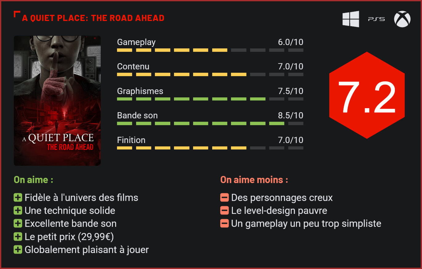 Inspiré de la saga cinématographique A Quiet Place, qui compte déjà trois longs-métrages, The Road Ahead est un jeu horrifique ambitieux, qui parvient à agréablement surprendre dès le premier contact. Elle est désormais bien loin l’époque durant laquelle les adaptations de films en jeux étaient systématiquement des navets. Stormind Games le prouve encore une fois avec The Road Ahead, première adaptation d’A Quiet Place en jeu vidéo. S’il adapte l’univers des films, le jeu propose sa propre histoire, et n’hésite d’ailleurs pas à s’écarter des sentiers battus. On incarne ici Alex, une jeune femme enceinte et asthmatique qui va tenter de survivre au chaos puisqu’elle assiste, incrédule, à l’effondrement de la civilisation. L’histoire ne prend pas directement place le jour de l’attaque mais on revivra certaines bribes du jour 1 à travers l’histoire. Niveau scénario, il ne faut pas s’attendre à des révélations grandioses ni d’ailleurs à des personnages très profonds. C’est le plus gros reproche que l’on adressera d’ailleurs au jeu : les personnes principaux sont creux et n’ont aucun charisme, il est donc très difficile de s’y attacher. En terme de narration et de présentation, le studio a fait de très gros efforts pour nous immerger dans cette histoire, et à défaut d’être charmé par l’histoire, il faut bien admettre qu’on n’a aucun mal à s’immerger dans son univers. La narration est soignée. Fidèle au film, le jeu nous confronte donc à des créatures qui sont attirées par le bruit, et qu’il va falloir éviter à tout prix. Il y aura bien une ou deux séquences de shoot mais globalement, The Road Ahead est plus un mélange de jeu d’horreur et de jeu d’infiltration, finalement pas si différent d’un Alien Isolation. C’est du hide and seek, et on essaye de progresser dans des niveaux assez linéaires en évitant la créature qui nous traque. Il faut le savoir avant de s’y engager, le jeu est très lent. Vous passerez la plupart de votre temps accroupi à progresser pas à pas. Il faudra être très prudent : éviter de marcher trop vite, de marcher sur des bris de verre, de faire tomber un objet, d’être trop bruyant en ouvrant une porte… Le moindre son est susceptible d’alerter la créature. Les monstres sont certes aveugles, mais ne vous attendez pas à une partie de cache cache. Une fois repéré, difficile de se cacher, même en silence, étant donné que les lieux sont généralement assez exigus. Pour progresser dans cette aventure, vous aurez bien sûr quelques outils fort pratiques comme une lampe de poche ou un phonomètre qui vous indiquera votre niveau de bruit. Vous pourrez aussi utiliser certains objets des décors, comme des bouteilles en verre, pour envoyer la créature sur une mauvaise piste. Le jeu repose sur des mécanismes d’infiltration. Autre particularité du jeu : le personnage est asthmatique. Il faudra donc continuellement chercher des médicaments et éviter les endroits poussiéreux comme la peste pour éviter une crise d’asthme qui mènerait à une mort certaine… Dans l’ensemble, les rouages sont bien pensés. On est scotché au pad du début à la fin. Pourtant, il faut bien avouer qu’il manque un petit quelque chose. Côté gameplay, ça reste très simple et surtout le jeu souffre d’un level-design très pauvre avec des zones de jeu toutes petites et généralement un seul chemin balisé. C’est dommage car avec des zones plus larges, plus de choix et d’options dans le gameplay, A Quiet Place aurait été un excellent titre. Côté technique, le jeu se défend d’ailleurs très bien. Les modélisations des personnages, décors, effets visuels, sont très réussis. Sans être une claque, le jeu est beau, voire très beau. La bande son est également solide avec une ambiance pesante, d’excellents effets sonores et doublages. Petit plus : vous pourrez activer le micro pour laisser la créature vous entendre si vous souhaitez ajouter un niveau de difficulté en plus. A ce sujet, la difficulté est extrêmement modulable, vous aurez le choix entre une expérience hardcore et beginner, avec ou sans tous les indicateurs. La créature est aussi effrayante que dans les films. A 29,99€, il faut bien avouer qu’A Quiet Place: The Road Ahead est plutôt une bonne surprise pour les amateurs de jeux d’horreur. L’ambiance est lourde, le concept efficace, le jeu plaisant à parcourir et très joli. Il ne marquera sans doute pas les esprits sur la durée, mais pour une petite production vendue à un tarif réduit, voilà une bien jolie surprise ! Conclusion On n’en attendait pas grand chose et il faut bien avouer qu’A Quiet Place: The Road Ahead est en définitive une très bonne surprise. Tout d’abord parce que le jeu est fidèle à l’univers des films. On se sent vraiment immergé dans cet univers et l’ambiance est soignée. Ensuite, parce qu’il faut bien l’avouer, le jeu sait nous faire peur avec son excellent sound design et sa créature inquiétante. Côté technique, c’est également plutôt une réussite, même s’il ne vous mettra pas une claque. Pad en main, l’expérience de jeu reste plaisante, même s’il faudra composer avec un gameplay un peu trop simpliste et un level-design pauvre. Dommage, car avec quelques efforts de plus, le titre aurait été vraiment bon. A 29,99€, cela reste une excellente option pour se faire peur.