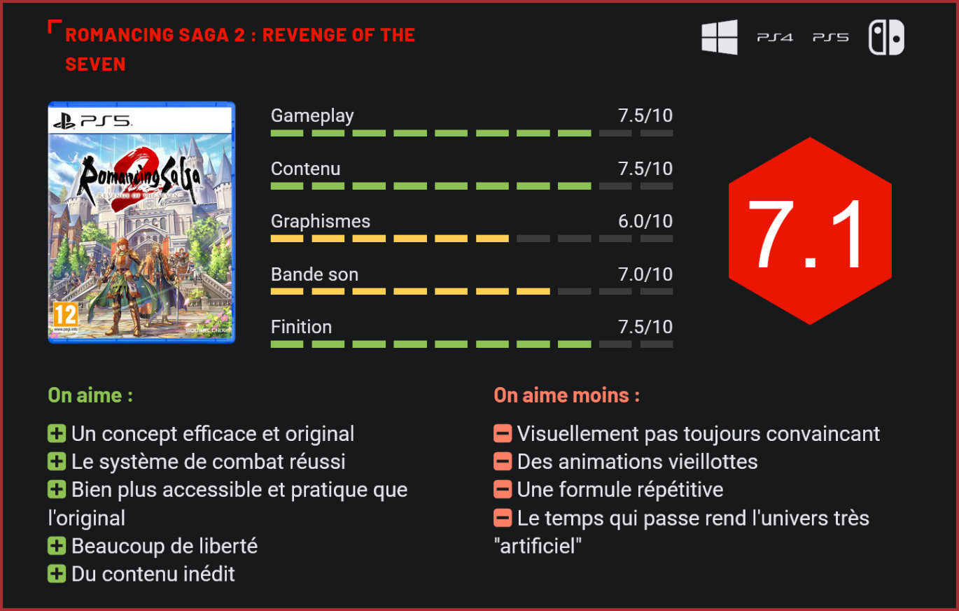 Parmi les nombreuses licences du géant du JRPG, “SaGa” est l’une des moins connues en occident. Square Enix nous propose de revivre un épisode phare de la série à travers un remake complet qui modernise cette expérience qui date de 1993. Entre les projets ambitieux comme les Final Fantasy, Square Enix propose des titres plus modestes de leurs licences moins connues. C’est le cas depuis quelques jours avec l’arrivée de “Romancing SaGa 2 : Revenge of the Seven”, un remake du titre du même nom sorti sur les Super Nintendo japonaises en 1993. Si cet épisode avait déjà eu droit à un remaster très proche de la version originale en 2017, le sujet du jour est une refonte intégrale de Romancing SaGa 2, proposant de parcourir son univers en 3D et dans une formule un peu retravaillée et plus accessible. Le résultat n’est pas des plus convaincants sur tous les aspects, mais le concept du titre est toujours aussi efficace près de trente ans plus tard. Romancing SaGa 2 est ici entièrement réimaginé en 3D. Dans Romancing SaGa 2, nous incarnons Gérard, le jeune prince du royaume d’Avalon. Après plusieurs expéditions formatrices accompagnées du roi Léon et de sa garde rapprochée, notre royaume se fait attaquer par une horde de monstres à la solde de Kzinssie, l’un des sept héros légendaires ayant sauvé le monde par le passé. Cet ancien héros devenu une créature maléfique parvient à tuer le roi, ce dernier nous transmet alors magiquement son savoir et ses compétences. Notre personnage commence alors une aventure pour vaincre les sept héros de la légende et sauver le monde. JRPG plutôt old-school oblige, le titre ne propose pas un scénario très profond, malgré un bel effort pour nous conter l’histoire des sept héros. Romancing SaGa 2 se concentre plutôt sur son gameplay et ses nombreuses idées intéressantes. En tant que souverain, nous pouvons explorer plusieurs villages qui servent surtout à se préparer avant d’aller explorer des donjons. C’est à nous de former notre équipe de cinq personnages parmi une sélection variée et de financer leur équipement avant de partir en exploration. Nous pouvons aussi développer notre royaume et les services qu’il propose en finançant différents établissements. Le titre nous laisse parfois faire des choix qui vont un peu changer le cours des évènements, cette aventure s’étend en réalité sur plusieurs générations puisqu’une ellipse temporelle a lieu après un certain nombre d’actions et nos choix ont de l’impact sur le déroulé. Si le gameplay du titre fonctionne de manière assez classique, proposant un système de combat au tour par tour, cet épisode embarque tout un tas de particularités qui bouleversent beaucoup cette formule. À commencer par l’évolution des personnages qui se fait différemment de ce dont on a l’habitude dans le genre. Ici, les héros n’ont pas de “niveau” à proprement parler, leurs statistiques et maîtrises d’armes évoluent lorsqu’ils les utilisent en combat. Plus un personnage utilise une épée, plus il sera efficace avec ce type d’arme. De nouvelles compétences peuvent aussi s’obtenir en plein combat. Effectuer certaines actions marquées par une ampoule peut, avec un peu de chance, provoquer une “lueur d’inspiration” qui octroie une nouvelle attaque à notre personnage. Malgré leur côté un peu old-school, les combats savent rester rapides et agréables tout en demandant de la réflexion. Nous pouvons également lancer une attaque coordonnée en dépensant une jauge qui se remplit en exploitant les faiblesses des ennemis. Le titre offre une belle liberté pour faire évoluer notre équipe. Les faiblesses sont d’ailleurs une véritable priorité dans un titre comme celui-là ou la difficulté reste souvent élevée. Disponible dans un mode “classique” reproduisant la difficulté de l’époque, dans un mode normal ou dans un mode facile bien plus abordable, Romancing SaGa 2 reste un jeu exigeant. Dépendant de la difficulté, les choses peuvent très vite mal tourner, sans oublier que les personnages sont soumis à un système de mort permanente. Tous possèdent des “PC” qui diminuent à chaque mort. Une fois tombé à zéro, le personnage est définitivement perdu. C’est aussi valable pour notre personnage principal qui, lui, sera remplacé par un nouveau souverain de notre choix qui héritera de ses capacités. Le principe fonctionne très bien et reste, encore aujourd’hui, plutôt original. Le titre est un peu décevant visuellement. Les décors du jeu original ont été entièrement réimaginés en 3D de manière efficace, mais ce remake n’a pas été développé avec un immense budget. Cela se ressent surtout dans ses décors techniquement un peu vieillots et dans les animations des personnages pas toujours très convaincantes, mais la direction artistique très colorée rattrape un peu le résultat. La bande-son se montre par contre vraiment très accrocheuse, en particulier les thèmes de combat. Les musiques originales ont été entièrement retravaillées, mais les plus nostalgiques pourront écouter les compositions de 1993 en passant par le menu option. Les combats de boss représentent de sacrés défis. Malgré un côté “punitif”, ce remake réalise tout un tas de petits changements pour rendre ses systèmes beaucoup plus agréables et accessibles qu’auparavant (en nous donnant beaucoup plus d’informations par exemple). En ligne droite, l’aventure propose déjà plusieurs dizaines d’heures, mais ses différents systèmes permettant d’avoir des équipes et déroulés différents lui offrent une belle rejouabilité. Ce remake propose également du contenu supplémentaire inédit une fois l’aventure terminée. De quoi contenter celles et ceux qui cherchent encore plus de challenge grâce à un new game + débloquant de nouvelles difficultés. On peut tout de même lui reproc
