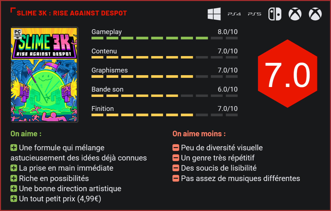 Après deux jeux dans le même univers, le studio Konfa Games propose un nouvel épisode qui s’inspire cette fois du genre encore très récent qu’est le survivors-like. Slime 3K : Rise Against Despot est une itération très réussie de ce style de jeu. Konfa Games est un petit studio indépendant connu pour avoir développé quelques jeux qui ont leur univers en commun, mais qui s’essayent à des genres différents. En 2018 paraissait “Despotism 3k”, un jeu de gestion avec beaucoup d’humour. Il a ensuite été suivi par l’auto battler stratégique “Despot’s Game” sorti en 2021. Depuis 2023, le studio s’attaque au survivors-like avec la sortie de l’accès anticipé de Slime 3K : Rise Against Despot. Après une grosse année de mises à jour, le titre est disponible en version 1.0 sur PC, mais également sur Switch, consoles Xbox et Playstation. Ce nouveau jeu reprend beaucoup d’idées d’autres titres, mais les retravaille à sa manière. Slime 3K se déroule dans le même univers que les précédents jeux du studio. Nous incarnons cette fois un slime, une créature faite d’une substance gluante permettant de créer des humains artificiels et qui est devenue consciente de sa propre existence. Notre slime va se retourner contre son créateur, l’IA maléfique qui gouverne le monde. Le contexte scénaristique est extrêmement léger, voire limite inexistant, puisque le jeu se contente de nous envoyer survivre dans des niveaux. Slime 3K est un titre qui s’inspire beaucoup de jeux comme Vampire Survivors. C’est donc un rogue-like nous demandant de survivre à des vagues d’ennemis durant un temps déterminé dépendant du niveau sélectionné. En effet, le titre se divise en une vingtaine de niveaux aux configurations différentes, même si un mode infini est déblocable après un certain temps. Manette en main, nous pouvons déplacer notre personnage et viser manuellement dans toutes les directions (ce qui n’est utile que si nous sommes équipés d’une arme de visée, la majorité des capacités s’activent automatiquement). Dans ces arènes apparaissent aussi des bonus permettant de regagner de la santé, de gagner plus d’argent, mais plus important encore, d’accéder à une boutique permettant d’acheter des améliorations. Ces dernières sont véritablement le cœur du jeu puisqu’elles donnent de la puissance de feu à notre personnage, que ce soit directement avec des armes, en invoquant des sous-fifres, grâce à différentes sortes d’avantages passifs… La prise en main est on ne peut plus simple. Acheter plusieurs exemplaires de la même capacité permet de l’améliorer, mais il faut aussi faire attention à notre inventaire dont l’espace est limité. Le but est alors de se construire un arsenal qui tienne assez la route pour survivre, et si vous avez un bon build, pour annihiler toute forme de vie dans l’arène. Le titre va un peu chercher aussi du côté des jeux de type “deckbuilders” puisque chacune des améliorations est représentée par une carte qu’il faut au préalable équiper dans un menu dédié. Nous devons alors construire nos “deck” et en sélectionner un qui servira pour la prochaine partie, les cartes contenues dans le deck seront celles que les boutiques proposeront aléatoirement. Ces cartes proposent aussi un système de rareté. Plus les cartes sont rares, plus elles sont puissantes, mais moins elles ont de chances d’apparaître dans les boutiques, à moins de dépenser notre argent pour améliorer cette dernière. La formule a déjà fait ses preuves dans d’autres titres et se montre toujours très efficace ici, peut-être même plus encore grâce aux petits changements apportés par le jeu. Plus que jamais, nos décisions ont un sérieux impact sur le déroulé d’une partie. Doit-on prendre telle ou telle amélioration ? Doit-on améliorer la boutique pour avoir plus de chances de tomber sur des cartes rares ? Comment gérer notre inventaire ? Des questions que posent d’ailleurs implicitement les différents niveaux qui, s’ils ne varient que très peu esthétiquement, proposent des défis qui nous forcent à nous adapter en utilisant différents types de build et approches. Le mélange avec des éléments de deckbuilder est une très bonne idée. Comme dans les autres jeux du genre, le titre se montre souvent très difficile au départ, mais offre des parties véritablement jouissives lorsqu’on en comprend les mécaniques et lorsqu’on prend les bonnes décisions. La difficulté s’estompe avec le temps puisque Slime 3K est aussi un rogue-lite qui propose quelques mécaniques de progression sur le long terme. Il est possible de trouver de l’ADN durant nos parties, ADN qui peut être dépensé dans des améliorations définitives. Notre score est aussi ajouté à une barre de progression à chaque fin de partie qui débloque de nouvelles capacités. S’il tire beaucoup d’idées de jeux comme Vampire Survivors, Slime 3K en reprend aussi son modèle économique extrêmement accessible. Que ce soit sur consoles ou sur PC, le jeu est disponible pour la toute petite somme de 4,99€, un tarif peut-être justifié par son principe très répétitif et son contenu recyclé à l’infini, mais qui tiendra tout de même plusieurs dizaines d’heures dans les mains des fans du genre. Tout comme les bons survivors-like, Slime 3K est un jeu très addictif et généreux en possibilités, ce qui nous pousse sans cesse à y retourner. L’action est parfois un peu difficile à suivre. Le titre se montre visuellement très charmant aussi, réalisé entièrement en pixel art, même si les habitués des jeux du studio reconnaîtront tout un tas de personnages et d’éléments graphiques déjà utilisés dans les précédents. Le jeu souffre cependant d’un véritable souci de lisibilité lorsque les parties s’éternisent et que nos builds sont complets. Nous pouvons considérer Slime 3K comm