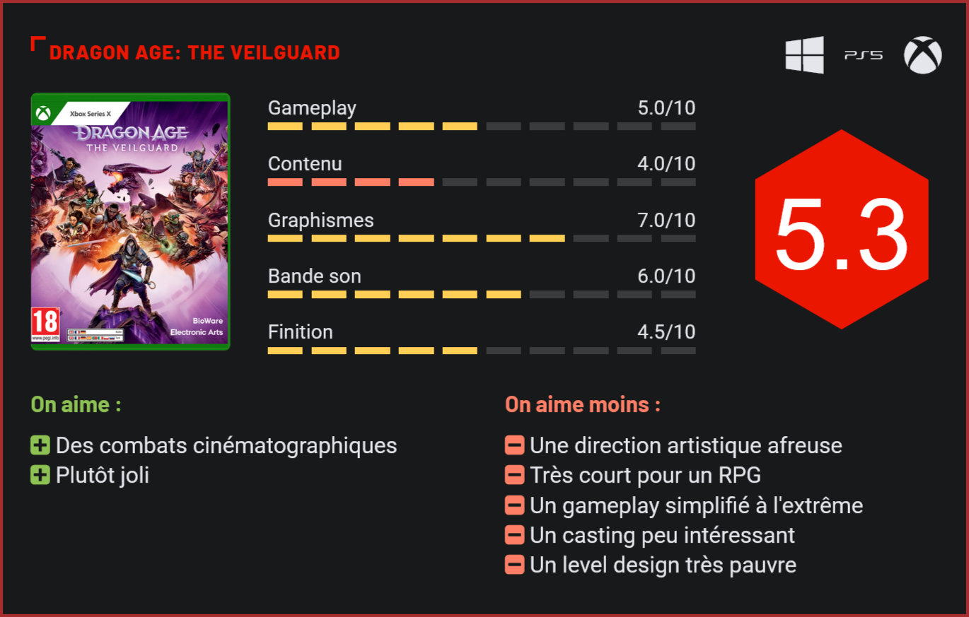Attendu au tournant par les fans de la série, qui n’avaient plus eu droit à un nouvel opus depuis 2014, Dragon Age The Veilguard représente un tournant dans l’histoire de la franchise de BioWare. Le prestigieux studio, qui cumule les faux pas depuis quelques années, nous livre son plus mauvais jeu depuis sa création. Il en aura décidément fait couler de l’encre, ce nouvel épisode de la légendaire saga des Dragon Age. Avec ses couleurs mauves à tout va, ses personnages “non-binaires”, ses dialogues bien-pensants et son character design “innovant”. C’est un fait, le jeu a divisé les foules avant sa sortie. BioWare n’a pas hésité à se mettre à dos une grosse partie de la communauté de fans pour cibler un nouveau public. Un choix audacieux qui s’explique par les difficultés, en 2024, à rentabiliser un jeu triple-A. Mais au-delà de ces explications pour “pourquoi autant de haine ?” pour ce jeu, il y a surtout le parcours atypique du studio… Fondé il y a 29 ans déjà, BioWare est l’un des plus prestigieux studios de développement occidentaux spécialisé dans les jeux de rôle. Il a à son palmarès des classiques du RPG comme Baldur’s Gate, Star Wars: Knights of the old republic, Jade Empire, la trilogie Mass Effect et les Dragon Age, une série de jeux de rôle médiévaux qui a rencontré un joli succès commercial malgré un succès critique “mitigé” – les jeux étaient considérés comme globalement bons par la presse, mais n’ont jamais décroché des notes comparables à d’autres classiques du genre comme The Elder Scrolls. Niveau casting, nous ne sommes pas gâtés. Il y a quelques années, alors que le troisième volet de la série venait d’être annoncé, deux fondateurs du studio ont annoncé leur départ, et d’autres ont suivi. Les choses se sont compliquées ensuite avec l’annulation d’un premier projet “Shadow Realms” en 2014, les départs de la plupart des développeurs de la série Mass Effect, puis une réorganisation majeure chez EA, qui a conduit à la fusion de différentes équipes. Et en 2017, c’est le drame. Le nouveau Mass Effect fait un flop, malgré quelques qualités. Le titre n’est pas à la hauteur des attentes et le studio BioWare est relégué au statut de studio de “support”. Une nouvelle vague de départs s’en suit. En 2020, il ne reste pratiquement plus aucun développeur qui était présent au sein du studio en 2015. Et c’est la différence cruciale qui explique ce changement radical de cap avec Dragon Age: The Veilguard. Tout d’abord, il s’agit d’un management différent, qui suit une direction artistique différente. Ensuite, niveau expérience, la nouvelle équipe n’a pas le niveau des anciens. Il y a d’ailleurs un changement radical de cap qui s’opère en cours de développement (du RPG à l’action-RPG pur), et même un changement de nom du projet. Tout cela nous permet aujourd’hui d’un peu mieux comprendre pourquoi The Veilguard est si différent des précédents opus. Les combats sont souvent très fouillis. Car, très clairement, c’est une cruelle désillusion qui attend les fans dans cet épisode. Le jeu adopte un level-design extrêmement linéaire, un style graphique cartoonesque aux antipodes du style très sombre et mature des premiers volets, un casting qu’on croirait presque tout droit sorti d’une série Netflix, et surtout un gameplay beaucoup plus accessible, axé sur l’action et uniquement l’action. Dragon Age n’est clairement plus un RPG. Certes, il est possible de créer son propre personnage avec un éditeur très complet, celui-ci évoluera au fil de l’aventure avec un gain d’expérience, des compétences à débloquer et un équipement à améliorer. Des éléments typiques des RPG. Mais dans la pratique, on est loin du Dragon Age d’autrefois. Le jeu est beaucoup plus simple d’accès, plus cinématographique aussi (et là il s’agit d’un vrai plus), plus facile aussi et surtout construit de façon beaucoup plus linéaire. Alors certes, Dragon Age, ça n’a jamais été Skyrim. Mais tout de même, là on parle de longs couloirs de 3 ou 4 mètres de large, de combats en arènes et de chemins ultra-balisés, au point qu’on en viendrait presque à se demander si le jeu n’est pas devenu un simple hack & slash avec quelques éléments de RPG. Les quelques combats de boss auxquels vous participerez ne vous marqueront pas… Pad en main, le scepticisme s’empare de nous. La première chose qui nous choque, c’est sa linéarité extrême. The Veilguard essaye de nous faire croire à un open world, mais au mieux, vous pourrez emprunter divers chemins dans des micro mondes ultra-balisés, une fois certaines compétences acquises. Les missions principales vont droit au but : on traverse un niveau en ligne droite en massacrant tout ce qui bouge, et surtout, le level-design est atrocement primaire : aucune surprise à l’horizon, aucune verticalité non plus, peu d’usage des compétences, les mécanismes sont systématiquement les mêmes. En terme de structure, The Veilguard est très mauvais. Et c’est un bien faible mot. Car pour ce qui est de sa quête principale, le titre est court. Comptez 9 à 12h tout au plus. 20h si vous tentez de réaliser les quêtes secondaires – fort peu intéressantes au demeurant. Il y a quelques jolis panoramas à observer. Plus surprenant, sur le plan narratif, le jeu est certes soigné dans sa présentation avec de nombreuses cinématiques joliment mises en scène, mais les dialogues sont souvent très creux au point qu’on finira vite par tous les passer, les embranchements narratifs ne sont pas intéressants, les personnages sont ultra-caricaturaux et ennuyeux au possible, et l’intrigue principale peine à vraiment nous captiver. Le ton mature des anciens opus semble avoir totalement disparu. Même constat pour ce qui est de la direction artistique, avec des coloris mauves à