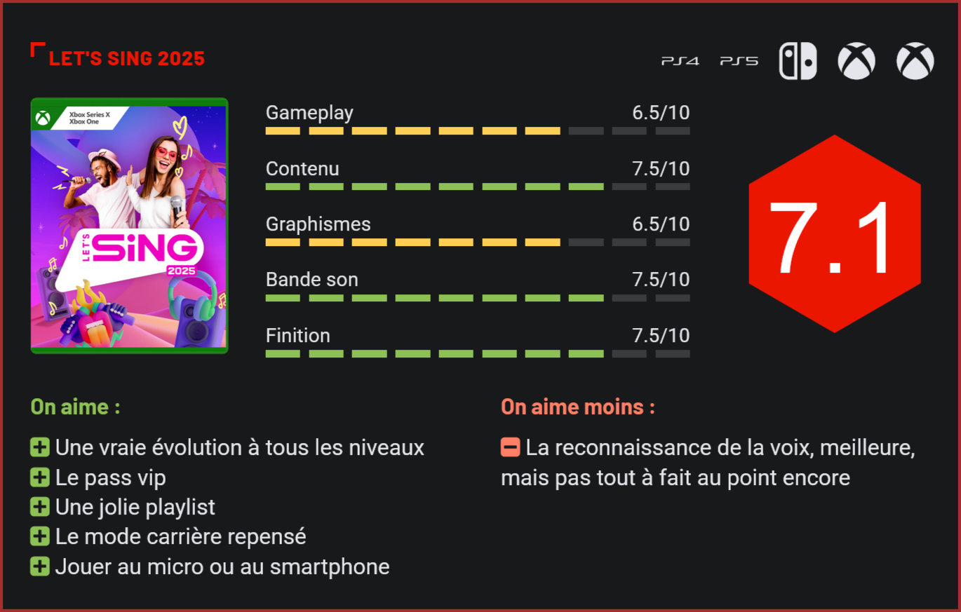 Cette fois, c’est la bonne ! Avec sa cuvée 2025, Voxler propose enfin un vrai changement pour la formule Let’s Sing, avec l’introduction d’un pass VIP qui donne accès à un catalogue de pas moins de 151 morceaux. Cela faisait quelques années que la formule Let’s Sing avait tendance à stagner. Mais avec l’épisode 2025, Voxler apporte enfin les grands changements tant attendus. Dernier représentant du genre “karaoké” sur consoles, Let’s Sing 2025 s’inspire de Just Dance pour son modèle économique avec un jeu payant qui comprend une quarantaine de musiques et un pass VIP payant lui aussi, au mois à 3,99€ ou à l’année à 24,99€, qui donne accès à pas moins de 151 titres additionnels. Les clips sont à nouveau mis à l’honneur Par défaut, la playlist du jeu est déjà assez réussie, puisqu’on retrouve 20 titres francophones et 20 hits internationaux pour la version FR, et pas moins de 40 hits internationaux pour la version internationale. Vous retrouverez ci-dessous la playlist : 1. Beautiful Things – Benson Boone 2. yes, and? – Ariana Grande 3. What Was I Made For? – Billie Eilish 4. Lose Control – Teddy Swims 5. Good 4 U – Olivia Rodrigo 6. Love Yourself – Justin Bieber 7. I Ain’t Worried – OneRepublic 8. Strangers – Kenya Grace 9. Zombie – The Cranberries 10. The A Team – Ed Sheeran 11. Stolen Dance – Milky Chance 12. (It Goes Like) Nanana – Peggy Gou 13. Everytime We Touch – Cascada 14. Forget Me – Lewis Capaldi 15. If We Ever Broke Up – Mae Stephens 16. Standing Next to You – Jung Kook 17. Dog Days Are Over – Florence + The Machine 18. Dancing in the Moonlight – Toploader 19. Cupid – FIFTY FIFTY 20. Uprising – Muse 21. Un jour je marierai un ange – Pierre de Maere 22. La symphonie des éclairs – Zaho de Sagazan 23. Amour toujours – Clara Luciani 24. Laisse-Moi – Keblack 25. Amour Plastique – Videoclub 26. Kid – Eddy De Pretto 27. Pardonne-moi – Louane 28. Et Bam – Mentissa 29. Dépassé – Nuit Incolore 30. Envole-moi – Jean-Jacques Goldman 31. Popcorn Salé – SANTA 32. Hakuna Matata – Le Roi Lion 33. Machistador – M 34. Celui qui part – Joseph Kamel 35. Impala – Adèle Castillon 36. Comment on fait – Vianney, Zazie 37. Dernière Danse – Kyo, Coeur de Pirate 38. Papaoutai – Stromae 39. C’est la Vie – Mika 40. L’amour – Christophe Maé, Amadou & Mariam La playlist fait mouche A tout cela viennent donc s’ajouter 151 morceaux additionnels avec le pass VIP, qui est proposé à un tarif attractif et en deux options avec un paiement au mois ou à l’année. On notera au passage qu’un mois d’essai est offert à l’achat et que Voxler promet de faire évoluer l’offre avec de nouveaux tubes. C’était de loin le changement le plus attendu par les fans. L’autre grosse évolution est à trouver au niveau de l’interface, avec la remise en avant des clips. Avec les précédentes éditions, ceux-ci avaient été relégués au second plan et il faut bien avouer que globalement, ce n’était pas très joli. Let’s Sing 2025 remet les choses à l’ordre avec une interface plus soignée, plus moderne aussi, et qui met mieux en avant les clips. On retrouve aussi quelques classiques dans les morceaux proposés. Et puis, il y a le mode carrière, qui a lui aussi été repensé. Les avatars sont plus réussis que par le passé, la progression est moins ennuyeuse et globalement, l’aventure est plus plaisante à parcourir avec des défis bien dosés. On retrouve tous les autres modes de jeu habituels, les fans ne seront donc pas surpris. Comme les précédents opus de la franchise, il est d’ailleurs possible de jouer à ce Let’s Sing 2025 au micro ou avec son smartphone, via l’app. Pratique pour chanter à plusieurs sans devoir se ruiner ! Conclusion Avec cette cuvée 2025, Voxler semble avoir enfin trouvé LA formule idéale avec un pass VIP qui permet d’ajouter 151 morceaux à la déjà très bonne playlist de 40 titres, pour seulement 3,99€ le mois ou 24,99€ l’année. L’offre est avantageuse, surtout qu’on a déjà droit à un mois de VIP gratuit à l’achat du jeu… Les évolutions ne s’arrêtent pas là puisque l’interface a été joliment modernisée, les clips sont ENFIN remis en avant et surtout le mode carrière a été repensé pour être globalement plus intéressant. Let’s Sing 2025 s’impose sans difficulté comme le meilleur jeu de karaoké du marché, faute – il est vrai aussi – de concurrents. Il n’empêche que cette cuvée 2025 fait quelques pas dans la bonne direction tout en corrigeant les plus gros défauts des précédents volets…