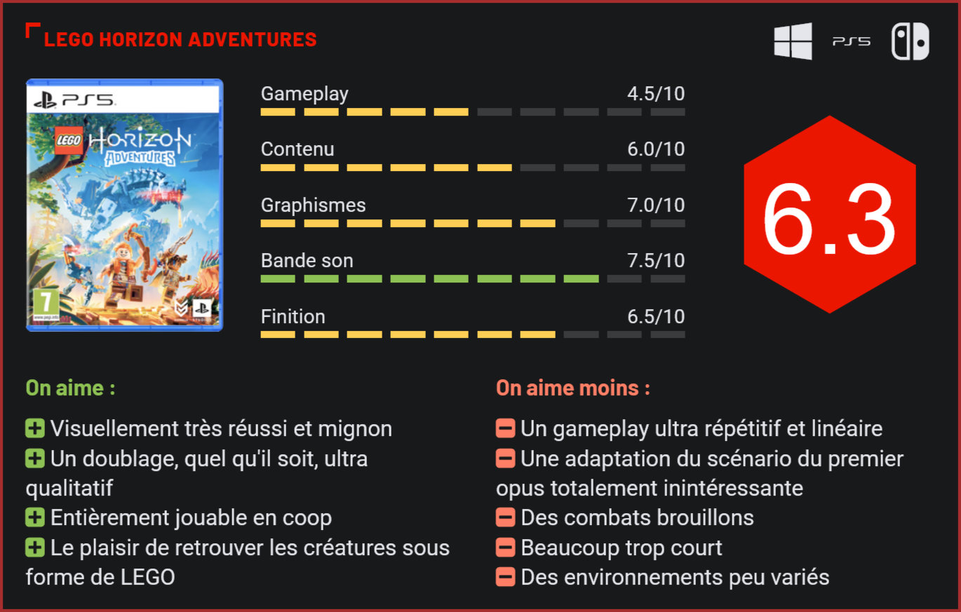 Quelques semaines à peine après la sortie du remaster de Zero Dawn sur PS5, la franchise Horizon profite d’une adaptation originale en … LEGO. Aloy et la tribu Nora en petits bonshommes LEGO, ce n’est probablement pas l’adaptation que l’on se réjouissait le plus de voir. Et pourtant. Annoncé il n’y a que cinq mois en juin dernier, le titre se présente comme une libre adaptation du premier épisode, Zero Dawn, qui s’adresse aux nouveaux utilisateurs, et notamment les enfants. Le titre sortira même sur Nintendo Switch afin de cibler “un public familial et un public plus jeune” se justifiera Sony. L’objectif est donc clair : qu’Horizon soit jouable pour des enfants ! Les petites briques LEGO étaient donc toutes trouvées pour ce type d’adaptation. C’est ainsi qu’Aloy, Rost, la tribu Nora et les animaux robotiques du monde d’Horizon sont transformés en personnages composés de briques. Si cette adaptation a plutôt bien marché pour Star Wars, Indiana Jones ou encore Harry Potter, vous allez voir que c’est moins le cas pour Horizon. Le scénario original du premier volet est réécrit pour l’occasion. Les développeurs ont voulu proposer une histoire moins tragique et plus légère, avec quatre personnages principaux : Aloy, Rost (puis Teersa), Erend et Varl. Comme dans toutes les adaptations LEGO, Horizon Adventures mise tout sur l’humour et la légèreté des personnages, qui ne se prennent absolument pas la tête et tournent tout en ridicule. Ça ne plaira pas à tout le monde. Ainsi, ceux qui ont déjà fait le jeu original vont très clairement passer leur chemin face à une adaptation qui frôle le ridicule. En revanche, les enfants pourraient prendre du plaisir en découvrant une histoire qui semble réécrite pour eux. Les célèbres créatures du titre original sont de retour pour une aventure unique pleine de légèreté. Si la réécriture du scénario divisera à coup sûr les fans de la première heure, ce sera également le cas de la direction artistique. Sans surprise, un univers fait de LEGO s’adresse principalement aux enfants. On se retrouve avec des décors ultra colorés et lumineux, mais qui ressemblent également à des jouets. Et pourtant, c’est potentiellement ce qui fait le charme de cet Horizon Adventures. C’est le jeu estampillé LEGO le plus beau qui ait jamais été développé. D’une fluidité remarquable, le titre et ses détails se laissent admirer à chaque instant, et l’on se surprend même à rechercher les paysages qui étaient déjà présents dans le Horizon Zero Dawn d’origine. Paysages très jolis, mais également bande sonore de qualité. Des mélodies toutes plus justes les unes que les autres aux doublages VF et VO, jamais Horizon Adventures ne nous aura semblé vouloir en faire de trop ou être à côté de la plaque. Une qualité rare pour un jeu LEGO. En revanche, on ressent très vite une certaine paresse de la part des développeurs dans la variété des environnements. On en dénombre quatre, représentant chacun un des chapitres du titre, composés de missions de moins de 10 minutes chacune, ce qui est très court. Et le problème, c’est que les paysages semblent identiques. Il faut alors attendre le chapitre suivant pour espérer un renouvellement du décor. Visuellement, on est clairement sur la plus belle aventure LEGO. Du côté du gameplay, enfin, c’est une véritable catastrophe. Le lore d’Horizon étant moins vaste que certaines licences précédemment adaptées en LEGO, comme Star Wars ou Harry Potter, le gameplay n’est pas le même que dans les précédentes adaptations. Ici, nous n’avons pas de niveaux en monde ouvert dans lesquels on peut incarner n’importe quel personnage issu de la licence. Ici, le jeu est réparti en quatre chapitres, dans lesquels on retrouve des niveaux sans grand intérêt. L’objectif est clair : à la fin de chaque niveau, nous récoltons une brique dorée servant à reconstruire le Cœur de la Mère, le village emblématique d’Horizon, attaquée au début de l’aventure par la tribu Carja. Ces niveaux font office de couloirs dans lesquels on récolte des tenons en bronze, en argent et dorés. Ces tenons nous servent alors à améliorer nos héros avec divers bonus, comme un gain de vie, mais également à acheter des éléments cosmétiques pour nos quatre héros. L’intérêt est ici purement esthétique et ne change en rien le gameplay. Les costumes proposés sont en revanche assez sympathiques, puisque ça va des costumes Ninjago à ceux de LEGO City, comme un costume hot dog ou celui d’un policier. Plutôt cocasse dans un univers comme Horizon. C’est notamment ça qui devrait déplaire aux fans … Le gameplay s’inspire de celui des jeux originaux. Il manque toutefois de profondeur et est ultra répétitif. Pour ce qui est du reste du gameplay, les développeurs semblent avoir voulu récupérer quelques idées des précédents opus. Le focus sert à détecter les points faibles des créatures, les hautes herbes à se cacher des animaux et des ennemis, et l’escalade fait partie intégrante de l’aventure. Malheureusement, votre expérience s’arrêtera là. LEGO Horizon Adventures n’est absolument pas varié dans son expérience de jeu. Parce que le gameplay se résumera à se battre avec les ennemis en martelant la touche d’attaque et … c’est tout. Les personnages peuvent obtenir des armes plus rares que l’on obtient en montant de niveaux. Là aussi, c’est un point qui change par rapport aux autres jeux LEGO, puisque vous acquérez de l’expérience permettant de gagner en niveaux et, là aussi, en bonus (cœurs de vie, défense et attaque). Comme dans tous les jeux LEGO, la possibilité nous est donnée de jouer en coopération avec un ami ou un enfant. C’est assez fun et sympa manette en main, mais ça apporte beaucoup à la confusion déjà omniprésente lors des combats, extrêmement brouillons. Conclu