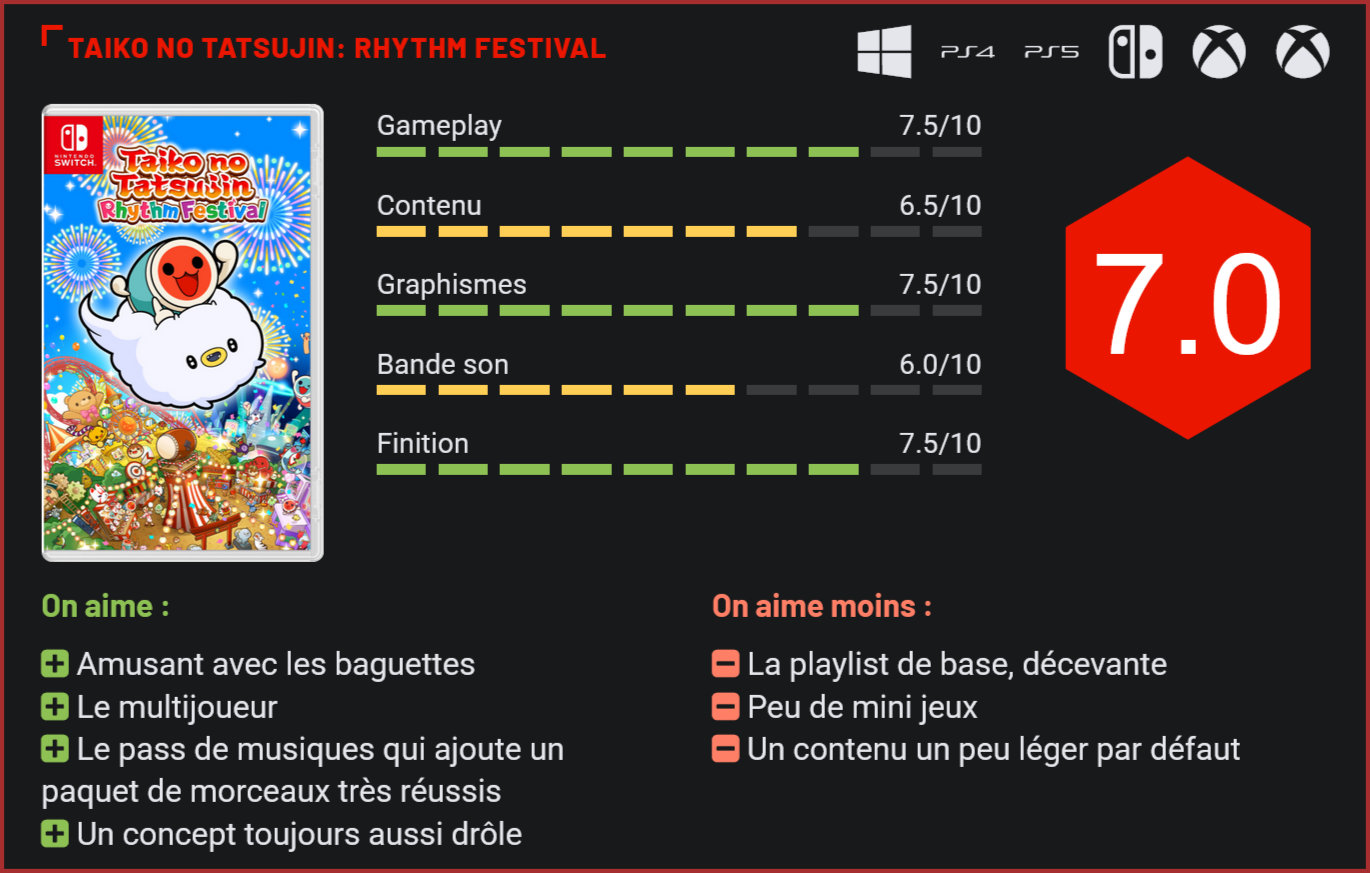 Après le réussi Drum ‘n fun, la série des Taiko no Tatsujin revient avec un nouvel épisode baptisé Rythm Festival. Les jeux musicaux ont de nouveau la cote. Namco Bandai l’a bien compris et nous livre un second Taiko no Tatsujin sur PC et consoles en l’espace de 10 ans. Le précédent volet, Drum ‘n fun, avait plutôt bien réussi son coup, en particulier sur Switch, avec son petit tambour. Avec Rythm Festival, Namco Bandai livre un opus en simultané sur toutes les machines. Et pas mal de nouveautés attendent les fidèles… Le jeu reste très coloré. Avant d’aller plus loin, il convient toutefois de revenir sur le concept très particulier de ce jeu, qui se présente comme un jeu musical dans lequel le joueur doit taper en rythme sur son tambour – soit à l’aide d’un tambour en plastique, soit au pad. L’essentiel du jeu repose sur le Taiko mode, sorte de mode d’entrainement qui fait aussi office de mode solo. Le joueur choisit son morceau, la difficulté, et c’est parti. Plus la difficulté est élevée, plus il y aura bien sûr de complexité dans le gameplay. De façon générale, il faudra toutefois tapoter en rythme avec ses baguettes ou ses doigts en réalisant des enchainements et en se laissant parfois décoller dans un solo infernal pour emmagasiner un maximum de points. L’expérience de jeu sera très différente si vous y jouez au tambour ou au pad – qui est forcément beaucoup moins fun. C’est forcément beaucoup moins fun au pad… En-dehors du mode Taiko, on retrouve un mode multijoueur et un mode party game. Dans celui-ci on retrouve quelques défis fort sympathiques comme des duels dans lesquels réaliser des enchainements vous permettra de faire chuter la barre de vie de votre adversaire. Sympathique. Par défaut le jeu propose une septantaine de morceaux, ce qui peut paraître assez énorme… Il faut le savoir toutefois, les morceaux sont en réalité davantage des extraits très courts et surtout la playlist est essentiellement composée de morceaux made in Japan qui ne sont absolument pas connus chez nous, voire de quelques morceaux de musique classique et de musiques de jeu réorchestrées. Une playlist typiquement otaku qui fonctionne quelques minutes, mais dont on se lasse toutefois très vite… Et c’est d’ailleurs voulu puisque cet épisode introduit un pass payant ainsi que des DLC qui viennent considérablement élargir la playlist et qui se montrent globalement beaucoup plus intéressants puisqu’on retrouve des morceaux d’Hatsune, des playlists des films Ghibli, ou les B.O. des animés les plus populaires… C’est tout de même dommage de ne pas en bénéficier par défaut en ce sens que pour vraiment profiter de ce jeu, il faudra absolument passer à la caisse pour du contenu additionnel de qualité nettement supérieure… La bonne nouvelle, c’est qu’en achetant le jeu, vous aurez droit à 7 jours d’accès gratuit au pass. La plupart des morceaux sont planquées derrière un paywall. Pour le reste, ça reste dans la droite lignée des précédents volets avec un système de jeu très accessible, une direction artistique très colorée, un bon sens du rythme et beaucoup, beaucoup de fun seul ou à plusieurs. Attention toutefois, encore une fois on insiste sur le fait que pour prendre son pied sur ce type de jeu, il faut absolument l’accessoire qui va avec, au pad, ça n’a pas énormément de sens… Conclusion Taiko no Tatsujin: Rhythm Festival s’impose comme un très bon jeu musical dans la continuité des précédents volets de la série. On y jouera de préférence avec l’accessoire officiel – et non pas la manette, auquel cas le jeu n’a que peu d’intérêt. Le concept reste le même : tapoter en rythme avec ses baguettes pour enchainer les bonnes notes. C’est fun, accessible et très coloré. Cette cuvée 2024 intègre par ailleurs un mode multijoueur très réussi et surtout un music pass qui rend la playlist beaucoup plus intéressante. Globalement, on reprochera à cet épisode deux gros défauts : un manque de diversité au niveau des modes de jeu (plus de mini jeux n’aurait pas été de trop !) et le fait que pour s’amuser, il faut vraiment passer par le music pass ou les DLC payants, la playlist de base étant fort peu intéressante…