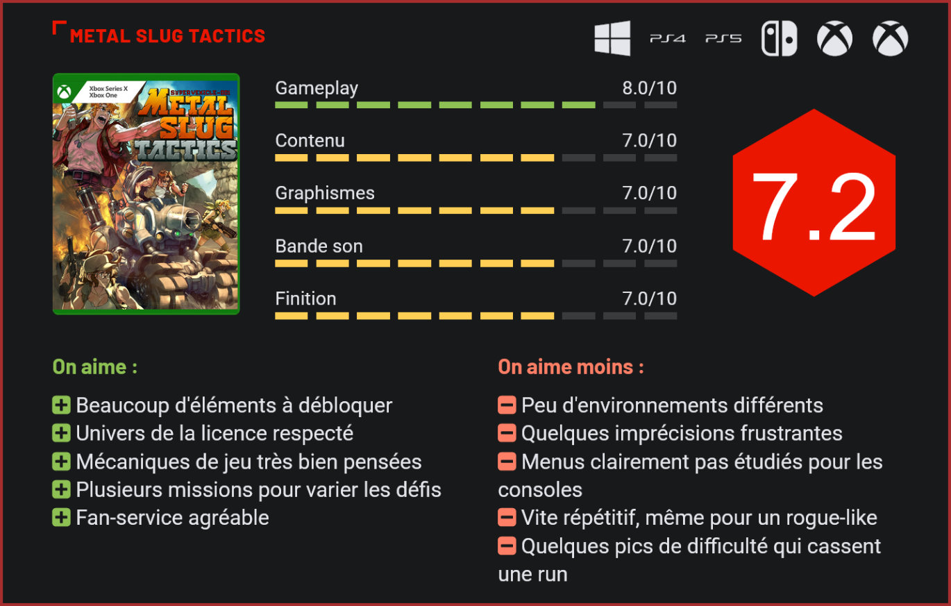 16 ans, c’est le temps qui sépare la sortie du dernier Metal Slug canonique, à savoir Metal Slug 7 qui a vu le jour sur Nintendo DS, du nouveau spin-off qui vient de sortir. Certes, quelques épisodes destinés aux supports mobiles ont fait leur apparition entre temps, dont des Tower Defense, mais aucun jeu n’a réellement retenu l’attention. Une question se pose donc : ce spin-off Metal Slug Tactics parvient-il à renouer avec l’esprit de la licence, et ce, suffisamment pour signer son grand retour ? DotEmu est un éditeur spécialisé dans le retour de certaines licences cultes. L’entreprise est notamment associée à Wonder Boy III : The Dragon’s Trap, Streets of Rage 4, Windjammers 2 ou encore TMNT Shredder’s Revenge. Dernièrement, elle signe le retour d’une célèbre licence de SNK, à savoir Metal Slug. Le projet a été développé par Leikir Studio, un studio de développement parisien fondé en 2012 auquel on doit Isbarah, Wondershot ou encore Rogue Lords. Ce dernier a fait un pari audacieux en offrant à la licence une toute nouvelle approche. Oubliez le run ‘n gun des épisodes canoniques, ce spin-off prend la forme d’un RPG tactique au tour par tour, avec un aspect rogue-like. Il faut bien l’avouer, le T-RPG est un genre de niche. De prime abord, le choix de Leikir Studio est surprenant, surtout pour remettre sous le feu des projecteurs une licence connue pour son aspect run ‘n gun. Sur le papier, les deux genres sont à l’opposé. L’un demande de prendre son temps, de réfléchir, d’anticiper les coups suivants, quand l’autre joue sur l’urgence pour avancer le plus vite possible en tirant sur tout ce qui bouge. Pourtant, les développeurs ont réussi le tour de force de combiner les deux. Cela passe par une idée très simple mais ô combien efficace. Plus un personnage se déplace loin sur la map, plus il engrange de points d’esquive pour limiter les dégâts reçus durant le tour (de l’ennemi) suivant. En somme, contrairement à beaucoup de titres du genre qui misent sur un contrôle de sa zone, Metal Slug Tactics fait tout pour que le joueur déplace ses personnages le plus loin possible. On retrouve donc en substance cette partie « run », même s’il faut se déplacer case par case, chacun son tour. Le niveau joue sur la verticalité pour se placer stratégiquement en fonction des adversaires Bien entendu, la partie « gun » est également assurée. De base, Marco et Fio sont équipés d’armes à feu (une faible à munitions illimitées et une plus puissante à munitions limitées), tandis qu’Eri envoie des explosifs, en plus de son arme secondaire. En sus de ces trois personnages, en terminant le jeu selon diverses conditions, on débloque six autres personnages phares de la série, à savoir Tarma, Trevor, Nadia, Ralf, Clark et Leona. Chacun dispose de son paquetage et de ses compétences, comme Trevor qui peut contrôler mentalement des ennemis. Les parties se déroulent majoritairement de la même manière. Il y a le tour du joueur et celui de l’ennemi (durant lequel on subit). Durant le premier, on peut déplacer chacun de ses personnages avant d’attaquer les ennemis. Parmi les subtilités, on note une certaine verticalité qui permet de se protéger d’une partie des attaques, des systèmes de couverture ajoutant des points de défense (pas toujours de manière cohérente d’ailleurs) et des éléments du décor interactifs pour faire plus de dégâts. On peut actionner une poulie pour décharger sa cargaison sur l’ennemi ou encore faire exploser un tonneau près des adversaires. Il y a même une particularité avec les ennemis qui nous momifient, ces derniers nous permettant de faire bien plus de dégâts au corps à corps sur le tour suivant. Le gameplay est plutôt bien calibré et demande une certaine réflexion… et surtout de l’anticipation. Il est donc nécessaire de bien étudier tous les aspects du jeu, notamment au niveau de l’utilisation des actions spéciales, de l’optimisation de ses points de mouvement ou au niveau des atouts qui ajoutent des bonus non négligeables. Metal Slug oblige, le célèbre tank est également de la partie. Lorsqu’il est ajouté à la mission, il permet de faire de sacrés dégâts. Nous n’allons pas décortiquer chaque élément du gameplay mais il y a une spécificité qui fait tout le sel des parties. C’est la synchronisation. Concrètement, lorsque les alliés sont positionnés de telle sorte à pouvoir toucher un ennemi que l’on cible, ces derniers se synchronisent et déclenchent également leur attaque. Le ou les pauvre(s) adversaire(s) subissent alors deux ou trois assauts. De quoi réduire leur barre de vie à zéro très rapidement, voire en éliminer plusieurs sur un seul tour. Pour aider à visualiser les impacts, en déplaçant la zone d’action, on peut observer si l’attaque va toucher, combien elle va infliger, si une synchronisation va se lancer et combien elle fera de dégâts. À vrai dire, les développeurs ont essayé de rendre le gameplay accessible au plus grand nombre. Malheureusement, s’il y a plein de bonnes intentions, les néophytes seront vite perdus. La faute à un tutorial qui est trop succinct pour s’approprier toutes les notions du jeu. En plus, on sent bien que l’interface a été pensée avant tout pour des joueurs PC. Les textes sont très petits et les fenêtres s’accumulent lorsqu’on veut préciser une notion en cliquant sur le joystick droit. Une fonctionnalité qui se déclenche juste au passage de la souris sur le lien sur un PC. Plus pratique et moins invasif. Comme il y a beaucoup de textes, notamment pour comprendre les effets des compétences ou des atouts, on se retrouve vite gêné ou à s’approcher de son téléviseur, quand on ne plisse pas les yeux. De même, on est parfois confus quand un bouton sert à la validation une partie du temps et que c’est un autre qui prend le relais le reste du 
