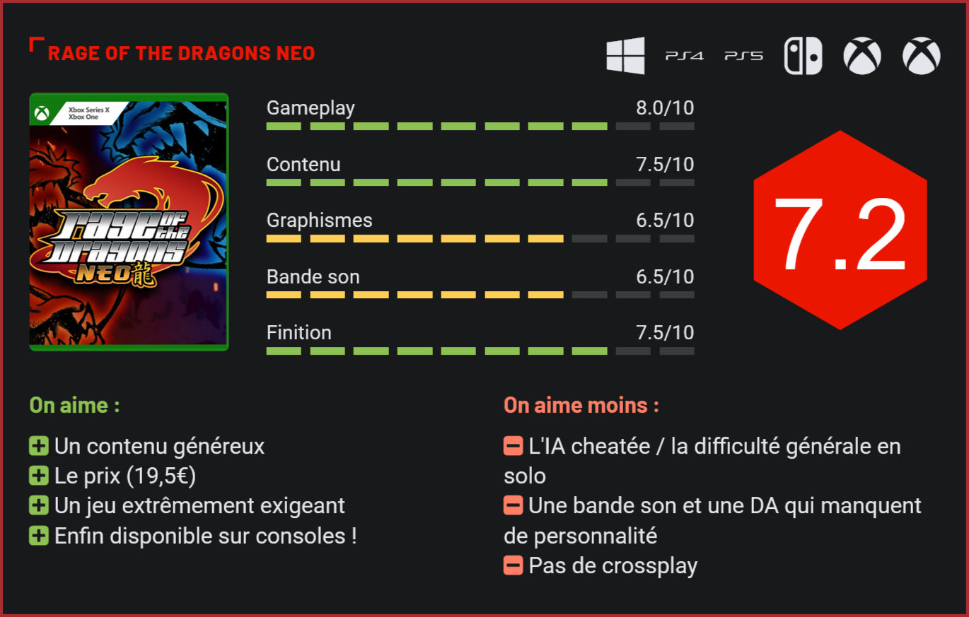 Sorti en 2002 en arcade, Rage of the dragons fait partie de ces jeux de baston qui n’ont pas remporté un énorme succès commercial mais qui ont acquis, au fil des années, un statut de jeu culte. Le titre a finalement droit à une sortie sur consoles, sous forme digitale. Grâce à l’éditeur Qubyte, les amateurs de jeux de baston peuvent enfin découvrir l’un des titres les plus méconnus des années 2000. Sorti uniquement en arcade en 2002, Rage of the dragons a marqué de son emprunte le marché des jeux de baston. Elitiste à l’extrême, le titre propose une approche différente des autres jeux en misant tout sur le tag-fighting. Ce qui est intéressant avec ce jeu, par rapport aux multiples autres portages de jeux de baston 2D sur les consoles de dernière génération, c’est que Rage of the dragons fait partie des très rares titres à n’avoir jamais eu droit à un portage sur consoles. Pour beaucoup de joueurs, ce sera donc le premier contact avec la série. Pour les fans, cette version digitale représente la première option d’être propriétaire du jeu. Second point d’intérêt : le jeu se base entièrement sur le combat en équipe. A tout moment, il est possible de changer de personnage, auquel cas le second combattant pourra se reposer et regagner un peu d’énergie. Les affrontements se révèlent ainsi très techniques et stratégiques. Même en mode facile, le jeu vous donnera d’ailleurs du challenge, avec un système de combat exigeant et une difficulté extrêmement élevée. C’est bien entendu le système de tag fighting qui donne à Rage of the dragons toute sa richesse, puisqu’il est possible de réaliser des enchainements dévastateurs avec deux personnages et d’aligner ainsi les combos. Face à une telle difficulté, les débutants se sentiront sans doute perdus, mais qu’ils se rassurent, le jeu intègre un très bon tutorial, en plus des nombreux modes de jeu hors-ligne dont l’incontournable mode Arcade, mais aussi un mode Survie. Le vrai intérêt du jeu c’est bien sûr son multijoueur, off et online. Et il faut l’avouer, le studio Qubyte a fait du bon boulot avec un excellent netcode, sans aucune latence, des lobbyes et un système de matchmaking efficace. L’ennui, c’est qu’à moins d’organiser un rendez-vous via un site, difficile de trouver des joueurs, en grande partie parce que le jeu n’est pas crossplay. Qu’à cela ne tienne, cela ne devrait pas empêcher les amateurs de jeux de baston de se pencher vers cet excellent jeu de tag fighting de l’ère de la NeoGeo. Certes, le jeu est désert en ligne, mais si vous avez des amis qui y jouent, vous pourrez largement y trouver votre compte. De surcroit, le titre est proposé à un tarif très compétitif puisqu’il ne faudra débourser que 19,5€ pour l’acquérir sur la plate-forme de votre choix… Conclusion Parmi les rares classiques du jeu de baston en 2D qui n’avaient jamais eu droit à un portage sur consoles, Rage of the dragons est un must absolu pour les joueurs les plus exigeants. Le titre se caractérise outre par sa difficulté extrême par un système de combat très technique basé sur le tag fighting (les combats en 2 vs 2). Solide dans son gameplay, le jeu a surtout de l’intérêt en multijoueur en local – en ligne si vous avez des amis qui y jouent mais attention, difficile d’affronter des inconnus, les serveurs étant désertés… A 19,5€, vous n’avez en tout cas aucune raison de passer à côté de cette petite pépite.