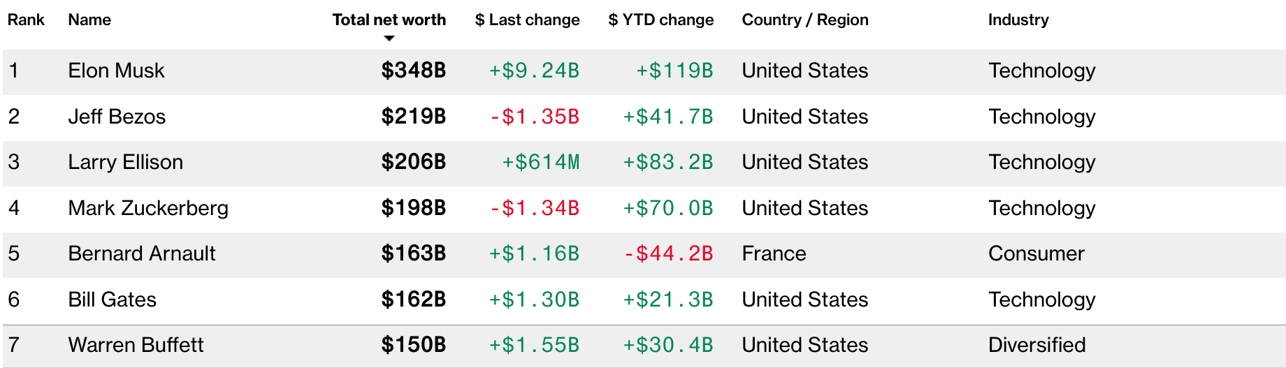 Le milliardaire sud-africain n’est pas “simplement” devenu l’homme le plus riche du monde, il est maintenant la personne la plus riche de… l’Histoire. Sa fortune dépasse celle de Jeff Bezos et Bernard Arnault. La victoire de Donald Trump à l’élection présidentielle américaine explique en partie le bond de sa fortune. Elon Musk n’est pas “simplement” devenu l’homme le plus riche du monde, il est maintenant la personne la plus riche… de l’Histoire. En effet, selon l’indice Bloomberg, le multimilliardaire sud-africain détient maintenant une fortune de près de 348 milliards de dollars. Dans la foulée, il bat son propre record de novembre 2021, date à laquelle sa fortune était estimée à 338 milliards de dollars. Par ailleurs, la fortune du patron de Tesla distancie allègrement celles d’autres personnes fortunées. En effet, le patrimoine d’Elon Musk est maintenant supérieur à celui de Jeff Bezos (219 milliards de dollars), Larry Ellison (206 milliards), Mark Zuckerberg (198 milliards), Bill Gates (162 milliards de dollars) ou encore Bernard Arnault (163 milliards de dollars). De plus, même en tenant compte de l’inflation, la fortune d’Elon Musk est supérieure à celles de figures historiques telles que John Rockefeller. Source : Bloomberg Autre fait à relever : Elon Musk a développé sa fortune sans bénéficier de monopoles. Que ce soit Tesla, SpaceX ou encore Neuralink, ses entreprises évoluent dans des secteurs qui présentent une concurrence. Mais le bond de la fortune d’Elon Musk s’explique en partie par la victoire de Donald Trump à l’élection présidentielle américaine. Tout au long de la campagne électorale, Elon Musk s’est présenté comme le bras droit de Donald Trump. Et une fois l’élection remportée, le républicain a nommé Elon Musk à la tête du département américain de l’efficacité gouvernementale. Lors de la journée qui a suivi la victoire de Donald Trump, il est estimé qu’Elon Musk a remporté pas moins de 26 milliards de dollars…