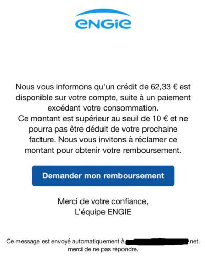 Une vague d’arnaques par mail mobilise actuellement l’image d’Engie. Un message annonce un remboursement de plusieurs dizaines d’euros à la suite d’un paiement excédant la consommation. L’hiver approche à grands pas et les températures baissent petit à petit. Plus que jamais, le sujet des frais liés aux consommations d’énergie au sein du foyer préoccupe de nombreux Belges. Pour cause, le montant des factures énergétiques à payer augmente à mesure que les températures baissent. Dès lors, un allègement d’une facture à payer arrangerait bon nombre d’entre nous. Cela, certaines personnes malintentionnées l’ont bien compris. Depuis plusieurs jours, une arnaque mobilisant l’image d’Engie atterrit dans certaines boîtes mails. Un message annonce ce qui s’apparente à une bonne nouvelle : « Nous vous informons qu’un crédit de 62,33 € est disponible sur votre compte, suite à un paiement excédant votre consommation ». Par la suite, le message précise que : « Ce montant est supérieur au seuil de 10 € et ne pourra être déduit de votre prochaine facture. Nous vous invitons à réclamer ce montant pour obtenir votre remboursement ». Bien entendu, nous retrouvons un lien mis en avant qui permettrait d’être remboursé de ces 62,33 € promis. C’est précisément ce lien qui constitue le cœur de l’arnaque. En effet, ce lien redirige la victime vers un faux site d’Engie programmé pour enregistrer vos données personnelles (numéro de compte en banque, identifiant, etc.). Par ailleurs, nous pouvons relever le fait que cette arnaque est personnalisée. En effet, à la fin du courriel, nous pouvons lire : « Ce message est envoyé automatiquement à X, merci de ne pas répondre ». Si vous recevez un message de ce type, ignorez-le tout simplement. Une entreprise comme Engie ne vous communiquera jamais une annonce de remboursement par mail. Si vous avez un quelconque doute, contactez directement Engie, ou l’entreprise dont le nom est mis en avant, afin d’éclaircir la situation.