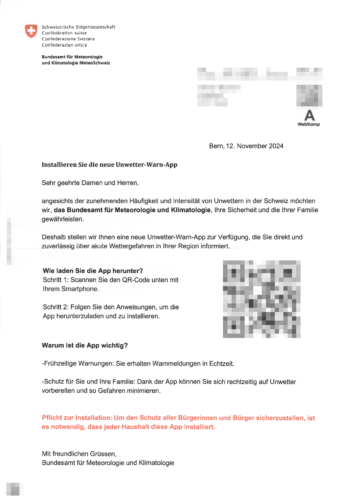 Cette arnaque ne commence pas sur Internet ou sur votre smartphone. Tout débute par une enveloppe physique déposée dans votre boîte aux lettres. Une fois cette enveloppe ouverte, une lettre vous propose de scanner un QR code. Cette arnaque ne commence pas sur Internet avec un mail frauduleux ou sur votre smartphone avec un SMS suspect. Non, tout débute par un courrier papier déposé dans votre boîte aux lettres, comme l’explique Safeonweb. De prime abord, ce courrier semble provenir d’une entreprise ou d’un organisme fiable. Une fois de retour au sein de votre foyer, vous ouvrez ce courrier et vous apercevez une lettre relativement bien mise en page présentant un QR code vous invitant à télécharger une nouvelle mise à jour d’une application ou une nouvelle application. Ayant la garde baissée, la victime sera alors tentée de scanner le code QR afin de voir ce qu’il en est. Mais c’est à ce moment précis que l’arnaque se referme sur la victime. En réalité, ce QR code télécharge sur votre smartphone un virus programmé pour voler vos données confidentielles. Dans l’exemple ci-dessous, un courrier frauduleux provenant soi-disant de Météo Suisse incite les victimes à télécharger une nouvelle application “Alerte météo”. En réalité, il s’agit d’une application qui renferme un virus. Source : NCSC-CH Précisons maintenant une chose : cette nouvelle arnaque a été repérée en Suisse. À l’heure où nous écrivons ces lignes, aucun cas similaire n’a été signalé en Belgique. Cependant, comme bien souvent, il est probable que l’arrivée de cette arnaque dans nos contrées ne soit qu’une question de temps. Si vous recevez un courrier suspect vous invitant à scanner un QR code, ignorez-le. Si vous avez un doute, rendez-vous sur le site de l’entreprise ou de l’organisme dont le nom est utilisé. Si vous avez téléchargé une application frauduleuse par manque de méfiance, supprimez là au plus vite, réinitialisez les paramètres d’usine de votre smartphone et n’hésitez pas à changer vos mots de passe.