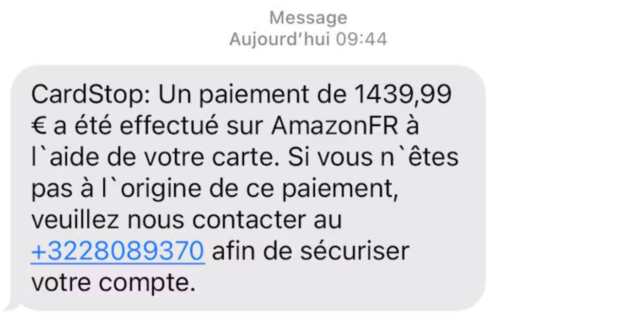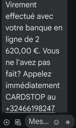 Cette arnaque commence par un SMS vous avertissant qu’un important paiement a été effectué avec votre carte bancaire. Le message frauduleux met en avant un numéro de téléphone qui permettrait à la victime de limiter les dégâts. Mais attention, ce numéro de téléphone redirige la victime directement vers l’arnaqueur. Depuis quelques jours, nous avons constaté la recrudescence d’un certain type d’arnaque. Celle-ci débute par un SMS qui vous avertit qu’un important paiement a été effectué à l’aide de votre carte bancaire. Le message précise qu’il faut impérativement contacter Card Stop afin d’éviter tout autre désagrément. Prise de panique, la victime sera alors tentée de contacter le soi-disant numéro de Card Stop mis en avant. Mais ce numéro ne renvoie en aucun cas aux équipes de Card Stop. En effet, il s’agit tout simplement du numéro de l’arnaqueur. La victime entrera donc directement en contact avec ce dernier. Ensuite, l’arnaqueur tentera de faire croire à la victime qu’il a besoin de ses informations bancaires afin de prétendument régler la situation. Bien entendu, l’arnaqueur utilisera les informations bancaires de la victime pour vider son compte en banque. Dans l’exemple ci-dessous, un SMS avertit : « CardStop : un paiement de 1439,99 € a été effectué sur AmazonFR à l’aide de votre carte. Si vous n’êtes pas à l’origine de ce paiement, veuillez nous contacter au +3228089370 afin de sécuriser votre compte ». Autre exemple avec ce SMS qui alerte : « Virement effectué avec votre banque en ligne de 2620 € ? Vous ne l’avez pas fait ? Appelez immédiatement Cardstop au +32466198247 ». En réalité, cette arnaque est facilement identifiable. En effet, Card Stop présente un seul et unique numéro de contact : 078.170.170. Peu importe ce que l’on pourrait vous expliquer, tous les autres numéros sont frauduleux. De plus, Card Stop ne communique jamais de façon proactive. C’est à la personne qui rencontre un problème de contacter Card Stop, et en aucun cas l’inverse.