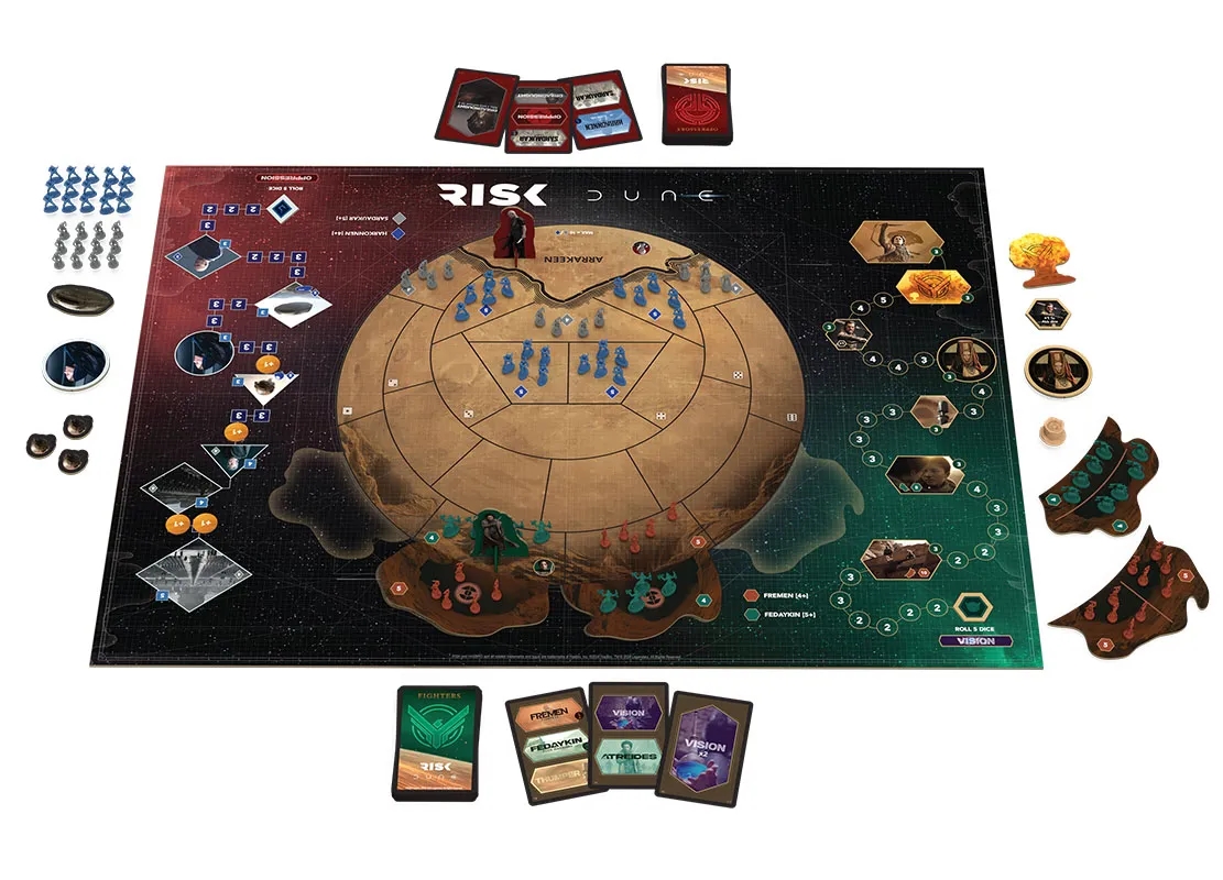 Surprise pour les fans de l’univers de Frank Herbert, Risk se décline désormais également dans une édition spéciale “Dune”. Les fans de Dune peuvent se réjouir, l’excellent jeu de stratégie Risk dispose désormais d’une déclinaison spéciale Dune avec une carte, des pions et règles spécifiques. Inspirée des films de Denis Villeneuve, cette édition spéciale du jeu de plateau se joue de deux à quatre joueurs. Le joueur prend le contrôle de l’une des factions et doit tenter de gagner le contrôle de la carte. Cette édition spéciale du jeu se distingue de l’original par sa carte circulaire, l’utilisation de héros, de cartes de “vision” et de règles spécifiques. Les détails sont peu nombreux toutefois concernant les règles spécifiques à cette édition. Ce n’est par ailleurs pas la première fois que Dune est adapté en jeu de société. Une version spéciale de Monopoly dans l’univers de Dune avait déjà vu le jour. Le jeu devrait être commercialisé aux alentours de 50€ en magasin et en ligne.