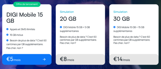 Fraichement débarqué sur le marché des télécoms en Belgique, l’opérateur roumain Digi casse les prix avec une offre à 5€/mois qui comprend 15 Go de data. La bonne affaire ? Un tarif alléchant, jusqu’à un certain point L’offre de Digi se caractérise par le fait qu’il n’existe qu’une proposition d’abonnement, qui est en réalité extensible. Appels et SMS en illimité, avec 15 Go de data, pour 5€ par mois. Le giga de data additionnel n’est facturé que 60 cents. Concrètement, ça fait donc 20 Go de data à 8€/mois et 30 Go à 14€/mois. L’offre est globalement intéressante jusqu’à un certain niveau puisque passé les 25/30 Go on trouve beaucoup plus compétitif ailleurs. Inutile donc de passer à une formule Digi si vous consommez en moyenne 50 Go de data par mois ou plus. Pas de 5G pour le moment Comme il s’agit d’un nouvel opérateur, Digi n’a pas encore son propre réseau. Il exploite pour le moment le réseau 4G de Proximus. Des antennes 5G seront installées tout au cours de l’année 2025, toutefois pour le moment, l’abonnement n’intègre pas de la 5G, et il faut le savoir. Cela veut dire dans la pratique des débits plus lents que sur un réseau 5G. Pas de messagerie vocale Beaucoup plus surprenant, l’offre n’intègre pas de messagerie vocale. Digi défend cette approche par le fait que les consommateurs n’utilisent presque plus cette fonction, préférant de toute façon s’appeler via WhatsApp ou Messenger. Mais dans la pratique, l’absence de messagerie vocale sera bloquante pour certains consommateurs, notamment qui utilisent leur smartphone dans un cadre professionnel. Zéro option Impossible pour l’instant de bloquer les communications pour éviter une surfacturation comme c’est possible chez Base, d’avoir une carte eSim ou de bénéficier de filtres de surf. Digi propose une offre simple qui va droit à l’essentiel. Avec le temps, les choses évolueront peut-être mais pour le moment, il faudra se contenter du minimum. Une identification obligatoire lorsque vous commandez votre carte Au moment de commander votre carte SIM, il faudra obligatoirement vous identifier en passant par itsme et entrer une adresse avec un système automatisé. Et cela peut causer quelques problèmes. Dans notre cas par exemple, le système refusait purement et simplement une adresse – celle-ci n’existant pas dans le système. Le plus souvent, chez les autres opérateurs, cette étape survient après l’envoi de la carte SIM, à l’activation.