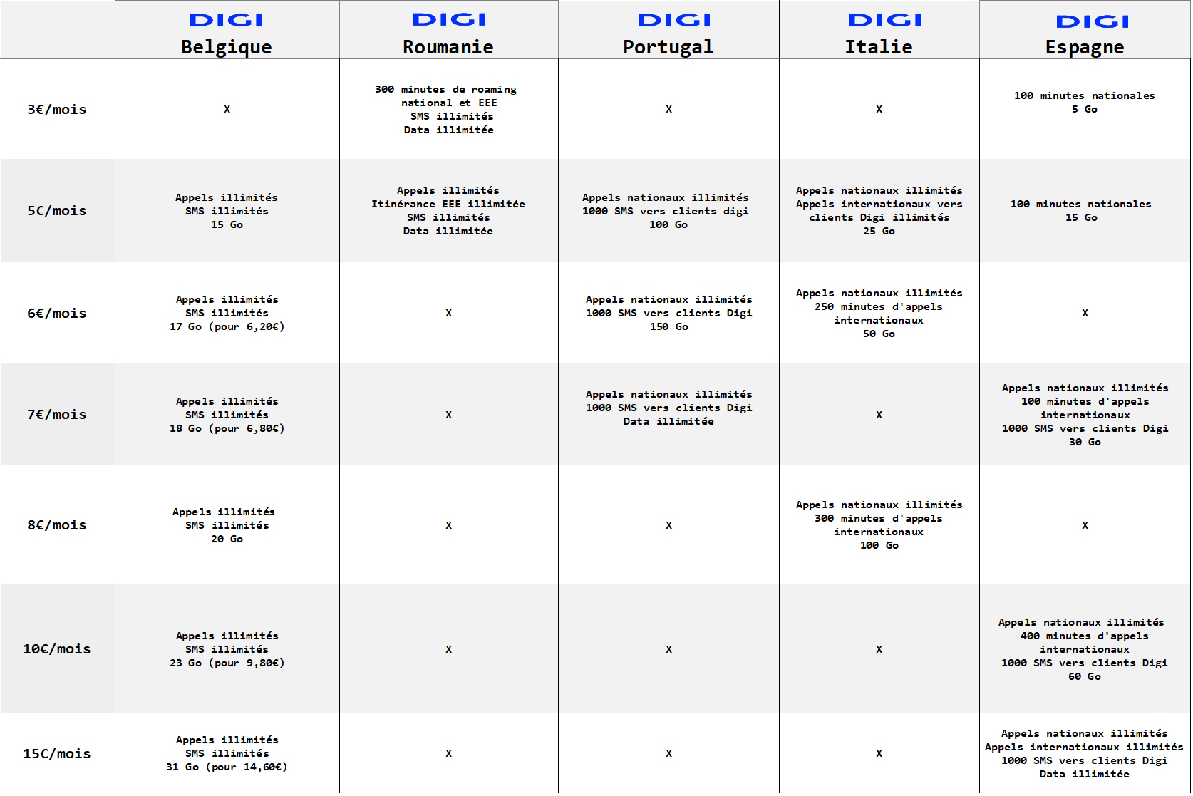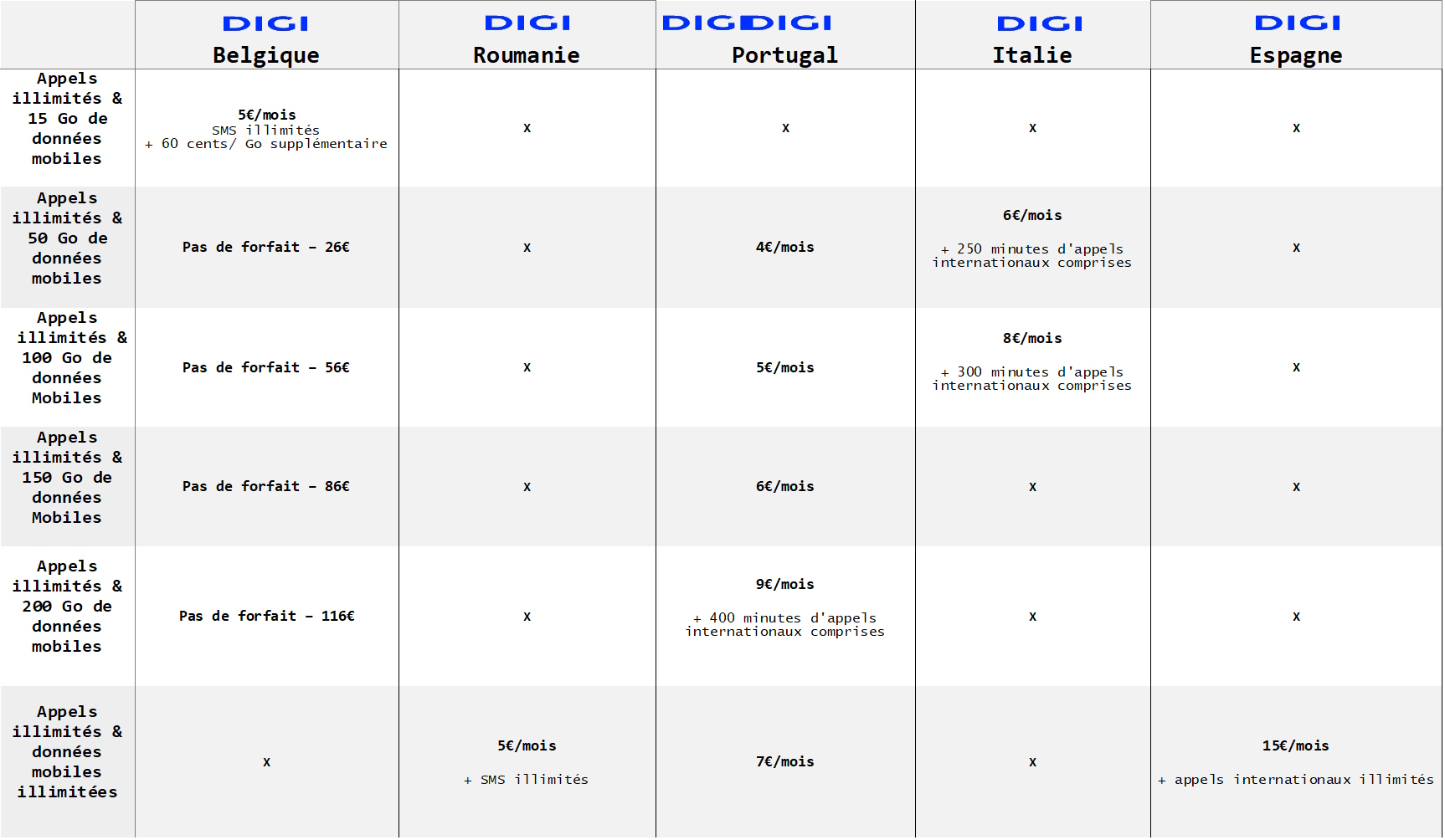 L’arrivée de Digi en Belgique a secoué le marché des télécoms. Avec son offre mobile à 5€ par mois, l’opérateur roumain a fait réagir. Installé en Roumanie, en Italie, en Espagne et au Portugal, il vise à proposer les offres les plus compétitives du marché. Où trouve-t-on les plus alléchantes ? Le cas belge En Belgique, l’offre est des plus simples. Pour 5€/mois, Digi propose des appels et des SMS illimités, le tout accompagné de 15 Go de données mobiles. Si vous souhaitez plus de data, il vous en coûte 0,60€/Go supplémentaire. Le cas roumain En Roumanie, l’opérateur est chez lui. Il propose un forfait à 5€/mois également mais avec les appels, les SMS et les données mobiles illimités. Le tarif peut même être réduit en souscrivant pour plusieurs numéros, tombant à 3€/mois pour chacun des numéros dès 4 abonnements pris. Il est possible d’avoir moins cher encore en optant pour un forfait à 2€/mois avec 200 minutes de roaming national et EEE (Espace économique européen), tandis que le reste est en illimité. Une offre à 3€/mois permet quant à elle de monter à 300 minutes de roaming. Le cas italien En Italie, ce sont trois forfaits qui sont proposés. Le premier, à 5€/mois comprend les appels illimités à partir de l’Italie, les appels internationaux illimités vers les clients Digi et 25 Go de données de mobiles. Le deuxième, à 6€/mois, double la data mais limite les appels internationaux à 250 minutes vers 60 pays. Le troisième reprend la formulation du précédent en augmentant à 300 minutes les appels internationaux et en ajoutant 50 Go de données pour une enveloppe totale de 100 Go. Ce dernier est affiché à 8€/mois. Dans tous les cas, les données mobiles non utilisées sont cumulées. Le cas portugais Au Portugal, il existe une offre avec les appels et les données mobiles illimités à 7€/mois. Le prix varie à la baisse en prenant plusieurs abonnements, jusqu’à 5€/mois par abonnement dès 3 numéros associés. En revanche, les appels internationaux ne sont pas inclus et seuls 1000 SMS peuvent être envoyés à des clients Digi. Pour le reste, il faut payer un supplément, de 0,02€ en l’occurrence. Ensuite, l’opérateur propose quatre offres avec une limite en data. Les trois premières, à 4€/mois, 5€/mois et 6€/mois permettent de respectivement obtenir 50 Go, 100 Go et 150 Go de données. Dans tous les cas, les appels nationaux sont illimités et les données non utilisées peuvent être cumulées. Pour les SMS, on retrouve la même contrainte que pour la formule illimitée. Quant à la quatrième offre, à 9€/mois, elle permet d’obtenir 200 Go de données et 400 minutes d’appels internationaux. Le cas espagnol En Espagne, Digi multiplie les formules. La moins contraignante, c’est celle à 15€/mois (réduite à 10€/mois en souscrivant en prime à la fibre) qui comprend les appels nationaux et internationaux en illimité, en plus des données mobiles en illimité. En revanche, il faut se contenter de 1000 SMS à destination de clients Digi. Cette contrainte au niveau des SMS s’applique à toutes les offres. Si vous souhaitez payer moins cher, il existe 5 formules. Pour seulement 3€/mois vous pouvez téléphoner partout en Espagne durant 100 minutes et consommer 5 Go de data. C’est peu. Pour une formule similaire mais avec 15 Go de données mobiles, il faut payer 5€/mois. Les appels nationaux illimités ne sont disponibles qu’à partir de l’abonnement à 7€/mois qui comprend également 30 Go de data et 100 minutes d’appels internationaux. Ensuite, nous avons la formule à 10€/mois avec 60 Go de données et 400 minutes d’appels internationaux et l’abonnement à 12€/mois avec 120 Go de data et 800 minutes vers l’international. Là encore, les données mobiles non utilisées sont cumulées. Comment s’y retrouver au niveau de l’offre ? Plutôt que de répertorier toutes les offres, nous avons choisi de représenter les plus intéressantes pour un utilisateur qui appelle régulièrement au niveau national. Cela permet de nous intéresser particulièrement aux offres en fonction de la data incluse. Bien entendu, l’offre roumaine est imbattable puisque c’est la seule qui permet d’avoir les appels, les SMS et les données mobiles illimitées pour seulement 5€/mois. Au Portugal, il faut compter 7€ pour une offre similaire mais avec une limite de 1000 SMS vers des clients Digi, tandis qu’en Espagne le tarif est trois fois plus élevé qu’en Roumanie, avec là encore une limite de 1000 SMS vers des clients Digi. En revanche, Digi ajoute les appels internationaux en illimité. Outre la Roumanie, pays d’origine de l’opérateur, c’est le Portugal qui se démarque avec son offre comprenant les appels illimités et 50 Go de données mobiles pour seulement 4€/mois. L’Italie a bien une offre similaire mais elle est affichée à 6€, les 2€ supplémentaires étant liés à l’ajout de 250 minutes d’appels internationaux. En Belgique, comme on peut le voir sur le tableau ci-dessous, les prix s’envolent rapidement. Comme nous le reportions il y a peu, l’offre belge n’est intéressante que dans la limite de 25 Go de données mobiles, via l’ajout des Go supplémentaires à 0,60€/unité. Tableau comparatif des offres Digi en fonction du pays et de certaines offres clés // Crédits – Geeko Comment s’y retrouver par rapport au prix ? Comme toutes les offres de Digi ne proposent pas les appels illimités, nous avons également tenu à comparer les offres en fonction du prix. On commence avec l’offre à 3€/mois disponible en Roumanie et en Espagne. Peu onéreuse, elle représente un point d’entrée dans ces deux pays, même si elle limite le roaming en Roumanie à 300 minutes ou qu’elle ne comprend que 100 minutes d’appels nationaux et 5 Go de données en Espagne. Avec l’offre à 5€/mois, si tout le monde est sur un 