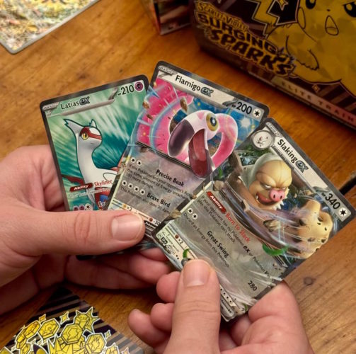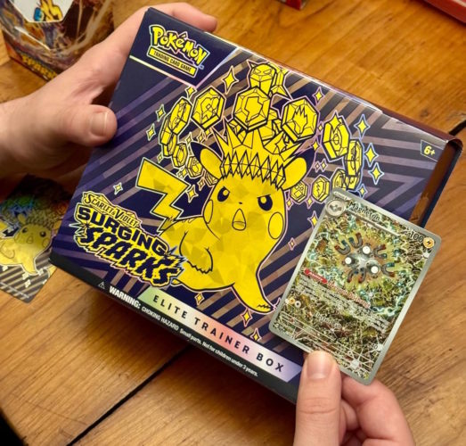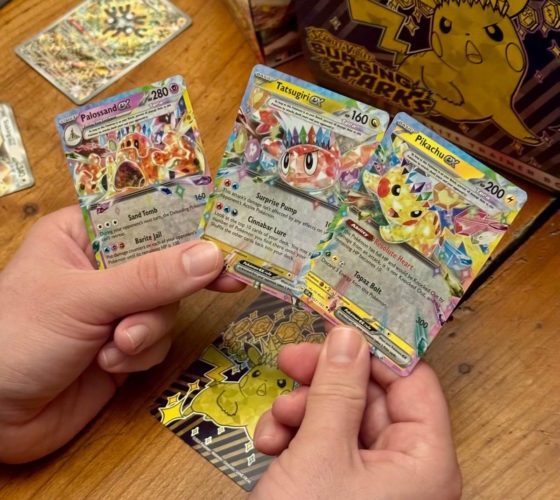 Après Couronne Stellaire (notre avis est disponible ici), c’est une nouvelle extension qui enrichit la série Écarlate et Violet du JCC Pokémon. Étincelles Déferlantes, de son nom, met notamment en avant les Pokémon de type électrique et les dragons. Cette nouvelle extension compte 252 cartes différentes, dont 18 Pokémon-ex différents. Plusieurs ont le droit à des variantes plus rares, dont Pikachu-ex et Noadkoko d’Alola-ex, les deux stars de cette extension déclinées en une version dorée hyper rare. On note également l’intégration de 8 cartes High-Tech, contre 3 dans Couronne Stellaire. Parmi les cartes promotionnelles liées à Étincelles Déferlantes, nous retenons forcément la beauté du Magnéton intégré au Coffret Dresseur. L’illustration signée Shinji Kanda brille de mille feux. Il offre un magnétisme sans précédent à ce Pokémon électrique, la carte semblant survoltée, bien plus que que la version promotionnelle de Shinya Mizuno que l’on peut récupérer dans un Boîtier Stratégies et Combats. En revanche, ce dernier donne l’opportunité de mettre la main sur trois autres cartes promotionnelles, à savoir Feu-Perçant, Baojian et Wimessir. La carte Magnéton du coffret Dresseur Élite est envoûtante // Crédits – V.P. pour Geeko C’est une constante dans l’univers du JCC Pokémon et ce n’est pas cette extension qui va nous contredire. Les visuels sont superbes. C’est encore et toujours le meilleur argument pour faire craquer les fans de la licence. On retrouve le thème de la plage tropical, développé dans cette extension EV08, dans plusieurs cartes, dont le Noadkoko d’Oswaldo KATO qui court en direction de la mer. On apprécie l’angle placé en contre-plongé qui donne plus de hauteur au saut du Pokémon. En s’attardant sur les détails, on apprécie également l’espièglerie qui se dégage d’une tête. Plusieurs cartes profitent d’illustrations très douces, apaisantes, comme Goupix, Flamajou, Chochodile, Démanta, Obalie, Sancoki, Denticrisse, Piétacé, Magnéti, Togepi, Azumarill, Plumeline, Phampy, Triopikeur d’Alola, Parecool ou encore Évoli pour ne citer qu’eux. Certaines illustrations sortent encore plus du lot. Nous pensons à celles de Spododo et de Kecleon qui sont envoûtantes, sans parler des cartes avec une illustration rare (cartes avec une étoile dorée) qui sont toutes sublimes. Ce qui est plaisant, c’est que les différents artistes qui collaborent apportent chacun leur vision, leur style. Certaines cartes arborent un visuel digne d’une toile de maître, tandis que d’autres jouent sur des effets plus modernes pour donner du relief. Quelques cartes pour apprécier la beauté des illustrations rares // Crédits – V.P. pour Geeko Chacun aura ainsi ses préférences et ses petites déceptions. Pour notre part, nous sommes moins fans des versions ultra rares de Fermite-ex et Scovilain-ex par exemple. Bien entendu, on retrouve plusieurs créatures téracristallisées, dont Pikachu-ex, Trépassable-ex, Libégon-ex, Trioxhydre-ex, Noadkoko d’Alola-ex, Nigirigon-ex ou encore Motorizard-ex. Outre la mention Téracristal inscrite sous le nombre de points de vie, ces cartes se reconnaissent au premier coup d’œil grâce au travail très particulier réalisé sur la créature pour marquer l’effet du cristal. Si les collectionneurs sont choyés, les joueurs ne sont pas en reste. Plusieurs cartes sortent du lot. Pikachu-ex bénéficie d’un Talent qui le rend difficile à éliminer. Ainsi, Cœur Résolu, de son nom, empêche le K.O. si Pikachu a tous ses PV avant l’attaque. En d’autres termes, tous les Pokémon qui lui infligeraient une attaque à 200 points de dégâts ou plus laissent Pikachu-ex en vie avec 10 PV. Avantage à la défense… Mais il brille également en attaque avec son Éclair Topaze qui inflige 300 points de dégâts. Certes, il faut réunir trois énergies différentes et s’en défausser après l’attaque. Cartes Téracristal de Trépassable-ex, Nigirigon-ex et Pikachu-ex // Crédits – V.P. pour Geeko C’est là que Magnéton entre en jeu. Ce dernier dispose d’un Talent Décharge Survoltée qui le met K.O. mais qui permet d’attacher jusqu’à trois cartes Énergie de base issues de la pile de défausse à un Pokémon de type électrique. De quoi recharger Pikachu ! Au besoin, vous pouvez compenser avec la Recharge Statique de Statitik qui permet de récupérer 2 cartes Énergie électrique de son deck et de les attacher à un Pokémon. Noadkoko d’Alola-ex profite lui aussi de deux attaques intéressantes, en plus de profiter de 300 PV. La première, Frénésie Tropicale, inflige 150 points de dégâts mais permet d’attacher le nombre voulu de cartes Énergie de base de sa main à ses Pokémon. La deuxième se joue avec une pièce et permet de mettre K.O. un Pokémon adverse, qu’il soit Actif (face) ou de Banc (pile). Parmi les Pokémon qui disposent d’un Talent intéressant, il y a Latias-ex et son Taxi Aérien qui supprime le Coût de Retraite pour les Pokémon de base. Milobellus-ex s’offre quant à lui la capacité d’éviter tous les dégâts et effets d’attaque des Pokémon Téracristal adverses. Par contre, Azumarill profite des Pokémon Téracristal. Si vous en avez un en jeu, alors vous pouvez profiter de Bulles Chatoyantes, ce qui permet de déclencher son attaque à 230 points de dégâts avec une seule énergie au lieu des quatre nécessaires. Tritosor est également intéressant puisque, tant qu’il est sur le Banc, il empêche l’utilisation du Talent de tous les Pokémon de Banc de Niveau 2. Nous n’allons pas tous les passer en revue mais il est clair que le Talent peut vite être au cœur de la stratégie. De même, cette extension change la donne par rapport à d’habitude puisqu’elle incite plus à jouer la défausse. La carte High-Tech Mixeur Brillant en est le parfait exemple avec sa capacité à chercher jusqu’à 5 