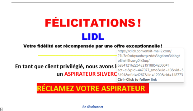 Lidl est connu pour ses offres alléchantes, notamment sur l’électroménager. Néanmoins, si vous recevez un mail de l’enseigne indiquant que vous avez gagné un aspirateur, sachez que c’est une arnaque. Un aspirateur Silvercrest gratuit ? Le cadeau semble plutôt sympathique et peut s’apparenter à un joli coup de pouce pour ce début d’année. C’est justement la (fausse) promesse qui a été faite à des internautes. Ces derniers ont reçu un mail usurpant l’identité de Lidl leur indiquant que leur “fidélité est récompensée par une offre exceptionnelle”. Aperçu du mail frauduleux envoyé en usurpant l’identité de l’enseigne Lidl // Crédits : Safeonweb Pour en profiter, ils sont alors invités à cliquer sur un lien pour réclamer leur dû, à savoir l’aspirateur en question. Si vous recevez ce message, ne le faites surtout pas, au risque de vous faire escroquer. En effet, il suffit de passer la souris sur le lien pour avoir un aperçu de ce dernier. En le faisant vous remarquerez rapidement que le lien n’a rien à voir avec le site officiel de l’enseigne allemande. Si jamais vous cliquez dessus, surtout ne remplissez aucun champ. Cette tentative d’arnaque vise à récupérer des données personnelles, voire des informations sensibles, dont des données bancaires. De manière générale, lorsque vous recevez un message d’un destinataire inconnu, la vigilance est de mise. Commencez par vérifier l’adresse email pour vous assurer que celle-ci est officielle. Si le message annonce une “offre exceptionnelle”, vous pouvez toujours contacter l’enseigne, via un canal officiel, pour vous assurer de sa validité. Si un lien vous redirige vers un site, pensez également à vérifier l’URL de ce dernier pour être sûr d’être redirigé sur le site officiel. Dans tous les cas, ne communiquez pas de données personnelles, ni de données bancaires ou de mots de passe.