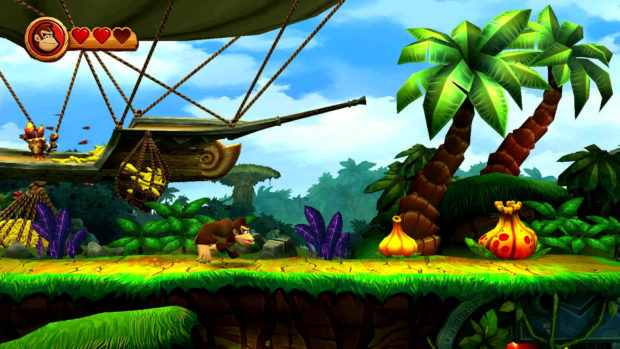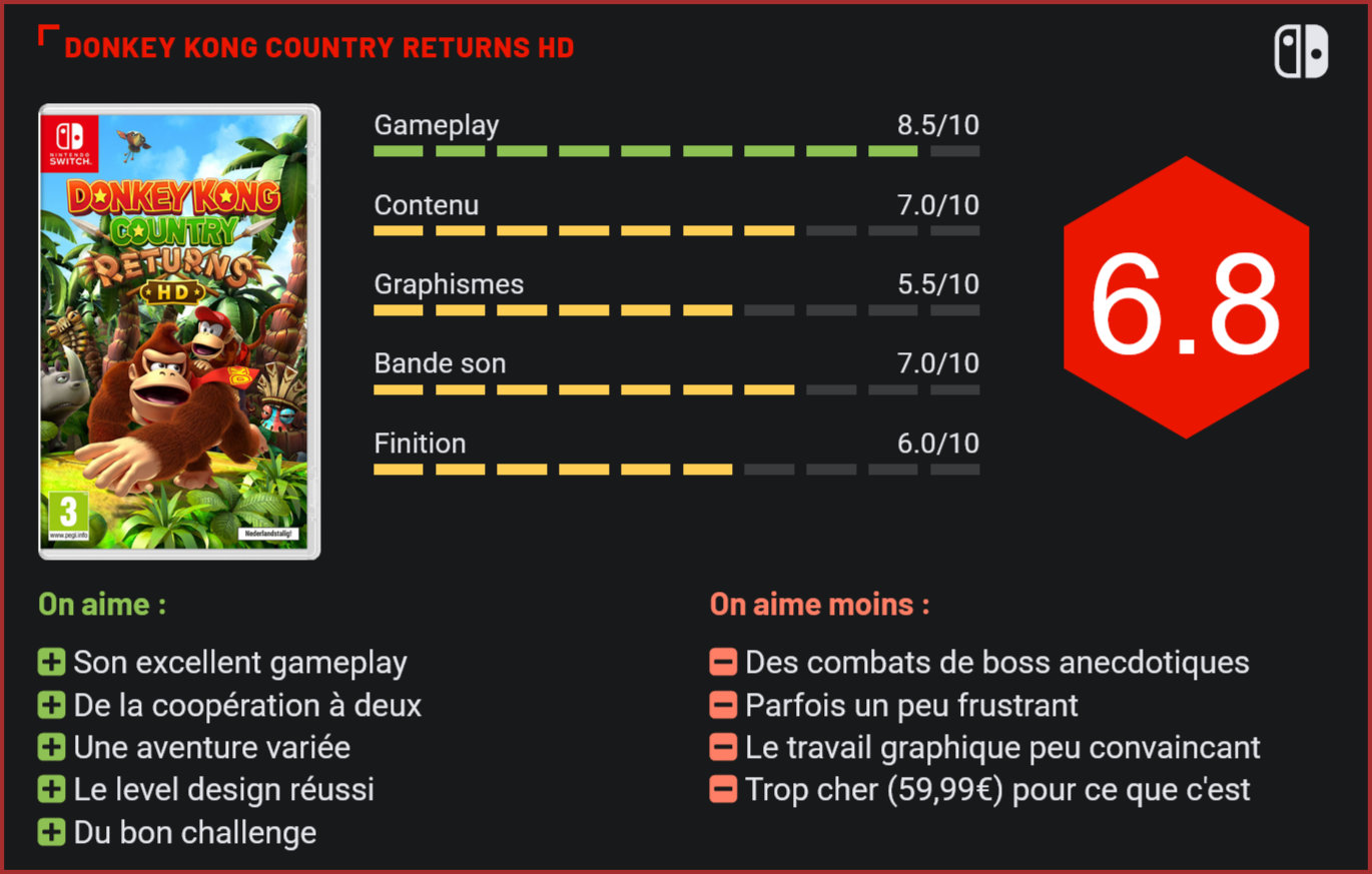 Plusieurs années après le portage de Donkey Kong Country Tropical Freeze sur Switch, c’est désormais son prédécesseur “Returns” qui débarque dans une nouvelle version pour la console de Nintendo. S’il est plus accessible que jamais, ce n’est pourtant pas la première fois que l’éditeur nous revend cette aventure. L’annonce de la nouvelle console de Nintendo sonne le glas pour la Switch, et les prochaines sorties pour la machine sont peu nombreuses. Le constructeur continue tout de même de proposer des titres comme ce “Donkey Kong Country Returns HD”, une nouvelle version du retour du gorille datant de 2010. Si le personnage n’avait jamais vraiment disparu, ce jeu marquait plutôt le retour des Donkey Kong Country, série de jeux de plateforme 2D très appréciée et débutée par Rare en 1994, mais reprise par Retro Studios depuis cet épisode “Returns” originellement paru sur Wii. Ce n’est pas la première fois que Returns fait son retour puisque le titre était aussi ressorti sur 3DS dans une version améliorée. C’est cette fois la Switch qui a droit à sa propre version améliorée, contenant le contenu ajouté de la version 3DS et des graphismes en HD. Dans Donkey Kong Country Returns HD, nous incarnons le héros de la franchise qui part explorer plusieurs endroits de son île pour se débarrasser d’une nouvelle menace. Une divinité tyrannique était profondément endormie dans le volcan de l’île, mais son réveil a provoqué le retour de la tribu Tiki Tak, des créatures qui semblent contrôler les animaux avec des sorts musicaux. Ces nouveaux ennemis en profitent aussi pour voler la réserve de bananes de Donkey Kong, et il n’en faut pas plus au héros pour partir à leurs trousses. Quinze ans après, cet épisode reste un incontournable de la licence. Comme souvent dans le genre, le scénario fait surtout office de prétexte pour nous lancer dans une dizaine de mondes différents, et environ 80 niveaux. Chacun d’entre eux sont des parcours en 2D, jouant parfois sur les perspectives, où l’on peut trouver tout un tas d’ennemis, de bananes à ramasser, plusieurs sortes de collectables ainsi que des tonneaux renfermant notre acolyte Diddy Kong qui peut alors nous accompagner. Porter ce dernier sur notre dos améliore les capacités de Donkey puisque le jet pack de Diddy lui permet de planer quelques secondes. Mais même seul, le gorille peut faire des roulades pour prendre de la vitesse, taper sur le sol pour activer des mécanismes et même souffler sur des éléments de décors. Le personnage se contrôle à merveille en répondant au doigt et à l’œil, même s’il faut s’habituer à son inertie un peu particulière. À noter que le jeu propose de faire les niveaux à deux en coopération locale, le deuxième joueur incarnant alors Diddy. Le titre propose des phases de jeu différentes. Le titre propose aussi des niveaux très ingénieux et toujours agréables à parcourir. Returns fait preuve d’une belle diversité aussi dans les situations proposées. La majorité des niveaux se font classiquement à pied, mais certains proposent d’utiliser une monture, d’autres sont des parcours en wagonnets ou sur un tonneau-fusée. N’oublions pas non plus la présence de petits stages bonus ainsi que des combats contre des boss. Si ces derniers ne sont pas toujours des plus mémorables, on retiendra surtout les niveaux qui s’en sortent beaucoup mieux. Les premiers sont relativement aisés à parcourir, mais Country Returns n’est pas un jeu qui nous tient par la main du début à la fin. De nombreux niveaux se montrent bien plus corsés et demandent beaucoup plus de maîtrise, ce qui démarque la licence de son cousin Mario. La difficulté n’est pas insurmontable non plus, en particulier pour les habitués du genre, mais cette nouvelle version HD propose deux modes de difficulté permettant de rendre les choses un peu plus accessibles. La version “moderne” donne plus de vie à Donkey Kong, tandis que la version “originale” permettra de jouer comme sur Wii. Plusieurs objets peuvent aussi être achetés et utilisés pour faciliter les choses, même si aucune de ces deux options ne trivialise l’expérience qui reste tout de même assez corsée et parfois un peu frustrante. Quelques niveaux ont une esthétique tout à fait différente. Returns est un jeu toujours aussi efficace, sauf au niveau de ses visuels. S’il n’est pas non plus désagréable à l’œil, il est malheureusement rarement joli à regarder. Il a pourtant un style visuel qui fonctionne, avec des niveaux bien mis en scène et parfois artistiquement très intéressants, mais on sent que le titre n’a pas bénéficié d’un vrai travail en profondeur. Le jeu ressemble finalement à sa version Wii un peu améliorée. On peut se consoler avec la bande-son sympathique du jeu signée par plusieurs compositeurs habituels de chez Nintendo. Le titre propose tout un tas de secrets et de choses à débloquer, permettant de venir gonfler sa durée de vie qui, sans ça, dure une dizaine d’heures. Cette nouvelle version ne propose malheureusement rien de plus que des graphismes revus en HD, ainsi que le contenu de la version 3DS. Une version “ultime” peu attrayante, et surtout, proposée au prix fort de 59,99€. Donkey Kong Country Returns HD est un remaster qui n’a pas nécessité une tonne d’efforts, ce qui est dommage pour ce jeu de plateforme 2D qui reste un plaisir à parcourir encore aujourd’hui. Conclusion Après avoir ressorti l’épisode Tropical Freeze, c’est au tour de Donkey Kong Country Returns de débarquer sur Switch dans une nouvelle version HD. L’excellent platformer 2D de la Wii était déjà revenu sur 3DS avec quelques améliorations, le revoilà sur Switch dans une version ultime. Cette aventure de Donkey Kong nous plonge dans 80 niveaux de plateforme 2D plutôt classiques, mais diablement efficaces. Avec un excellent game