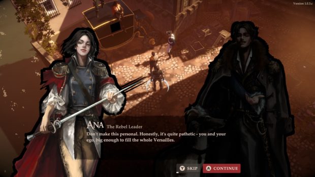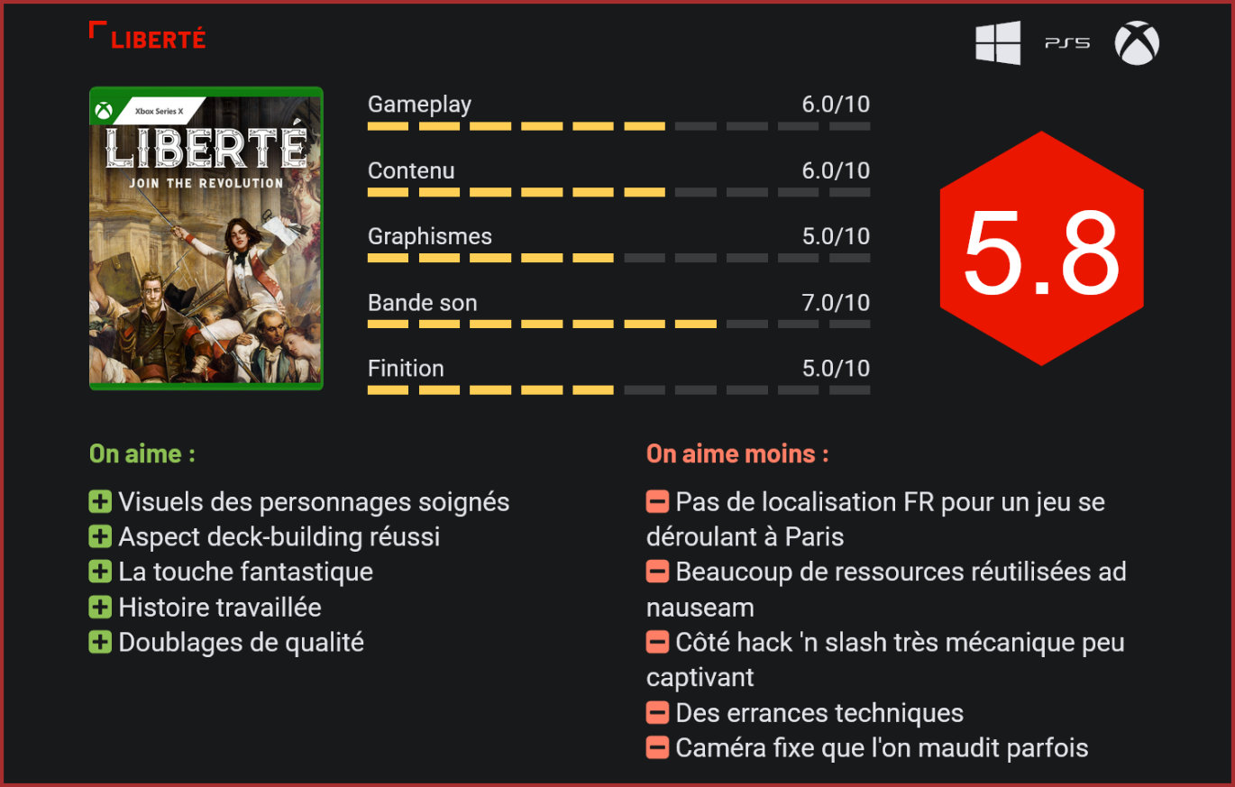 Ces derniers temps, les roguelike sont légion. Tout le monde y va de sa proposition pour le meilleur et pour le pire. Le studio polonais Superstatic a décidé de créer un jeu d’action qui se déroule dans un Paris alternatif lors de la Révolution française. Il essaie de se démarquer avec une mécanique de jeu basée sur les cartes, au risque de négliger d’autres parties. Superstatic part avec de bonnes intentions. Le studio exploite le contexte de la Révolution française qui est peu représenté dans les jeux vidéo. Les représentants les plus célèbres sont Assassin’s Creed Unity, Steelrising et We. The Revolution. Ces trois références partagent un point commun, elles profitent d’une direction artistique léchée. Liberté les rejoint en partie sur ce point précis. En effet, les artistes du studio ont clairement soigné les visuels des personnages. René, Ana, Victor et Flea, les quatre protagonistes jouables ont un certain charisme, tout comme Lady Bliss, une entité surnaturelle. Il est donc très agréable de voir leurs modèles affichés lors des discussions. Cela vaut également pour les personnages secondaires. En revanche, une fois en plein jeu, le charme se dilue. Visuellement, le titre est correct, sans plus. Les décors sont censés représenter un Paris alternatif du XVIIIème siècle mais, à part quelques éléments ci et là, ce n’est pas foncièrement flagrant. En plus, les développeurs réutilisent sans cesse les mêmes modèles et matérialisent des rues qui finissent par se ressembler. Quelques zones plus ouvertes et des passages en intérieur sont également de la partie pour apporter un peu de diversité. Néanmoins, les missions s’enchaînent et on a l’impression de passer encore et encore aux mêmes endroits. En revanche, on apprécie quelques éléments plus fantastiques qui prennent leur inspiration dans l’univers de H.P. Lovecraft. Dommage que l’aspect technique n’ait pas été plus travaillé. L’inconstance du framerate est gênante et l’expérience a été entachée par divers bugs, notamment dans les collisions. Les visuels des personnages pour les dialogues sont très soignés Si vous aimez l’Histoire, Liberté ne vous parlera pas forcément. En effet, s’il utilise le contexte de la Révolution française, il est loin de reprendre le véritable contexte historique. Il développe sa propre histoire fantastique. Pour le coup, nous incarnons René, un Parisien qui va rapidement faire la connaissance de Lady Bliss, une entité de grande taille qui a le pouvoir de le ressusciter. En échange, elle compte sur lui pour côtoyer les quatre factions qui se battent pour prendre le pouvoir suite à la mort du roi. Bien entendu, notre épéiste, dans sa quête du successeur du roi, va également tenter de comprendre la vérité qui entoure Lady Bliss. Le scénario est plutôt plaisant, avec des discours travaillés. Certes, certains dialogues tirent en longueur mais on apprécie le développement de l’histoire. Le seul regret, pour les non anglophones, c’est que le titre n’est pas localisé en français. Un comble pour un jeu qui se déroule à Paris. De même, les comédiens en charge des doublages sont investis et ça se ressent. Mais les accents sont bien loin de faire écho à des personnages français. Nous pouvons comprendre cette volonté de se porter vers l’international mais une localisation française n’aurait pas été un luxe dans ce contexte. Qui dit Révolution française, dit contexte propice aux affrontements. Cela ne manque pas. Liberté prend la forme d’un hack ‘n slash qui mise de base sur une mécanique de jeu très simple, à savoir attaquer et esquiver. Concrètement, une fois le tutorial passé, vous comprendrez rapidement que pour s’en sortir sans difficulté, il suffit d’enchaîner trois attaques, procéder à une esquive sous forme de dash et ré-attaquer avant d’esquiver à nouveau. En plus, les attaques des ennemis sont majoritairement matérialisées par une forme géométrique rouge au sol. L’occasion de déterminer leur portée pour plus facilement esquiver. Clairement, les combats ne sont pas difficiles mais le nombre des ennemis et les niveaux qui tirent en longueur peuvent avoir raison du joueur, si ce n’est pas le boss qui fait office de gros sac à PV répétant frénétiquement deux à trois attaques différentes. Il faut également reconnaître que la rigidité des animations n’aide pas forcément et que le jeu se montre vite punitif, chaque attaque ennemis enlevant une belle part de la barre de vie. La progression se fait avec une caméra fixe en vue du dessus à 3/4, les cartes jouables sont accessibles via un raccourci De fait, rogue-like oblige, vous allez mourir… Puis renaître dans les sous-sols de Paris pour discuter avec Lady Bliss, profiter d’une offrande (un bonus au choix parmi deux) ou vous préparer pour la prochaine run. C’est une sorte de HUB. Une fois que vous êtes prêt, vous devez vous rendre auprès d’une carte pour sélectionner la mission suivante. Le choix est restreint mais vous pouvez généralement faire avancer le scénario auprès d’une faction ou participer à une mission spéciale. Bien entendu, aider une faction signifie aller à l’encontre d’une autre. Or, c’est important de travailler sa relation puisque ça permet d’engranger de l’EXP et donc de débloquer des nouveautés, à commencer par trois autres personnages jouables. Attention toutefois, il y a une subtilité. C’est René qui prend la forme de l’un des trois autres personnages, ce qui implique qu’il reprend sa forme pour les dialogues. Néanmoins, cela permet de varier les approches, les quatre ayant leur propres caractéristiques. Par exemple, René est un épéiste qui assure pour les combats rapprochés alors que Ana mise sur les combats à moyenne distance en utilisant ses deux pistolets. Le piment du gameplay vient donc de l’aspect deck-build