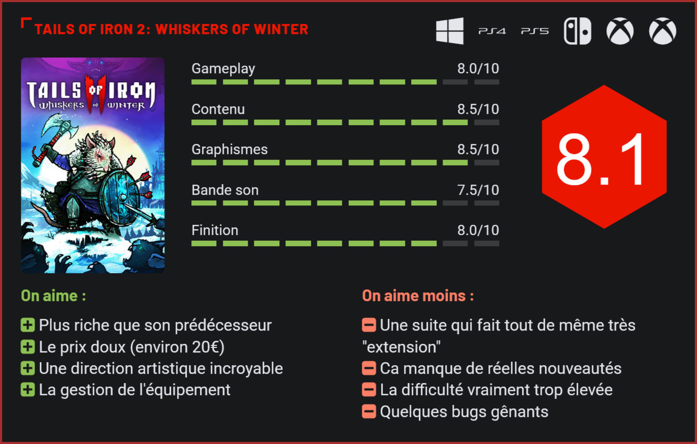 Passé relativement inaperçu bien qu’il s’agisse de l’un des meilleurs jeux indés de la décennie, le premier Tails of Iron avait placé les fondations pour une solide franchise. Plus riche en contenu que son prédécesseur, Tails of Iron 2 parvient à brillamment explorer le lore du jeu, tout en se mettant à dos une partie de la communauté de joueurs avec une difficulté élevée. Comme beaucoup d’autres joueurs, vous étiez sans doute passé à côté de l’excellent Tails of Iron. Quelque part à mi-chemin entre un jeu d’aventure en 2D et un souls-like, ce jeu atypique vous proposait de prendre entre vos mains la destinée d’un rat, engagé dans une lutte sans merci pour la survie de son royaume face à la menace des grenouilles. Cette suite reprend dans les grandes lignes le même concept tout en changeant le cadre. Direction le grand nord pour incarner cette fois le jeune héritier des Gardiens des Terres désolées qui va venger la mort de son père, terrassé dans sa forteresse par un être démoniaque. Plus sombre que le précédent volet, Tails of Iron 2 tire clairement son inspiration de Game of Thrones, sans toutefois tomber dans la parodie. Et il faut bien reconnaitre que la formule fonctionne plutôt bien. Certes, au début de l’aventure on a un peu l’impression de rejouer au même jeu. Le début de l’histoire est très similaire au début du premier volet. De façon général, le gameplay s’inscrit également dans la continuité du premier opus. Mais que les fans se rassurent, cette suite offre assez de nouveautés pour nous donner l’envie de l’explorer. Tails of Iron 2, c’est un peu une version boostée aux amphétamines du premier volet. Le jeu est plus long, plus complet, offre une aventure plus intéressante et surtout des combats de boss plus coriaces. Alors oui, on a un peu le sentiment de découvrir une extension de l’original. On retrouve quelques nouveaux ennemis, de nouveaux boss, de nouveaux environnements, mais le gameplay n’a pas énormément évolué. La plus grosse différence avec le premier volet, c’est le rehaussement de la difficulté. Tails of Iron 2 était un souls-like technique mais accessible. Sa suite l’est beaucoup moins. Un paquet de joueurs risque de rester bloqués sur le premier et le second boss… Et en ce sens, il est vraiment dommage qu’il ne soit pas possible de régler la difficulté plus bas pour ce public. Alors oui, cela plaira aux amateurs de challenge, mais par rapport au premier volet, ce Tails of Iron 2 se ferme des portes. L’autre regret, c’est qu’en dehors du contenu du jeu, il faut bien admettre qu’on retrouve peu de réelles nouveautés. Cela semble être le même moteur de jeu, le gameplay est quasi identique, une grosse partie de l’arsenal aussi… On aurait pu s’attendre à quelques nouveautés plus inspirantes. On aurait par exemple apprécie un côté exploration plus travaillé. Car en dépit de son orientation combats, le jeu aurait très bien pu lorgner du côté des metroidvania par exemple, et proposer ainsi davantage d’explorations et une meilleure exploitation du lore. Dans le même ordre d’idée, on regrette l’absence d’un mode coop qui aurait pu être un vrai plus à cette suite. Et puis, il y a les quelques petits défauts qui font tâche : des sous-titres en français qui viennent cacher la vue lors de combats intenses, quelques soucis de caméra aussi avec une visibilité parfois trop limitée, et quelques bugs gênants, avec des boss qui disparaissent. Le premier volet avait été beaucoup mieux optimisé pour sa sortie. Alors oui, les fans de l’original qui l’ont fini dans tous les sens seront certainement aux anges, surtout que la difficulté a vraiment été relevée de plusieurs crans. Mais cette suite risque malheureusement de contrarier pas mal de joueurs de par sa difficulté et son manque de réelles nouveautés. Avant de vous lancer dedans, on vous conseille fortement de vivre la première aventure en amont… Conclusion Si le premier Tails of Iron avait mis tout le monde d’accord en s’imposant comme l’un des meilleurs jeux indés de la décennie, sa suite risque de davantage diviser les joueurs. Les vrais fans seront sans doute aux anges avec une aventure plus longue, mieux maitrisée et une difficulté rehaussée. Les autres pesteront contre cette difficulté frustrante, le manque de réelles nouveautés et d’inspiration. Oui, Tails of Iron 2 ressemble davantage à une grosse extension qu’à une suite, mais ce n’est peut-être pas plus mal. Une chose est certaine : la direction artistique du titre mettra tout le monde d’accord. Les amoureux de souls-like ont là un nouvel incontournable à explorer…