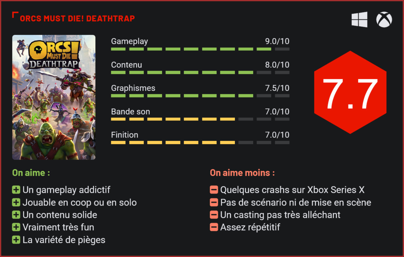 Née sur Xbox 360 et développée par certains des créateurs de la légendaire saga des Age of Empires, la série des Orcs Must Die! au se forger au fil des années une communauté de fans. Avec Deathtrap, Robot Entertainment tente d’élargir le champ des possibilités en livrant un jeu orienté coopération. Si la série des Orcs Must Die! a rencontré un joli succès en digital, elle n’a jamais vraiment sauté le pas du double-A ni même du triple-A. Avec Deathtrap, Robot Entertainment nous livre un titre beaucoup plus ambitieux, qui sort du carcan de la petite production indépendante. Deathtrap risque pourtant de ne pas mettre tout le monde d’accord car cet épisode change la formule en y apportant un tas de petites nouveautés. Cette fois, c’est sûr, ils ne passeront pas ! Tout d’abord, jusqu’ici, la série était surtout centrée sur son mode solo. Avec cet épisode, Robot Entertainment livre un jeu qui est avant tout coop, bien qu’il puisse être joué en solitaire également. Le plus gros reproche qu’on lui fera, c’est d’épouser complètement ce côté “services”, sans préliminaire. Pas de scénario, pas de mise en scène, pas même de tutoriel en dehors de quelques vidéos à visionner depuis un menu… C’est un peu austère, il faut l’avouer. On se retrouve directement dans un hub depuis lequel on pourra lancer des missions, acheter de nouveaux pièges, améliorer ses compétences, améliorer ses pièges et acheter de nouveaux fils (on y reviendra). Il y a de nombreux éléments à débloquer. Que les fans se rassurent toutefois : le concept reste le même. Une fois une partie lancée, on se retrouve donc à massacrer des orcs à la chaine. Il faudra ici à tout prix protéger sa “faille” en empêchant les trolls d’y arriver. Et pour y arriver, il faudra “contrôler le troupeau” en traçant un chemin pour lui à l’aide des blocs à votre disposition pour bloquer des points de passage. Les crédits à votre disposition vous permettront de placer différents pièges sur le tracé. Il faudra également mettre la main à la pâte en participant directement aux combats. Orcs Must Die! est en ce sens un curieux mélange de jeu stratégique et d’action, une formule qui fonctionne étonnamment bien. L’originalité de cet épisode, en plus de reposer sur la coopération entre 4 joueurs, c’est d’ajouter une formule rogue-like totalement inédite pour la série. Concrètement, chaque partie sera composée d’une succession de missions qui se termineront par un combat de boss. A vous de quitter quand vous le souhaitez pour préserver vos gains – précieux pour débloquer compétences et améliorer vos pièges. A chaque nouvelle mission, vous devrez choisir un “malus” qui variera du tout au tout puisqu’il pourra s’agir de troupes additionnelles pour les orcs, de failles qui mettront en danger vos défenses, d’ennemis renforcés, de conditions spéciales, etc. A chaque nouvelle vague (une partie en compte généralement 6), vous pourrez aussi choisir un bonus, qui ira du renforcement des attaques de votre unité, à l’amélioration d’un piège, à l’augmentation de votre santé, à des blocs additionnels… Un concept bien rôdé, qui a toutefois tendance à donner au jeu un côté assez répétitif. Le casting comprend une demi-douzaine de personnages. Deathtrap se distingue aussi de ses prédécesseurs par son système de combos. Concrètement, il faudra tenter de réaliser des combos en combinant des pièges et attaques : une blessure par le feu, couplée à une blessure par laser, couplée à une flèche équivaudra à un combo x3, qui donnera plus de crédits pour renforcer ses défenses qu’un combo x1. Autrement dit, il faudra être fin pour disposer d’assez de crédits pour remporter la partie. D’autant plus que les ennemis ont tendance à être plus sensibles à certains types de pièges selon leur nature. Seul ou à plusieurs le jeu est fun et sait réserver une solide dose de challenge. Les combats de boss font partie des moments forts du jeu et il faudra compter au bas mot une trentaine d’heures pour voir le bout de l’aventure. La montée en puissance du personnage est assurée par un système d’amélioration bien rôdé des pièges et du personnage. Bref, la formule “live” fonctionne. Côté technique, le jeu impressionne également avec de très jolis graphismes, des modélisations soignées et peu de bugs. Deux défauts sont toutefois à noter : le jeu a tendance à crasher sur Xbox Series X (pas S ni sur PC) de façon répétée – un patch corrigera sans doute ce problème – et la direction artistique des personnages divisera certainement. Conclusion Avec Orcs Must Die! Deathtrap, Robot Entertainment donne à sa série une nouvelle direction “jeu service” qui lui colle étonnamment bien à la peau. Pensé pour être joué à 4 joueurs, Deathtrap est un jeu coopératif prenant, au gameplay et mécanismes bien rôdés, qui mélange brillamment action et stratégie. La formule reste la même qu’avec les précédents opus : protéger une faille des vagues d’orcs qui arrivent en plaçant des tas de piège sur leur chemin et en prenant part soi-même aux combats. Si le jeu est globalement très réussi, et idéal pour s’éclater entre amis, il faut toutefois admettre qu’il a quelques défauts : l’absence totale de narration, un casting pas très excitant pour le moment et un côté assez répétitif tout de même. Notons également que sur Xbox Series X, le jeu est victime de crashs réguliers.