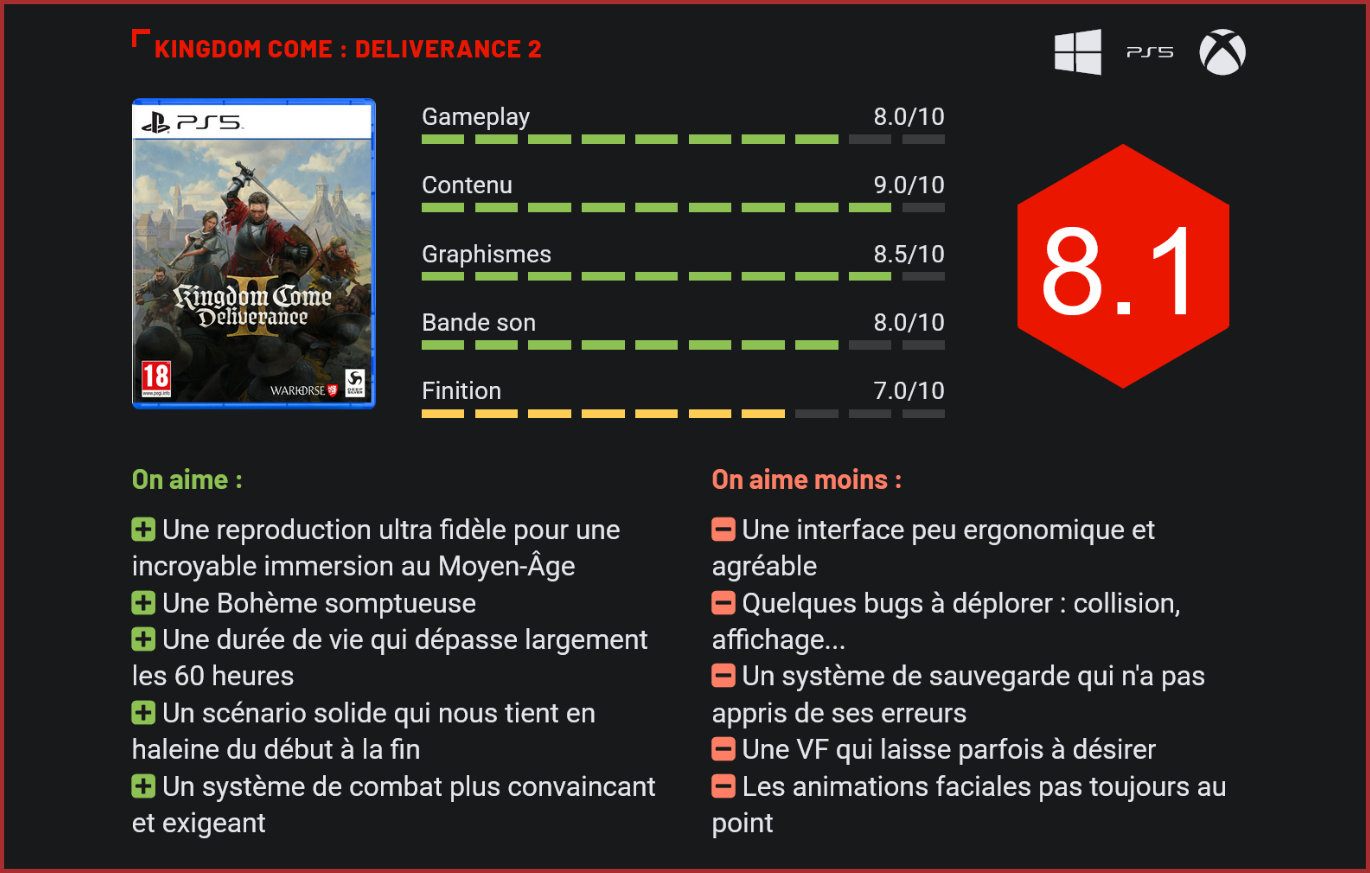 Vous l’attendiez, elle débarque enfin ! Sept ans après un premier épisode plébiscité, la franchise Kingdome Come revient avec un épisode plus riche, plus complet et plus beau encore. Jamais un RPG dans un univers médiéval n’avait eu autant de succès depuis Skyrim. En 2018, Kingdom Come: Deliverance avait fait sensation pour son univers riche et immersif dans une Bohème plus vraie que nature. Les options de personnalisation et l’impact de nos actions sur le monde avaient notamment permis au titre d’atteindre les huit millions de ventes après 6 ans de commercialisation. Après un tel succès, l’arrivée d’une suite ne faisait que peu de doutes. Les équipes de Deep Silver et Warhorse Studios se sont attelées à la création du deuxième opus dès la sortie du premier, avec une date de sortie attendue pour ce début d’année 2025, soit pile sept ans plus tard. Sept ans séparent la sortie des deux titres, mais l’histoire, elle, reprend là où Kingdom Come premier du nom nous avait laissés. Au beau milieu de la Bohème, l’actuelle République tchèque, Henry bataille pour venger sa famille contre les pillages menés par le roi Sigismond de Croatie. Nous sommes alors au tout début du XVe siècle, dans un Saint Empire romain germanique traumatisé par les guerres de succession entre les fils du défunt Charles IV. À l’époque, la Bohème est le royaume le plus puissant du Saint-Empire. Le monde de KCD2 est ultra riche et détaillé. On se retrouve plongés dans une Tchèquie moyenâgeuse tellement réaliste. C’est d’ailleurs bien ce qui permet à Kingdom Come de se démarquer de ses concurrents. La franchise éditée par Deep Silver se veut ultrafidèle à la réalité. Cela va du gameplay, avec des mécaniques de RPG hyper profondes (nous y reviendrons), à l’histoire et à l’univers, qui nous immergent dans une Tchéquie plus vraie que nature. Tout est fait pour que nous ayons l’impression d’être de véritables acteurs du Moyen-Âge, avec son insalubrité, ses châteaux forts, ses serfs, mais également sa féodalité. C’est assez rare qu’un jeu vidéo reproduise aussi bien le monde réel. Tout est pensé pour que l’on fasse attention aux moindres de nos faits et gestes. Votre joueur devra régulièrement se laver s’il ne veut pas risquer des infections. Un aliment un peu trop pourri risque de rendre malade Henry, tandis que des actions illégales peuvent vous conduire au cachot ou au pilori pour la nuit. Le joueur a ainsi l’occasion d’être plongé au beau milieu du Moyen-Âge, avec ses charmes, mais également ses nombreux inconvénients. L’univers de Kingdom Come: Deliverance 2 est un monde en perpétuel changement, et vous vous en rendrez rapidement compte à vos dépens. Visuellement, ce Kingdom Come Deliverance 2 est encore plus beau et réussi que son aîné. Seules les animations faciales font quelque peu tache. Le récit, bien qu’il suive des événements historiques réels et forts, ne nous limite jamais à une histoire linéaire dont nous devons suivre, tel un spectateur, les événements. Nous sommes constamment impliqués dans toutes les décisions prises par notre héros. Tous ses choix de dialogue ont une incidence sur les événements à court, moyen ou long terme. On peut ainsi choisir d’adopter un phrasé plus agressif, plus diplomate ou encore plus amical, avec des répercussions plus ou moins positives. Jamais un RPG n’a autant donné l’impression d’impliquer le joueur que ce soit dans les interactions du personnage ou dans son style de vie. Un tel réalisme est également permis par un moteur de jeu très qualitatif, le CryEngine. Les décors sont absolument divins, avec des effets de lumière toujours très justes et prêts à sublimer les décors de Bohème à chaque instant. Nous émettrons juste quelques réserves quant à la reproduction des animations faciales, bien trop rigides et peu réalistes, qui viennent légèrement ternir le tableau du réalisme. Notre test s’est effectué sur une Xbox Series X. Jamais nous n’avons subi des ralentissements dans le mode fidélité, preuve s’il en est de l’excellente optimisation du titre. Les scènes d’action et de combats sont toujours très fluides, tandis que les temps de chargement sont bien plus courts que dans le premier épisode. Kingdom Come Deliverance 2 respecte divinement les lores du Moyen-Âge. Tant et si bien que l’on a presque l’impression d’y être nous-mêmes immergés. En revanche, les paysages étant très riches en détails, il est très fréquent que nous ayons affaire à du clipping, ces éléments lointains qui apparaissent au fur et à mesure que nous progressons. C’est un défaut récurrent des gros jeux aux moyens plus limités, peu grave, mais ça fait tout de même tache dans un jeu qui se veut très réaliste. Nous évoquions le réalisme du jeu et son univers médiéval si fidèlement reproduit. Dans le développement d’un jeu, sa direction artistique ne serait rien sans une bande originale de qualité. Sur ce second épisode, Warhorse Studios s’est surpassé par rapport au précédent volet. Les musiques sont encore plus réussies et épiques qu’auparavant, nous donnant l’impression de vivre une aventure épique aux quatre coins de la Tchéquie médiévale. Seul petit souci avec le doublage francophone, où certaines voix sont peu convaincantes et adaptées au personnage. En même temps, l’univers de KCD2 est tellement vaste et peuplé que c’est un sacré pari de calibrer chaque voix à chaque PNJ. Les développeurs ont toutefois annoncé qu’ils publieraient des mises à jour pour améliorer la qualité du doublage, ouf ! Les combats à l’épée et au corps à corps, bien qu’imparfaits et sujets à quelques améliorations, sont ultra exigeants et assez jouissifs quand on les prend bien en mains. Concernant le gameplay, et notamment les combats à l’épée, on sent qu’il y a du mieux 