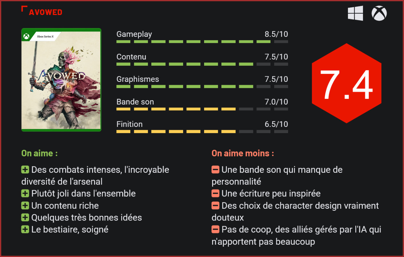 Avec Avowed, Obsidian propose de quoi nous occuper jusqu’à la sortie du prochain Elder Scrolls. Séduisant sur le papier, le jeu ne parvient toutefois pas à réaliser toutes ses ambitions. Explications. Obsidian est sans l’ombre d’un doute l’un des studios Xbox les plus prolifiques et les plus talentueux également. Le studio a forgé sa réputation avec l’excellent Fallout: New Vegas, mais plus récemment, il nous a également livré des pépites comme Grounded, Pentiment et le très sympathique The Outer Worlds. Il nous revient aujourd’hui avec sa dernière création, Avowed. Les environnements du jeu sont très réussis et recèlent surtout de lieux, tombes et donjons à explorer. Prenant place dans le même univers que l’une des séries cultes du studio – Pillars of Eternity -, Avowed est toutefois un jeu très différent puisqu’il s’agit d’un action RPG se jouant entièrement à la première personne. Obsidian ne s’en est jamais caché : il s’agit de son projet le plus ambitieux à ce jour. Et il s’agit également d’un titre qui vient combler un trou béant dans le line-up de l’éditeur. Le prochain épisode de la saga The Elder Scrolls ne sortira pas avant des années. Avec Avowed, l’éditeur répond donc à une réelle demande des joueurs et amateurs de fantasy. Car, même s’il ne s’agit pas d’une copie du jeu de Bethesda, il faut bien avouer qu’Avowed s’en inspire assez largement avec ses tomes oubliés à récupérer, son univers open-world et ses millions de lignes de dialogues. Pour autant, Avowed parvient à créer sa propre identité en misant essentiellement sur son gameplay. Difficile de créer un “héros” qui vous plaise, visuellement. Avant d’aller plus loin dans ce test, il convient de marquer les différences avec The Elder Scrolls. Avowed est un jeu qui est beaucoup plus orienté action que son modèle. Tout le gameplay ou presque repose sur les combats. Il y a certes des composantes RPG et des millions de lignes de dialogue, mais c’est bien dans les combats qu’Avowed se distingue de TES. Les affrontements sont en effet beaucoup plus nerveux que dans un Skyrim, avec un système d’esquive bien pensé et surtout un nombre impressionnant d’armes et de pouvoirs à utiliser. On ne se limite pas ici à quelques épées, lances, haches et arcs puisque vous pourrez aussi utiliser diverses armes à feu et surtout des sors, à l’aide de votre livre de sort et de votre baguette magique. Certaines armes peuvent être enchantées pour ajouter des effets comme un embrasement par exemple, et surtout le joueur pourra utiliser deux armes simultanément. Par exemple, un poignard et un livre de sort, qui lui permettra d’envoyer des boules de feu sur son adversaire tout en étant capable de se défendre au corps à corps également. Autre différence majeure avec Skyrim : vous parcourrez l’aventure avec des alliés – malheureusement pas en coopératif (et c’est un gros regret tant le jeu s’y prêtait plutôt bien !) mais avec 2 compagnons gérés par l’IA, disposant chacun de leurs spécificités et auxquels vous pourrez donner des ordres. On se sent d’un coup beaucoup moins seul… Les combats sont nerveux et intenses, tout l’inverse de ce qui nous avait été montré lors de la présentation du jeu ! Et puis, bien sûr, au niveau de l’univers. Les terres vivantes offrent une diversité de paysages étonnante, des contrées désertiques aux forêts luxuriantes en passant par les souterrains ténébreux. Chaque écosystème ne compose toutefois qu’une petite partie du gigantesque open-world du jeu, segmenté en plusieurs open world miniatures. On ne traverse donc pas la carte sans temps de chargement, malheureusement. L’avantage, c’est que ça a le mérite de proposer plus de diversité. Et ce n’est finalement pas plus mal. On notera au passage qu’Avowed parvient à créer un univers riche et captivant, avec un bestiaire varié et un véritable lore. Toutes les idées ne sont toutefois pas forcément les bienvenues, à l’image du design de notre héros – aux traits physiques pour le moins particuliers puisqu’il affiche des excroissances fongiques, lesquels représentent une connexion avec le divin. On ne va pas tourner autour du pot, le personnage que vous incarnerez est moche, et ce quel que soit le type de personnalisation qu’on lui applique. Comme “The Outer Worlds”, Avowed souffre aussi d’un cruel manque d’inspiration dans son character design. Si les monstres sont joliment designés, les humains et personnages humanoïdes le sont beaucoup moins… Les designs sont ultra-génériques, les personnages pas attachants pour deux sous et surtout, la mixité et l’inclusion à tout prix (les fameuses DEI tant décriées par une partie des joueurs) ont créé un joli bordel d’idées qui partent un peu dans tous les sens. Il n’est de facto pas toujours facile de garder son sérieux quand on discute avec un schtroumpf géant aux rastas que lui envierait presque Bob Marley. Et quelque part, oui, on aurait aimé un peu plus de sérieux, de classicisme dans cet univers. C’est le principal reproche qu’on lui adresse : les choix de designs sont discutables. Souvent génériques voire carrément “hors-limites” du fantasy. Autre gros défaut du jeu : l’écriture est elle aussi très générique avec des dialogues souvent creux, des choix de dialogues parfois franchement douteux et une histoire qui n’est globalement pas captivante à suivre. Quel gâchis. On le sent également, le développement du jeu a été accéléré en fin de course. Comme de nombreux autres jeux double-A ou triple-A, Avowed nous est livré dans un état peu convaincant à sa sortie. Vous aurez le choix entre un mode visuel et performances. Inutile de vous le préciser : le mode visuel est pratiquement injouable. Le mode performances déçoit également avec un framerate bien inférieur à 60 FPS la plupart