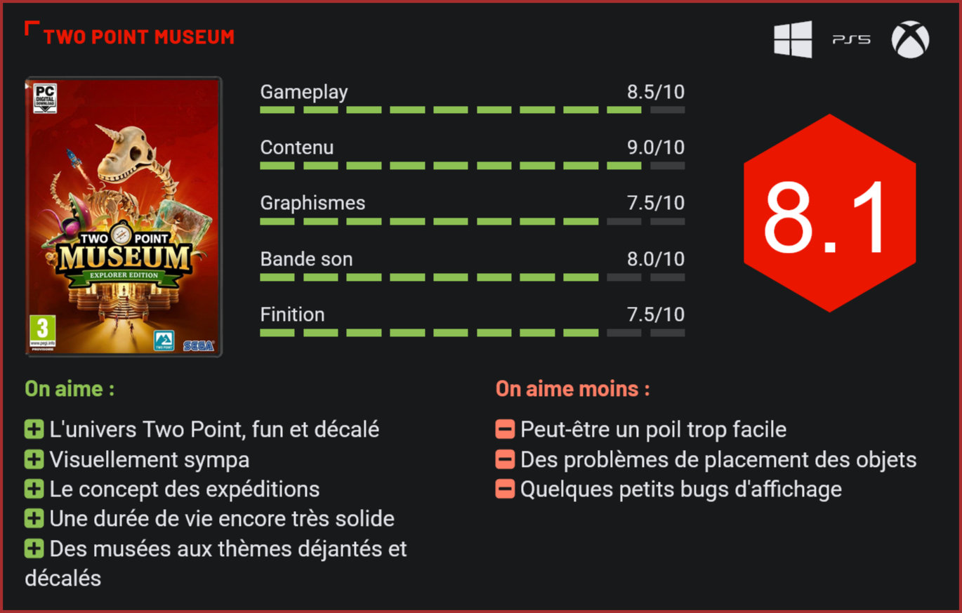 Après les hôpitaux puis les campus universitaires américains, la franchise Two Point fait un détour vers les musées. Vous êtes désormais conservateur de musée ! Qui aurait pu prédire un tel succès et le début d’une nouvelle franchise lorsque Two Point Hospital est revenu sous la forme d’une suite en 2018 au cultissime Theme Hospital de 1997 ? Et pourtant, en sept ans, ce sont deux épisodes à succès qui ont été développé, un à l’hôpital et un à l’université, ainsi qu’un troisième opus attendu pour le 5 mars prochain et destiné à nous propulser dans … des musées. Fini les brancards et les pupitres de professeurs. Ici, c’est avec des fossiles que vous allez faire carrière dans des musées qui n’ont franchement rien d’habituel. On connaît la franchise Two Point, ce sont des jeux de gestion dans des univers exagérés et loufoques. Two Point Hospital nous mettait face à des maladies comme la diarrhée verbale ou la Lycanthropie, Two Point Campus proposait de dispenser des cours de chevalerie, et Two Point Museum nous met aux commandes, entres autres, d’un musée du surnaturel avec des fantômes. Two Point Museum, c’est un peu “Two Point Hospital mais au musée”. Là où Two Point Campus nous obligeait à davantage prendre le compte le confort et la bonne formation des étudiants, Two Point Museum se rapproche davantage du premier épisode du triptyque. Il est beaucoup plus simple dans son fonctionnement que Campus, mais apporte tout de même quelques nouvelles mécaniques de gameplay franchement bien fichue. Chaque œuvre demandera que l’on augmente son niveau de buzz en décorants es alentours, mais également en indiquant toutes les informations à son propos. Ici, il n’est donc plus question de partir dans la création de salles de traitement ou de salles de classe. En réalité, les “salles” arborent ici une importance moindre par rapport aux deux précédents épisodes, bien qu’elles restent toujours présentes. Là où les deux autres Two Point ne fonctionnaient qu’avec les salles, Two Point Museum privilégie avant tout les expositions placées un peu partout dans votre musée, comme n’importe quel objet. Après tout, nous sommes à la tête d’un musée, et un musée fonctionne principalement avec des grandes galeries d’exposition où on retrouve tableaux et œuvres. Sauf que, vous l’aurez bien compris, Two Point Museum ne vous met pas aux manettes d’un banal musée. Ici, vous aurez à exposer des œuvres issues de la vie marine, de la préhistoire, de la botanique, de l’espace, du surnaturel et des sciences. Vous devrez alors les mettre en avant afin d’augmenter votre jauge de buzz. Plus une œuvre fait du buzz, plus elle attire du public et permet d’engranger un maximum de dons. Pour la mettre en avant, rien de plus simple : de la décoration, de la décoration, et encore de la décoration. Plus la jauge est élevée et plus vous récolterez de dons vous permettant d’envoyer votre personnel en expédition. On reconnaît la patte si chère à la série : du fun, de la couleur et des personnages déjantés. Dans TPM, le nerf de la guerre, c’est les expéditions. Il faut savoir que vous débuterez sans aucune œuvre à exposer, si ce n’est les quelques défis habituels qui exigeront de vous de mettre en avant une œuvre temporaire contre de l’argent. Pour agrémenter votre collection, il faudra envoyer des explorateurs aux quatre coins de l’univers Two Point afin d’y faire des fouilles. Des pénalités vous sont attribuées en fonction des lieux, pénalités que vous pourrez supprimer avec des accessoires bonus, et l’expédition ne demande ensuite plus qu’à être menée ! Plusieurs paramètres entrent en ligne de compte, comme la durée de l’expédition, sa dangerosité, son coût… Parfois, lorsqu’une expédition est en cours, vous serez même mené à faire des choix plus ou moins importants impactant le déroulement de l’exposition. Menées à partir d’un héliport, les expéditions sont la vraie bonne idée de ce Two Point Museum qui ne se contente pas de nous servir les œuvres sur un plateau d’argent et de les répartir ici-et-là juste en dépensant des dollars. Parfois, votre personnel devra même être formé en fonction de l’univers à explorer ou pourra même revenir blessé tellement l’expédition était dangereuse. Une fois une expédition réussie, vous recevez une grande caisse en bois dans laquelle se trouve votre découverte. Vous l’exposez alors dans le musée puis devez donc la mettre en avant et la renseigner suffisamment pour que les visiteurs puissent pleinement en tirer profit. L’univers Two Point étant extrêmement déjanté, on se retrouve avec des musées qui partent dans tous les sens. Ainsi, le musée sur le surnaturel nous propose de partir dans les bas-fonds de la Terre en expédition pour retrouver des œuvres, mais aussi des fantômes qu’il faut apprivoiser grâce aux chasseurs de fantômes et loger avec une chambre adapté à leur époque. Une fois la jauge d’adaptation de l’esprit arrivée à son terme, le fantôme fuira sa chambre et hantera votre musée. A vous de le rechasser. Dans les musées de la vie marine, ce sont littéralement des aquariums qui pourront être construits, dont il faudra là aussi gérer la décoration, mais aussi la température de l’eau en fonction des espèces. Tous les moyens sont bons pour faire le musée de vos rêves. Il n’y a peut-être toutefois pas suffisamment de défi que pour rendre la chose vraiment gratifiante. Bref, vous l’aurez compris, Two Point Museum conserve cet aspect déjanté propre à la franchise. Le jeu reste enfantin, avec des personnages décalés et un gameplay simplifié au plus haut point. Peut-être un peu trop simplifié, puisque ce Two Point Museum est probablement l’épisode le plus facile de la francise. Jamais, dans nos parties de la campagne ou du mode bac à