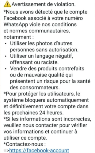 Un message frauduleux annonce à ses victimes que leur compte (WhatsApp, Facebook, Instagram…) va être bloqué dans les prochaines 24 heures. Un lien mis en avant permettrait de régler la situation, mais il ne faut en aucun cas cliquer dessus. Ce type d’arnaque connaît une recrudescence depuis quelques semaines. Le principe est simple : vous recevez un message vous indiquant que votre compte (Facebook, WhatsApp, Instagram…) va être bloqué ou supprimé en raison du non-respect des conditions d’utilisation. Dans la majorité des cas, ce type d’arnaque copie la charte graphique d’une plateforme et reprend son logo afin de tromper les victimes. À titre d’exemple, le message frauduleux ci-dessous indique : « Nous avons détecté que le compte Facebook associé à votre numéro WhatsApp viole nos conditions et normes communautaires, notamment : utiliser les photos d’autres personnes sans autorisation, utiliser un langage négatif, offensant ou raciste, vendre des produits contrefaits ou de mauvaise qualité qui présentent un risque pour la santé des consommateurs ». Le message avertit ensuite : « Pour protéger les utilisateurs, le système bloquera automatiquement et définitivement votre compte dans les prochaines 24 heures ». Bien entendu, un lien mis en avant permettrait de régler la situation. La victime, n’étant probablement coupable d’aucune des accusations citées ci-dessus, sera alors tentée de cliquer sur ce lien. En réalité, ce lien mène vers un faux support technique d’une plateforme connue (Facebook, WhatsApp, Instagram…). La victime est ensuite invitée à saisir ses identifiants et mots de passe. L’air de rien, cette arnaque est particulièrement pernicieuse. En effet, même si la victime n’a commis aucune infraction, elle peut penser qu’un pirate utilise son compte à des fins malveillantes. Mais comment détecter ce type d’arnaque ? Pour rappel, les plateformes en ligne ne contactent jamais leurs utilisateurs par message privé. Évitez donc à tout prix de cliquer sur des liens externes. Si vous avez un quelconque doute, rendez-vous directement dans les paramètres de votre compte. Enfin, comme toujours, ne cédez jamais aux coups de pression et aux ultimatums (“le système bloquera votre compte dans les prochaines 24 heures”).