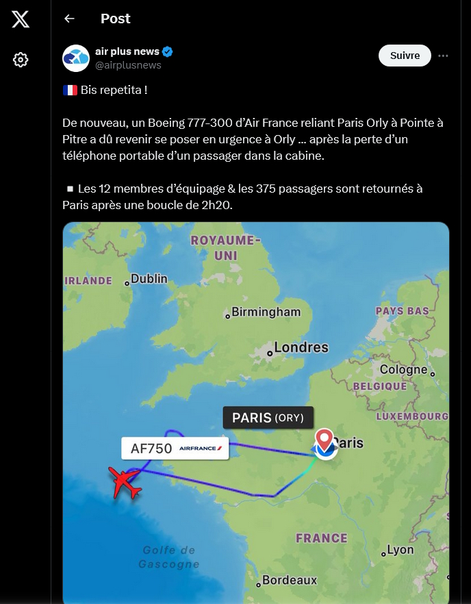 Une heure après le décollage d’un avion d’Air France en direction de la Guadeloupe, l’équipage a été contraint de faire demi-tour. Le retour a Paris a été provoqué par la perte du smartphone d’un passager. On vous explique. Ce 21 mars, un Boeing 777-300 d’Air France a décollé de Paris Orly en direction de Pointe-à-Pitre en Guadeloupe. Si tout se déroulait comme prévu, sans incident technique notable, le vol a tout de même dû être chamboulé. L’avion est revenu à l’aéroport de départ pour s’y poser en urgence. Comme l’indique le compte @airplusnews sur le réseau social X, un passager a égaré son smartphone dans la cabine. C’est cet événement qui a forcé le retour du vol, seulement une heure après son décollage. Cela a contraint les 12 membres de l’équipage et les 375 passagers à faire une boucle de 2h20. Crédits : @airplusnews via X.com Si la solution mise en place peut paraître disproportionnée, celle-ci a été prise pour garantir la sécurité de tous. En effet, l’équipage ne pouvait pas prendre le risque que la batterie du smartphone puisse prendre feu. Les conséquences auraient alors pu être bien plus dramatiques. Une situation similaire est survenue le mois dernier, forçant un Boeing 777-300 d’Air France à faire demi-tour durant un vol reliant Paris Charles-de-Gaulle à Fort de France. En l’occurrence, l’appareil du passager était passé au travers d’une grille d’aération du galley. Enfin, rappelons qu’un iPhone 6 avait était la cause d’un incendie en 2016. L’incident s’était produit à bord d’un avion d’Alaska Airlines qui reliait Washington à Hawaï. Même si ce dernier avait pu atterrir en toute sécurité, le risque n’en reste pas moins grand.