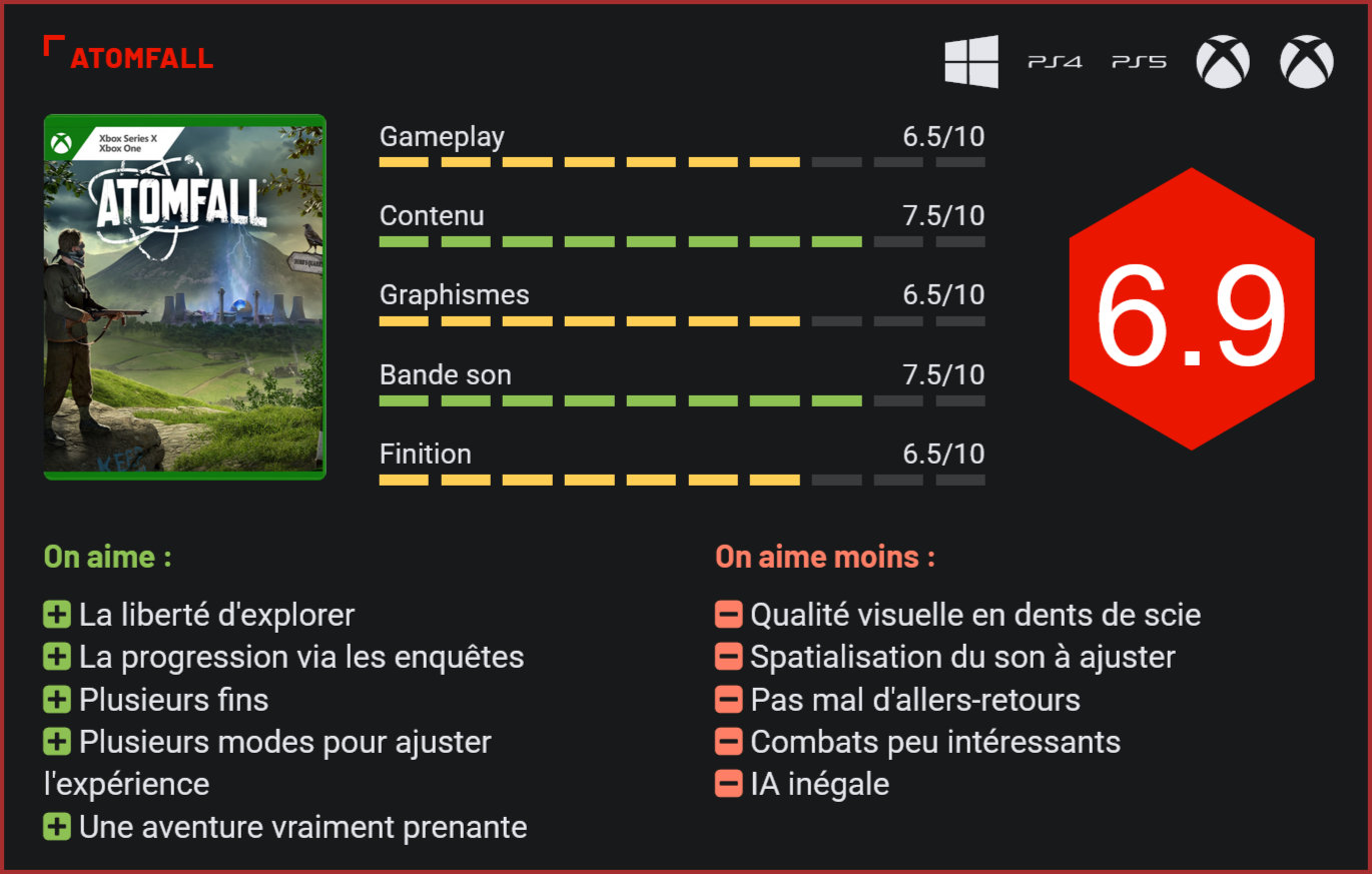Avec la série des Sniper Elite, Rebellion a habitué les joueurs à des jeux qui mélangent action, infiltration et grand spectacle. Avec son nouveau projet, Atomfall, le studio développe un autre univers plus orienté survie. Ce nouvel AA mise également sur une plus grande liberté d’action pour permettre à tout un chacun d’avancer sans être tenu par la main. De belles promesses qui se concrétisent bien, non sans quelques heurts. Rebellion est un studio anglais qui produit des jeux depuis plus de 30 ans. Néanmoins, ces dernières années, ce sont deux licences qui ont accaparé la majeure partie de l’attention des développeurs. La première, c’est Zombie Army, tandis que la seconde c’est Sniper Elite. Cette dernière a notamment basé sa réputation sur les tirs mis en scène avec une caméra aux rayons X pour montrer l’impact des balles sur les corps et à l’intérieur de ces derniers. De temps en temps, le studio tente de lancer de nouvelles licences, comme Strange Brigade en 2018 ou plus récemment Atomfall. C’est justement ce dernier qui nous intéresse. Rebellion sort un peu des sentiers battus en proposant cette fois un jeu de survie. On oublie les habituels nazis pour se rendre dans le nord de l’Angleterre, cinq ans après la (véritable) catastrophe nucléaire de Windscale. On atterrit dans une zone de quarantaine fictive dans la peau d’un personnage amnésique. Ce dernier va reprendre connaissance dans un laboratoire, le temps d’obtenir les premières bribes d’informations pour savoir à quoi s’attendre. Ensuite, et c’est la grande force du jeu, la narration se mettra en place en fonction des choix du joueur. Concrètement, on évolue dans des zones ouvertes (ce n’est pas un jeu en monde ouvert à proprement parler) sans indicateur précis. On doit donc aller de rencontre en rencontre pour tenter de comprendre où l’on se trouve, ce qu’il se passe et ce que l’on doit faire. Dans les grandes lignes, il faut se méfier des hors la loi et faire le nécessaire pour sortir de la zone en ouvrant les portes d’un échangeur… Et surtout comprendre le rôle d’Oberon et décider de son sort. Nous n’en dirons pas plus pour éviter tout spoil mais sachez qu’il existe plusieurs fins, en fonction de vos choix et des personnages auxquels vous accordez votre confiance. L’histoire se construit donc au fil des dialogues à choix mais surtout au fil des personnes que vous rencontrez ou non (avec la possibilité d’être guidé selon la difficulté). En effet, même si quelques points de passage sont obligatoires, vous pouvez très bien faire une partie sans parler à certains personnages clés ou en prenant des décisions autres, comme le fait de tuer tout le monde (la possibilité est donnée mais vous pouvez en subir les conséquences). Bien entendu, vous verrez lors des discussions que certains choix s’imposent d’eux-mêmes si vous souhaitez obtenir plus d’informations et donc vous faciliter la progression, voire pour faire du troc (avec un système de balance pour gérer l’équité de ce dernier bien fichu). Néanmoins, le choix d’avoir une attitude plus méfiante, hostile ou arrogante est laissé. Pour compléter le lore, plusieurs notes sont à dénicher au sein des environnements. Le bon côté, c’est que tout est accessible via le menu et que les nouvelles informations sont notées comme des indices au sein d’enquêtes à mener. Plusieurs enquêtes sont ouvertes en même temps, laissant donc le choix au joueur de choisir sa voie. En revanche, plusieurs allers-retours feront souffler les moins patients, d’autant qu’il n’y a pas de point de téléportation ou autre élément facilitant les voyages d’un bout à l’autre de la carte. Avouons tout de même que l’histoire est intéressante et que l’intrigue, malgré son aspect libre, est bien ficelée. Comme elle se présente comme un puzzle aux pièces à rassembler, cela donne l’envie de pousser l’exploration. C’est d’autant plus vrai que des cabines téléphoniques rouges typiquement anglaises sont à dénicher ci-et-là. Elles permettent de répondre à de mystérieux appels… Même si la durée de vie d’une partie est très aléatoire, dépendant de votre façon de jouer, le titre mise sur une certaine rejouabilité pour vous inviter à y retourner. Pour notre part, nous avons légèrement dépassé la douzaine d’heures, en poussant l’exploration. Néanmoins, si vous savez où se trouve l’échangeur et les batteries nécessaires pour les activations, vous pouvez parcourir le jeu bien plus rapidement. À titre informatif, un Succès demande de terminer le soft en moins de 5 heures. Un personnage allié peut vite devenir un ennemi selon les choix faits Bien entendu, la durée de vie est à moduler en fonction de la difficulté choisie. Les développeurs ont été plutôt malins puisqu’ils laissent le choix de la configuration au travers de cinq modes. Outre les deux extrêmes, avec tous les curseurs au plus bas ou au plus haut, on trouve trois modes taillés selon le profil du joueur. On peut ainsi opter pour un équilibre entre combats, exploration et survie ou accentuer le défi sur les combats ou l’exploration, tout en diminuant la difficulté des deux autres paramètres. Avec quelques paramètres supplémentaires dans les menus, chacun peut ajuster l’expérience à sa guise. En revanche, il faut reconnaître que l’IA souffre des mêmes défauts que celle dans Sniper Elite. Certains ennemis sont extrêmement stupides, quand ils ne se présentent pas à la queue leu leu pour se faire descendre, alors que d’autres arrivent à vous repérer à des distances exagérées. Généralement, les hors la loi sont ceux qui posent le moins de problèmes même si les dégâts infligés peuvent vite mettre à terre. En revanche, mieux vaut se méfier des robots qui officient dans certaines régions ou des créatures qui rôdent ci et là. Autre