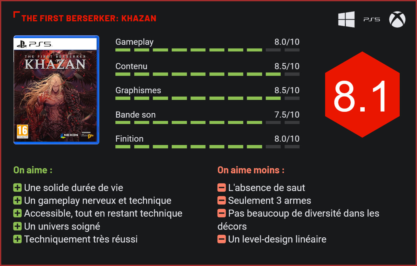 Développé par l’un des plus gros studios de développement coréen, The First Berserker Khazan est un spin-off de la franchise Dungeon & Fighter qui s’inspire assez ouvertement de God of War et des Souls-likes. Le jeu était parvenu à faire le buzz lors de sa première présentation avec ses jolis graphismes en cell-shading et ses scènes extrêmement violentes. Il faut bien l’admettre pourtant, le titre sortait un peu de nulle part pour nous, consommateurs européens. La licence Dungeon & Fighter n’est en effet pas très connue sous nos latitudes, mais elle dispose d’une solide fanbase, principalement en Asie, où elle fédère plus de 850 millions de joueurs. Par essence, Khazan est un jeu qui s’adresse donc plutôt à une audience asiatique, mais pas que puisque contrairement aux autres titres de la licence, il s’agit d’un jeu d’aventure en solo, au modèle économique très différent des autres productions du studio, et qui peut donc potentiellement séduire une audience occidentale. La direction artistique du jeu est superbe. Rassurez-vous si vous n’avez jamais touché à Dungeon & Fighter, il n’est pas nécessaire d’avoir joué à un jeu de la série pour comprendre le contexte ou suivre l’histoire de ce jeu. Khazan est un spin-off stand-alone qui bénéficie d’une narration soignée. On apprend ainsi au début de l’histoire que Khazan, le personnage, et héros de la guerre qui ravagé le monde, a été trahi par les siens, capturé, emprisonné et torturé. Exilé à l’autre bout du monde, il doit son salut à un spectre qui prend son contrôle et lui confère des pouvoirs, il devient ainsi le premier berserker. Assoiffé de vengeance, il se lance dans une quête pour retrouver ceux qui l’ont trahi. Les combats vous feront affronter des créatures gigantesques. Pad en main, on est face à un mélange de souls-like et de beat them all brutal à la God of War. Le gameplay se rapproche beaucoup d’un GOW, avec une touche tactique qui rappelle les souls-likes. Quelques coups suffisent pour être mis au tapis. La grande différence avec les souls-likes, c’est qu’il y a un mode facile qui permet aux néophytes de s’amuser sans devoir recommencer 40 fois une section. Accessible tout en restant élitiste, le jeu gère parfaitement la difficulté. Certes, on pourra lui reprocher une progression globalement très linéaire, l’absence de saut (les développeurs gèrent la verticalité par des chutes de Khazan, ce qui fait un peu amateur mais on s’y habitue), et on dénombre trois armes différentes seulement. Mais globalement, c’est un jeu très plaisant à parcourir. Le loot est généreux entre les coffres à découvrir, les accessoires à récupérer sur les ennemis morts au combat, vous ne cesserez d’améliorer votre équipement au cours de l’aventure. Les combats sont techniques et très intenses, les boss ont des patterns complexes et sont vraiment plaisants à affronter, en plus d’être très impressionnants. Et le bestiaire surprend également par sa diversité. Vous pourrez transformer l’expérience acquise en compétences et gagnerez aussi des niveaux. Le système de progression du personnage est lui très classique. Tout le jeu repose sur l’expérience acquise, présentée ici sous la forme de Lacrima, récupérée sur les cadavres des ennemis. Vous pourrez échanger cette Lacrima contre un gain de niveau qui vous permettra de booster vos stats. A cela s’ajoutent des compétences à débloquer. Le petit plus, comme dans un Dark Souls, la Lacrima peut être perdue si vous enchainez les défaites. A chaque mort, elle vous attendra non lieu de l’endroit où vous êtes décédé, vous devrez rejouer le segment parcouru précédemment pour la récupérer. Si vous décédez en cours de route, tout est perdu… Sauf le gain de niveau bien sûr. Les lieux d’upgrade représentent également les points de sauvegarde. Et il faut bien l’avouer, ça fonctionne plutôt bien. Le jeu sait se montrer sanglant. Globalement, Khazan est donc un beat them all très classique, qui tire son épingle du jeu de par son univers mature et violent, son gameplay technique et nerveux et sa patte graphique unique. Extrêmement stylisé, le jeu tire parfaitement parti du style cell-shading, qui reproduit parfaitement le design animé. Les textures sont superbes, les environnements extrêmement détaillés, les modèles 3D saisissants de réalisme. C’est une vraie claque pour un jeu en cell-shading. Alors oui, on aurait aimé des sauts, plus d’armes et peut-être des décors un peu plus variés, moins “gris”. Mais globalement, le contrat est largement rempli et ce premier volet des aventures de Khazan est une brillante réussite. Comptez entre 30 et 40 heures pour voir le bout d’une aventure captivante du début à la fin. Conclusion Spin-off de la série Dungeon & Fighter, The First Berserker: Khazan est une vraie bonne surprise pour les amateurs de jeux d’aventure. Quelque part à mi-chemin entre un Dark Souls pour la technicité de ses combats et un God of War pour sa violence, son accessibilité et sa nervosité, Khazan reste malheureusement un peu trop classique dans sa construction. On déplore quelques gros oublis – l’absence de saut surprend vraiment, on dénombre seulement 3 armes et les décors ne varient pas énormément -, mais le jeu n’en reste pas moins plaisant, très plaisant même avec ses boss titanesques, ses combats nerveux, sa mise en scène soignée et son univers très sombre. L’une des meilleures surprises de ce début d’année 2025.