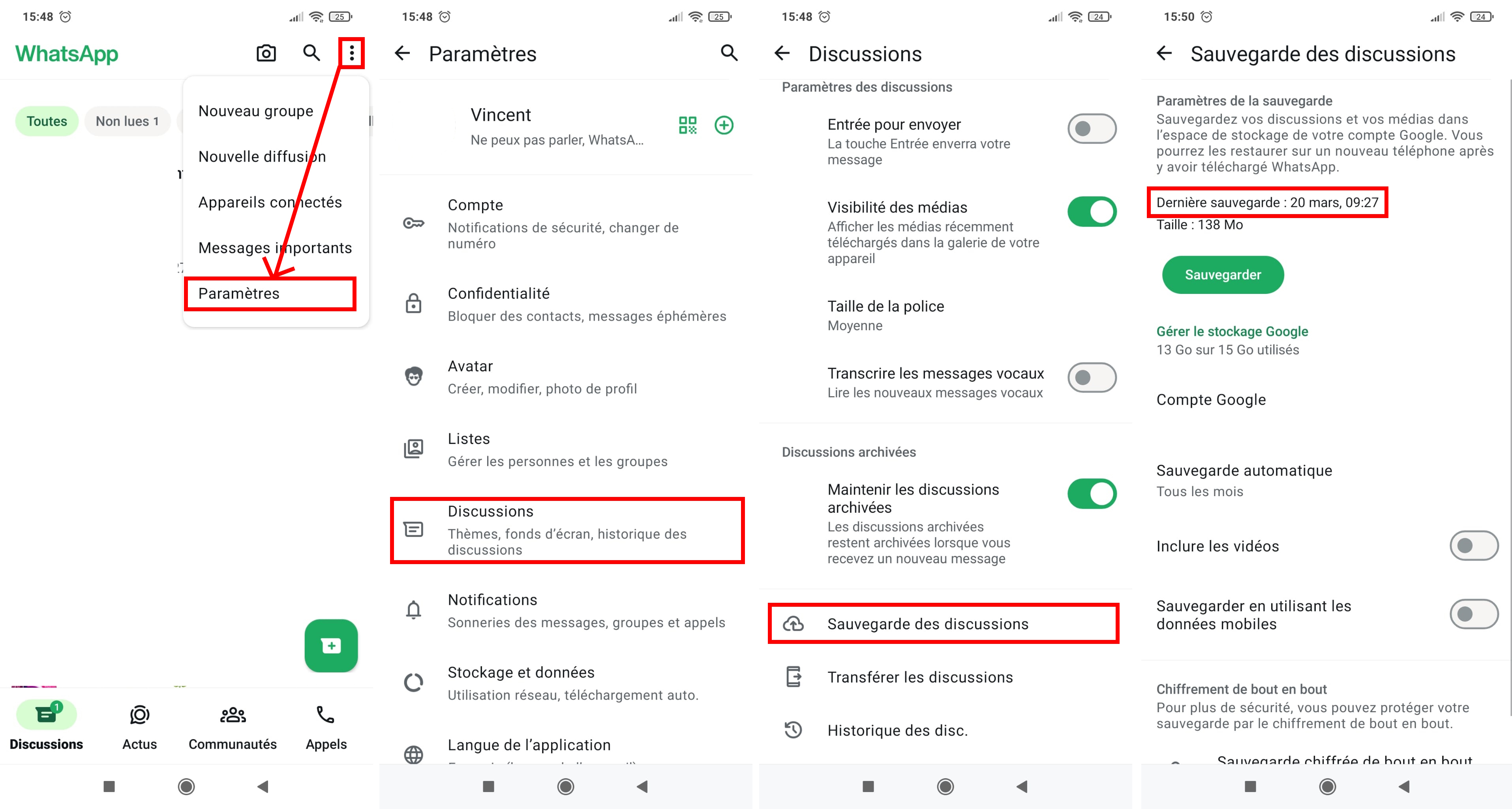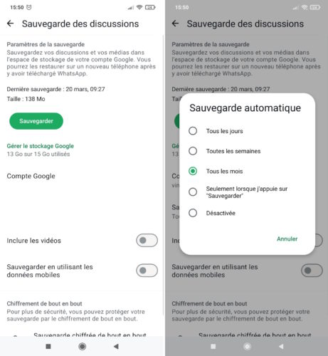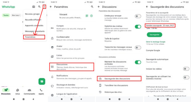 Pour une raison ou une autre, il arrive que l’on supprime un ou plusieurs messages de ses conversations WhatsApp. Plus tard, on regrette notre geste. Pas de panique, il reste encore une chance de le ou les récupérer. On vous explique comment. Pour supprimer un message d’une conversation WhatsApp, il faut le sélectionner, appuyer sur l’icône de la corbeille et valider le choix. Il est donc compliqué de supprimer un message par inadvertance… Sauf si celui-ci a été pris dans une sélection de plusieurs messages à effacer, ce qui peut comprendre les médias. Il peut donc arriver que l’on finisse par regretter la suppression pour une quelconque raison. Tout n’est pas perdu, grâce à la fonction de sauvegarde, il est possible de récupérer un ou plusieurs messages effacés. Étapes pour accéder aux paramètres de sauvegarde sur WhatsApp // Crédits : Geeko Comme vous pouvez le voir sur l’image ci-dessus, pour cela, il faut cliquer sur les trois points verticaux sur la page d’accueil des Discussions (sur Android) avant d’appuyer sur “Paramètres”. Pour la version iOS, il faut tapoter sur l’icône Réglages située en bas à droite. Ensuite, dans les deux cas, il faut cliquer sur “Discussions” puis “Sauvegarde des discussions” (Android) ou “Sauvegarde” (iOS). Vous verrez alors la date et l’heure de la dernière sauvegarde des données de l’application. Si votre message a été supprimé après ce repère temporel, alors il vous suffit de simplement désinstaller l’application et la réinstaller. Cela forcera la synchronisation et vous permettra de retrouver tous les messages tels qu’ils étaient présents à la date et l’heure en question. Modification de la fréquence de la sauvegarde automatique des messages WhatsApp // Crédits : Geeko Enfin, précisons que vous pouvez modifier la fréquence de la sauvegarde automatique. Vous avez le choix entre une sauvegarde quotidienne, hebdomadaire, mensuelle ou manuelle. Bien entendu, vous pouvez également la désactiver. Néanmoins, dans ce dernier cas, tout message supprimé ne pourra être récupéré.