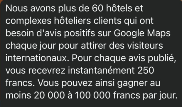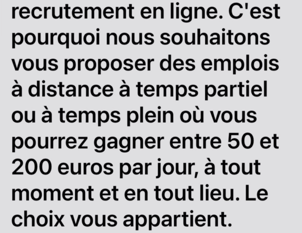 Une personne vous a contacté sur les réseaux sociaux en vous proposant un travail simple à effectuer ? Le tout en restant à la maison, sur votre téléphone ? Attention, il s’agit d’une arnaque qui prend de l’ampleur. Cette arnaque s’est particulièrement développée ces derniers temps sur les réseaux sociaux. L’arnaqueur peut entrer en contact avec sa victime via différents moyens de communication : WhatsApp, SMS, Messenger… Ensuite, il met en avant une proposition de travail. Dans la plupart des cas, il est question d’un travail très facile à effectuer, comme noter des lieux sur Google Maps, noter des produits en ligne, laisser des commentaires, etc. Il s’agit de l’arnaque dite “à la tâche”. La victime pense qu’elle peut gagner de l’argent en effectuant des tâches particulièrement simples à effectuer. Bien souvent, les arnaqueurs mettent en avant des salaires importants et des paiements instantanés. De plus, il suffirait seulement d’un téléphone et le télétravail serait la règle. Dans l’exemple ci-dessous, l’arnaqueur tente de faire croire à sa victime qu’elle peut gagner de l’argent en postant des avis positifs sur Google Maps “pour attirer des visiteurs internationaux”. Autre exemple avec ce message qui assure qu’il est possible de gagner “entre 50 et 200 euros par jour, à tout moment et en tout lieu”. Il est par ailleurs indiqué que ce message est l’aboutissement d’un long processus de recrutement. Bien entendu, ces propositions de tâches faciles à effectuer sont tout simplement des arnaques. Méfiez-vous des promesses de gains faciles tout en restant à la maison, sur votre téléphone ou votre ordinateur. Précisons que cette arnaque présente une particularité. En effet, dans certains cas, les arnaqueurs envoient réellement des petits virements à leurs victimes. L’objectif est de les mettre en confiance pour ensuite dérober leurs identifiants bancaires. Enfin, précisons que ces messages frauduleux présentent bien souvent l’indicatif +44, c’est-à-dire l’indicatif du Royaume-Uni. Les arnaqueurs tentent ainsi de faire croire que l’entreprise derrière la proposition d’emploi (frauduleuse) est prestigieuse.