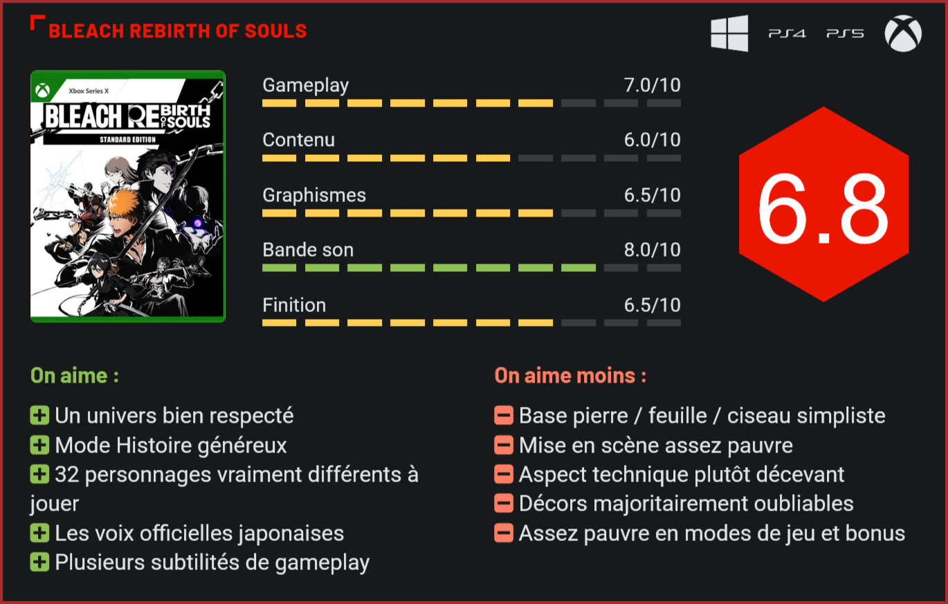 La licence Bleach revient en adaptation vidéoludique grâce à Bandai Namco qui a mandaté Tamsoft. Le titre vise à rassembler les fans de la licence et à attirer les nouveaux venus en misant notamment sur un imposant mode Histoire. Néanmoins, on sent bien que le studio japonais n’est pas spécialisé dans les jeux de combat, malgré de très bonnes intentions, et qu’il a dû faire avec des contraintes budgétaires. Apparu en 2001, le manga Bleach a su attirer l’attention. L’œuvre de Tite Kubo suit l’histoire d’Ichigo Kurosaki, un lycéen de 15 ans, dont la vie change après sa rencontre avec Rukia Kuchiki. Cette dernière est une shinigami envoyée sur Terre afin de le sauver lui, ainsi que sa famille, d’un hollow, un monstre animé par une âme torturée. Véritable succès, le manga a eu le droit à une adaptation en anime, en plus de plusieurs films d’animation et même d’un long-métrage en prises de vues réelles. Bien entendu, lorsqu’une licence attire les regards, les éditeurs de jeux vidéo ne sont pas loin pour créer des adaptations. Plusieurs jeux de combat ont donc vu le jour au fil des ans, en plus de quelques apparitions dans d’autres titres, dont Jump Force. Néanmoins, depuis 2011 et la sortie de Bleach: Soul Resurrección, la licence a été laissée de côté, seul Brave Souls (sorti sur smartphone) ayant permis de combler la dent creuse. Cette année, Bandai Namco Entertainment a donc décidé de remettre la licence sous le feu des projecteurs en confiant cette fois le projet à Tamsoft, studio japonais ayant notamment œuvré sur Captain Tsubasa: Rise of New Champions. Le gros morceau, c’est assurément le mode Histoire. Celui-ci est plutôt généreux puisqu’il couvre les 49 premiers tomes du manga. Une aubaine pour les néophytes qui vont pouvoir se plonger dans l’histoire, tout en découvrant l’éveil d’Ichigo et son évolution au sein de la Soul Society (une sorte de paradis) et du Hueco Mundo (le monde des morts). Les phases d’éveil sont vraiment très agréables à visionner Les fans, quant à eux, resteront un peu sur leur faim, connaissant déjà l’histoire et devant subir bon nombre de dialogues aux écrans plus ou moins figés pendant une bonne dizaine d’heures. Certains apprécieront le coup de nostalgie, d’autres préfèreront passer rapidement les scènes lorsque cela est possible. En effet, les développeurs ont mis du cœur à l’ouvrage en travaillant l’écriture pour copier le style de Tite Kubo et ils ont multiplié les saynètes pour retranscrire l’esprit de la licence. Malheureusement, on ressent vite un certain manque de moyens, la mise en scène étant trop minimaliste. Ce n’est pas l’aspect technique qui sauve les meubles. Si les cinématiques (un peu plus d’une cinquantaine) sont relativement réussies, les cut-scenes souffrent de soucis techniques plutôt gênants, à commencer par un certain aliasing. De manière générale, malgré de belles intentions, l’aspect technique pèche. En jeu, le résultat est très en dents de scie. Autant les personnages ont profité d’un véritable soin, que ce soit pour le design, la retranscription des animations (dont les faciales) et la retranscription de leurs attaques spéciales, autant les décors laissent clairement à désirer. Bien des textures sont à revoir, certaines modélisations sont sommaires et, là encore, l’aliasing peut s’avérer gênant, et ce, même sur les consoles dernièrement sorties. Cela c’est sans parler d’un flou d’arrière-plan qui met à mal les rétines. Les développeurs se rattrapent toutefois sur la partie sonore en offrant des thèmes rocks dynamiques et d’autres plutôt épiques. Les sons sont également très travaillés pour renforcer l’immersion en fonction de l’action et on apprécie de pouvoir profiter des voix japonaises officielles avec les sous-titres français. On observe un joli travail sur les expressions faciales Du côté des modes de jeu, les développeurs ont fait le minimum. Outre le mode Histoire qui vaut malgré tout le coup, avec quelques opportunités d’y passer des minutes supplémentaires en essayant de remplir des objectifs optionnels, on retrouve un tutorial pour les actions de base et les actions avancées, du versus, un mode Mission (un enchaînement de combats façon mode survie) et des combats en ligne avec un simple matchmaking, plutôt stable dans l’ensemble ceci dit, et quelques options de paramétrage. Pour tenter d’accroitre la rétention du joueur, Tamsoft a mis en place un système de gain de cristaux et talismans à équiper pour attacher des compétences passives à nos personnages. De quoi obtenir un petit avantage, en sachant qu’en remplissant les objectifs et en participant aux Missions, on débloque des ressources visant à les améliorer. Nous passons rapidement sur les bonus qui consistent à revoir les cinématiques, écouter la bande-son ou parcourir le glossaire pour en apprendre plus (ou se rafraîchir la mémoire). Vient alors le point crucial d’un jeu de combat, à savoir son gameplay. Clairement, si le tutorial proposé au lancement permet d’assimiler les principes de base, il faut jouer au mode Histoire et/ou passer par le tutorial avancé pour assimiler quelques subtilités du gameplay. De prime abord, il faut bien avouer qu’il y a eu une certaine déception. Les déplacements sont assez mous et les combats reposent sur le fameux système pierre / papier / ciseau. Par rapport à d’autres jeux de combat, ici les affrontements se déroulent en un seul round. Néanmoins, chacun des combattants dispose de plusieurs barres d’âme qu’il faut détruire. Pour cela, il faut placer un Kikon (pouvant détruire plusieurs barres d’âme en même temps) quand la barre des fils spirituels de l’adversaire passe sous la barre des 20%. Sinon, la réduire à 0 permet d’éliminer une âme. À cela, il faut ajouter un système de renverseme