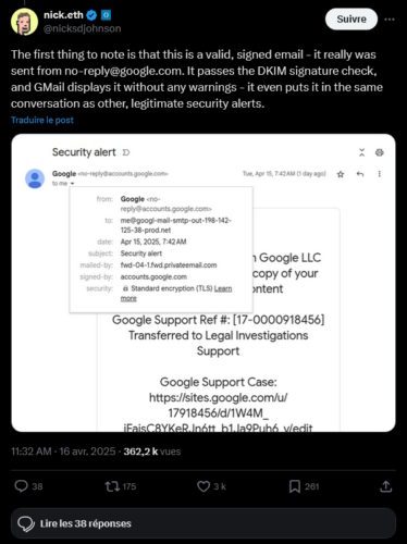 Une arnaque extrêmement sophistiquée vise les utilisateurs de Gmail. Cette dernière exploite une vulnérabilité de Google pour transmettre des emails de sécurité légitimes qui cachent un lien renvoyant vers un site frauduleux. Votre vigilance est plus que jamais de mise. Pour piéger leurs victimes potentielles, les arnaqueurs tentent de copier le plus possible les codes de certaines entreprises. En jouant sur l’urgence et un affichage qui peut paraître rassurant de prime abord, ils espèrent réussir à tromper la vigilance. Dans le cas mis en avant par le développeur Nick Johnson sur le réseau social X, l’arnaque dont il a failli être victime est encore plus sophistiquée. En effet, celle-ci utilise une faille dans l’infrastructure de Google. La différence, c’est que l’utilisateur reçoit un email provenant de “no-reply@accounts.google.com”. C’est une adresse légitime, avec une signature numérique valide. Comme on peut le voir sur l’image ci-dessous, les détails montrent bien un email validé et signé par Google. Gmail l’affiche donc sans aucun avertissement de sécurité. Ce qui est encore plus vicieux, c’est qu’il est ajouté dans le même fil de conversation que les autres alertes de sécurité légitimes. Exemple de l’email légitime au message frauduleux reçu sur Gmail // Crédits : Nick Johnson sur X.com De fait, la victime, rassurée sur la provenance de l’email, va s’intéresser au contenu. Dans le cas présent, c’est un avis qui a pour but d’alerter qu’une assignation à comparaître a été émise afin de récupérer des informations auprès de Google. L’utilisateur est donc invité à se rendre sur un lien lié à “sites.google.com” afin d’interagir. C’est là que le piège se referme. L’URL, bien qu’elle semble légitime, est effectivement frauduleuse. La bonne adresse renverrait sur “accounts.google.com”. Ce détail est primordial puisqu’il est le seul indice qui permet de repérer l’arnaque. Bien entendu, il est fortement déconseillé de cliquer sur le lien. Sinon, vous serez redirigé vers une page visant à récupérer vos données sensibles. Potentiellement, en récupérant vos données d’accès à votre compte Google, le pirate pourrait vous le subtiliser. Afin de se prémunir contre cette arnaque sophistiquée, il est fortement conseillé d’utiliser un passkey. Les informations nécessaires pour le créer et l’utiliser sont données sur cette page du support de Google. L’authentification avec un mot de passe est forcément à proscrire. De même, l’authentification à deux facteurs (2FA) n’est pas recommandée. Les pirates pourraient utiliser les informations dérobées pour intercepter les codes 2FA. Il leur suffit de provoquer une tentative de connexion et de vous amener à renseigner le code d’authentification reçu sur une page frauduleuse.