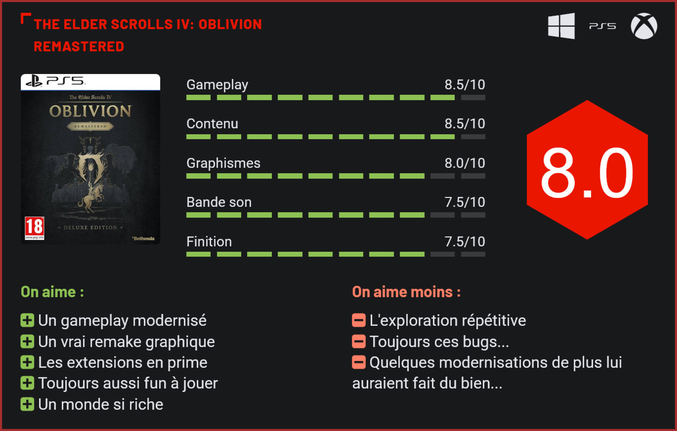 Sorti initialement en 2006, Oblivion avait marqué son époque avec son ambition démesurée, son monde vivant et sa liberté d’action presque totale. Près de deux décennies plus tard, le studio Virtuos nous livre un “remaster” très généreux avec des graphismes modernisés, des mécaniques affinées et du contenu inédit. Mais un tel classique peut-il encore briller face aux triple-A actuels ? Oblivion, à son époque, était une révolution : un monde ouvert d’une échelle inédite, des quêtes riches et une liberté d’exploration qui ont redéfini le genre. Si les fans rêvaient sans doute davantage d’un remake de l’excellent troisième volet Morrowind, qui aurait effectivement eu plus besoin d’une remise au goût du jour qu’Oblivion, il faut bien admettre que voir débarquer cette version remise au goût du jour d’Oblivion a tout de même réjoui toute une communauté. Cette remasterisation, confiée à Virtuos, a eu droit à une sortie-surprise, pour le plus grand bonheur des fans. Si vous aviez joué à l’original, ne vous attendez donc pas à une révolution. Ce “remaster” n’est certes pas qu’un simple remaster, mais il conserve l’essence de l’original en ce compris les bugs et l’IA défaillante, qui faisait aussi tout son charme à l’époque. L’aventure débute dans les prisons impériales, dans la peau d’un prisonnier anonyme, libéré par un coup du destin alors que l’empereur Uriel Septim VII est assassiné sous vos yeux. Votre mission. Vous vous retrouvez alors dans une situation inattendue avec la mission d’empêcher l’invasion des Portes d’Oblivion, des portails infernaux déversant des hordes de Daedra sur Cyrodiil. Ce récit épique, mêlant héroïsme, trahison et mystères cosmiques, conserve toute sa puissance grâce à une écriture soignée et des quêtes secondaires parmi les plus mémorables du genre. L’univers de Cyrodiil, avec ses forêts luxuriantes, ses montagnes escarpées et ses cités médiévales, n’a rien perdu de ses charmes : les textures ont été entièrement retravaillées, les effets de lumière dynamiques subliment les couchers de soleil, et les modèles de personnages, bien que toujours un peu raides, bénéficient d’un lifting convaincant. Un gros travail a été accompli au niveau des effets visuels Les Portes d’Oblivion par exemple, avec leurs teintes rougeoyantes et leurs architectures cauchemardesques, n’ont jamais été aussi oppressantes. La narration est enrichie par des cinématiques légèrement remaniées, qui conservent le style théâtral de l’original tout en gagnant en fluidité. Les graphismes exploitent les capacités des consoles actuelles avec des textures 4K, un éclairage volumétrique et une distance d’affichage impressionnante. Les forêts de Cyrodiil vibrent de vie, les donjons regorgent de détails, et les animations faciales, bien que perfectibles, évitent l’effet “poupée de cire” de l’original. Globalement, le jeu est donc plus beau qu’à l’époque, beaucoup plus joli même puisqu’il tourne sous l’Unreal Engine 5. Il ne faut toutefois pas s’attendre à une claque monumentale. Même Bethesda n’a pas opté pour le terme “remake” et ce n’est pas sans raison. Outre l’aspect technique, le gameplay a également subi une jolie modernisation. Logique puisque le titre a tout de même mal vieilli. Les animations ont été retravaillées, l’IA aussi, et plusieurs nouveaux mouvements sont au programme comme le sprint qui n’était pas dans l’original ou un système de parade inspiré de Skyrim. Le résultat est probant : trancher un bandit ou lancer une boule de feu est plus satisfaisant, et les combats gagnent en dynamisme grâce à des hitboxes affinées et des effets visuels spectaculaires. La furtivité, bien que toujours simpliste, bénéficie d’indicateurs visuels clairs, rendant les assassinats plus accessibles. Alors oui, il y a toujours des limites : l’IA a évolué mais finalement pas tant que ça. Il ne sera pas rare de croiser un garde impérial qui s’adressera à vous en vous menaçant d’une arrestation si vous ne payez pas une amende pour lui avoir tiré une flèche entre les deux yeux… Des comportements déroutants, comme dans l’original, qui donnent néanmoins un charme rétro au jeu. L’interface, surchargée comme dans l’original, reste également pénible à utiliser dans l’ensemble. On aurait aimé que Virtuos aille beaucoup plus loin dans la modernisation à ce niveau. Pour le reste, le jeu a toujours autant de charme qu’à l’époque avec son système de progression basé sur les compétences, sa montée en niveau organique qui récompense l’utilisation répétée des talents, la liberté dans la création de son personnage, ses quêtes secondaires, nombreuses, passionnantes et parfois drôles… On est là face à un jeu d’une richesse étonnante. Certes moins sophistiqué qu’un Witcher dans sa narration, mais qui n’en a pas moins beaucoup de charme. Notez toutefois que même s’il a été modernisé, Oblivion Remastered reste un jeu “vieillot” de par son open world d’un autre temps. Les trajets sont parfois longs et peu encourageants. Une grosse partie du gameplay repose sur la lecture de notes et l’exploration, des mécanismes d’un autre âge. Les donjons, bien que nombreux, se ressemblent malheureusement un peu trop, avec des couloirs répétitifs et des pièges prévisibles. Comparé à Elden Ring, qui excelle dans la variété de ses environnements, Oblivion peut sembler linéaire dans ses structures. On regrette aussi certains choix des développeurs comme le level scaling, qui ajuste le niveau de difficulté des ennemis à votre niveau. Clairement, on aurait pu faire sans. Ajoutez à cela de nombreux bugs comme des collisions hasardeuses, des PNJ bloqués ou des quêtes irréalisables, et vous comprendrez une certaine frustration. Oui, tout cela fait presque partie